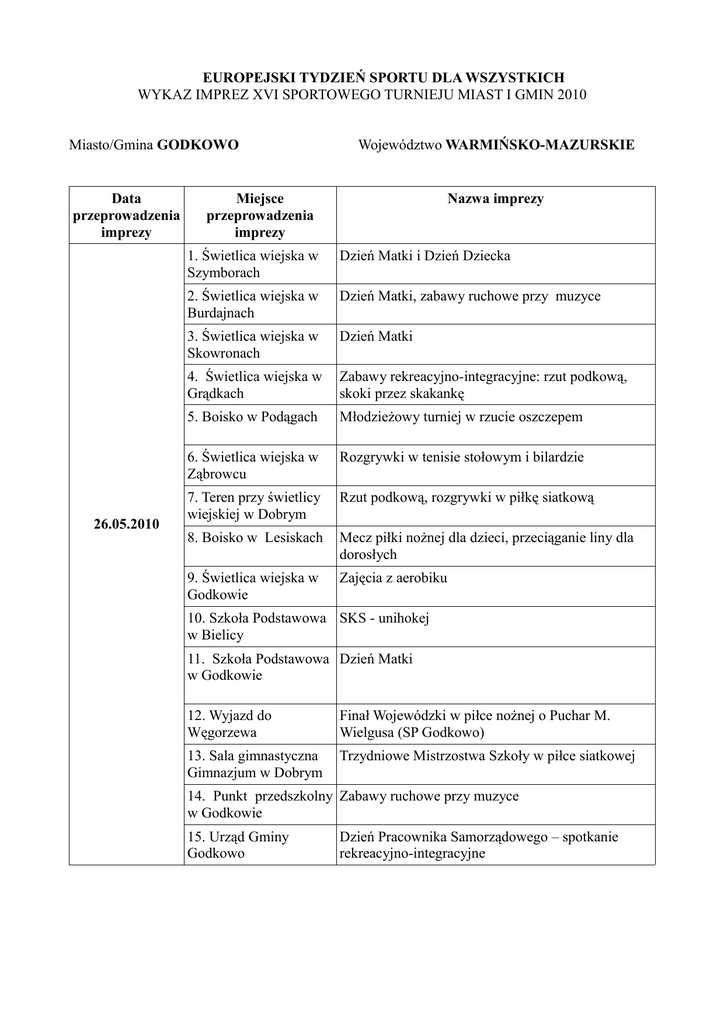 EUROPEJSKI TYDZIEŃ SPORTU DLA WSZYSTKICH WYKAZ IMPREZ XVI SPORTOWEGO TURNIEJU MIAST I GMIN 2010 Miasto/Gmina GODKOWO Data przeprowadzenia imprezy 26.05.2010 Województwo WARMIŃSKO-MAZURSKIE Miejsce przeprowadzenia imprezy Nazwa imprezy 1. Świetlica wiejska w Szymborach Dzień Matki i Dzień Dziecka 2. Świetlica wiejska w Burdajnach Dzień Matki, zabawy ruchowe przy muzyce 3. Świetlica wiejska w Skowronach Dzień Matki 4. Świetlica wiejska w Grądkach Zabawy rekreacyjno-integracyjne: rzut podkową, skoki przez skakankę 5. Boisko w Podągach Młodzieżowy turniej w rzucie oszczepem 6. Świetlica wiejska w Ząbrowcu Rozgrywki w tenisie stołowym i bilardzie 7. Teren przy świetlicy wiejskiej w Dobrym Rzut podkową, rozgrywki w piłkę siatkową 8. Boisko w Lesiskach Mecz piłki nożnej dla dzieci, przeciąganie liny dla dorosłych 9. Świetlica wiejska w Godkowie Zajęcia z aerobiku 10. Szkoła Podstawowa SKS - unihokej w Bielicy 11. Szkoła Podstawowa Dzień Matki w Godkowie 12. Wyjazd do Węgorzewa Finał Wojewódzki w piłce nożnej o Puchar M. Wielgusa (SP Godkowo) 13. Sala gimnastyczna Gimnazjum w Dobrym Trzydniowe Mistrzostwa Szkoły w piłce siatkowej 14. Punkt przedszkolny Zabawy ruchowe przy muzyce w Godkowie 15. Urząd Gminy Godkowo Dzień Pracownika Samorządowego – spotkanie rekreacyjno-integracyjne 27.05.2010 1. Świetlica wiejska w Szymborach Turniej warcabowo-szachowy 2. Świetlica wiejska w Burdajnach Gry sportowo-rekreacyjne: piłkarzyki, tenis, szachy 3. Świetlica wiejska w Skowronach Turniej warcabowo-szachowy dziewczęta-chłopcy 4. Boisko w Grądkach Mecz piłki siatkowej 5. Świetlica wiejska w Podągach Turniej tenisa stołowego dziewczęta-chłopcy, zabawy ruchowe przy muzyce 6. Świetlica wiejska, boisko w Ząbrowcu Rozgrywki w bilarda, Mecz w piłkę siatkową 7. Teren przy świetlicy wiejskiej w Dobrym Unihokej na świeżym powietrzu, mecz piłki nożnej, zabawy ruchowe przy muzyce 8. Świetlica wiejska w Lesiskach Turniej tenisa stołowego 9. Boisko w Godkowie Młodzieżowe rozgrywki w piłkę nożną i siatkową 10. Szkoła Podstawowa Trening piłki nożnej drużyny młodzików Klubu w Bielicy Żuraw 11. Wyjazd do Młynar Mistrzostwa Powiatowe kl. I-III w piłce nożnej (SP Godkowo) 12. Szkoła Podstawowa Zajęcia sportowe SKS, gimnastyka korekcyjna kl. III w Godkowie 28.05.2010 13. Sala Gimnastyczna SP Godkowo Trening piłki nożnej drużyny młodzików Klubu Żuraw 14. Boisko Gminne w Godkowie Trening w piłkę nożną drużyny seniorów Klubu Żuraw 15. Sala gimnastyczna Gimnazjum w Dobrym Trzydniowe Mistrzostwa Szkoły w piłce siatkowej 16. Punkt przedszkolny w Godkowie Zajęcia koordynacyjno-ruchowe 1. Świetlica wiejska w Burdajnach Turniej gier planszowych oraz w piłkarzyki 2. Świetlica wiejska w Skowronach Turniej tenisa stołowego 3. Świetlica wiejska w Grądkach Turniej tenisa stołowego 4. Okolice Podąg Zabawa w podchody 6. Świetlica wiejska w Turniej w tenisa stołowego i bilarda Ząbrowcu 7. Świetlica wiejska w Dobrym Konkurs – biegi w workach, rywalizacja w grach planszowych 8. Świetlica wiejska w Lesiskach Turniej warcabowy 9. Świetlica wiejska w Godkowie Turniej tenisa stołowego 10. Szkoła Podstawowa Gry i zabawy ruchowe przy muzyce w Bielicy 11. Szkoła Podstawowa Zajęcia sportowe SKS w Godkowie 12. Sala gimnastyczna Trzydniowe Mistrzostwa Szkoły w piłce siatkowej Gimnazjum w Dobrym 1. Boisko w Szymborach Mecz piłki nożnej 2. Świetlica wiejska w Burdajnach Rozgrywki szachowe 3. Rajd na trasie Rajd rowerowy Skowrony-GrądkiSkowrony 29.05.2010 4. Boisko gminne w Mecz piłki nożnej Żuraw Godkowo- Relax Płoskinia Godkowie 5. Świetlica wiejska w Dzień Matki i Dzień Dziecka Grądkach 6. Świetlica wiejska w Dzień Matki i Dzień Dziecka Godkowie 7. Świetlica wiejska w Ząbrowcu Dzień Matki i Dzień Dziecka 8. Rajd na trasie Podągi- Rajd rowerowy Olkowo-Podągi 9. Teren przy świetlicy wiejskiej w Dobrym, okolice miejscowości Biegi na 100 m, przejażdżka rowerowa po okolicy 10. Okolice wsi Lesiska Biegi przełajowe 30.05.2010 11. Wyjazd do Elbląga Puchar Bałtyku w unihokeju 1. Wyjazd do Elbląga Puchar Bałtyku w unihokeju 2. Boisko w Szymborach Gra w zbijaka 3. Boisko w Ząbrowcu Rozgrywki w piłkę siatkową 4. Boisko w Burdajnach Mecz piłki nożnej 5. Lesiska-PodągiLesiska Przejażdżka rowerowa 1. Boisko w Szymborach Zakończenie majówki – zabawy ruchowe i śpiew przy ognisku 2. Świetlica wiejska w Rozgrywki w tenisa stołowego, piłkarzyki, zabawy Burdajnach ruchowe przy muzyce 3. Boisko w Skowronach Gry i zabawy rekreacyjne: badminton, rzut piłką do celu, skoki na skakance 4. Świetlica wiejska w Grądkach Zabawa kalambury 5. Świetlica wiejska w Zajęcia z aerobkiu Godkowie 31.05.2010 6. Boisko i Świetlica wiejska w Ząbrowcu Mecz piłki siatkowej, rozgrywki w bilarda, zabawy ruchowe przy muzyce 7. Boisko w Podągach Mecz piłki nożnej młodzieży gimnazjalnej 8. Szkoła Podstawowa w Godkowie Gimnastyka korekcyjna klas I-II, zajęcia sportowe SKS 9. Sala Gimnastyczna Trening sekcji badmintona SP Godkowo 10. Szkoła Podstawowa SKS – unihokej, gimnastyka korekcyjna kl. II-III w Bielicy 11. Punkt przedszkolny Spacer w grupie na świeżym powietrzu w Godkowie 12. Boisko w Lesiskach Mecz piłki siatkowej 13. Teren przy świetlicy Gra w dwa ognie w Dobrym 1. Szkoła Podstawowa w Godkowie 01.06.2010 Dzień Dziecka, zajęcia sportowe SKS 2. Sala gimnastyczna SP Trening w piłkę nożną drużyny młodzików Klubu Godkowo lub boisko Żuraw 3. Boisko Gminne w Trening w piłkę nożną drużyny seniorów Klubu Godkowie Żuraw 4. Szkoła Podstawowa w Bielicy Festyn Rodzinny 5. Punkt przedszkolny w Festyn Rodzinny Godkowie 6. Świetlica wiejska w Zabawy ruchowe przy muzyce, rozgrywki w tenisie Szymborach stołowym 7. Świetlica wiejska w Dzień Dziecka Burdajnach 8. Boisko w Skowronach Dzień Dziecka 9. Świetlica wiejska w Grądkach Rywalizacja dzieci w jedzeniu jogurtu, skokach w workach 10. Świetlica 