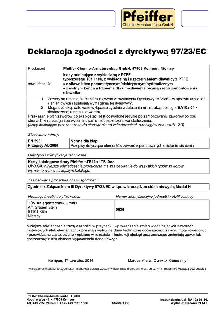 Deklaracja zgodności z dyrektywą 97/23/EC