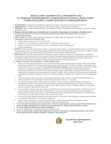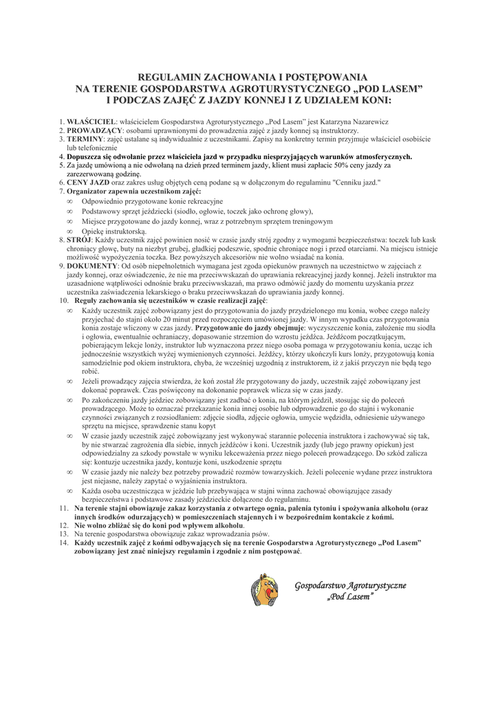 REGULAMIN ZACHOWANIA I POSTĘPOWANIA NA TERENIE GOSPODARSTWA AGROTURYSTYCZNEGO „POD LASEM” I PODCZAS ZAJĘĆ Z JAZDY KONNEJ I Z UDZIAŁEM KONI: 1. WŁAŚCICIEL: właścicielem Gospodarstwa Agroturystycznego „Pod Lasem” jest Katarzyna Nazarewicz 2. PROWADZĄCY: osobami uprawnionymi do prowadzenia zajęć z jazdy konnej są instruktorzy. 3. TERMINY: zajęć ustalane są indywidualnie z uczestnikami. Zapisy na konkretny termin przyjmuje właściciel osobiście lub telefonicznie 4. Dopuszcza się odwołanie przez właściciela jazd w przypadku niesprzyjających warunków atmosferycznych. 5. Za jazdę umówioną a nie odwołaną na dzień przed terminem jazdy, klient musi zapłacic 50% ceny jazdy za zarezerwowaną godzinę. 6. CENY JAZD oraz zakres usług objętych ceną podane są w dołączonym do regulaminu "Cenniku jazd." 7. Organizator zapewnia uczestnikom zajęć: • Odpowiednio przygotowane konie rekreacyjne • Podstawowy sprzęt jeździecki (siodło, ogłowie, toczek jako ochronę głowy), • Miejsce przygotowane do jazdy konnej, wraz z potrzebnym sprzętem treningowym • Opiekę instruktorską. 8. STRÓJ: Każdy uczestnik zajęć powinien nosić w czasie jazdy strój zgodny z wymogami bezpieczeństwa: toczek lub kask chroniący głowę, buty na niezbyt grubej, gładkiej podeszwie, spodnie chroniące nogi i przed otarciami. Na miejscu istnieje możliwość wypożyczenia toczka. Bez powyższych akcesoriów nie wolno wsiadać na konia. 9. DOKUMENTY: Od osób niepełnoletnich wymagana jest zgoda opiekunów prawnych na uczestnictwo w zajęciach z jazdy konnej, oraz oświadczenie, że nie ma przeciwwskazań do uprawiania rekreacyjnej jazdy konnej. Jeżeli instruktor ma uzasadnione wątpliwości odnośnie braku przeciwwskazań, ma prawo odmówić jazdy do momentu uzyskania przez uczestnika zaświadczenia lekarskiego o braku przeciwwskazań do uprawiania jazdy konnej. 10. Reguły zachowania się uczestników w czasie realizacji zajęć: • Każdy uczestnik zajęć zobowiązany jest do przygotowania do jazdy przydzielonego mu konia, wobec czego należy przyjechać do stajni około 20 minut przed rozpoczęciem umówionej jazdy. W innym wypadku czas przygotowania konia zostaje wliczony w czas jazdy. Przygotowanie do jazdy obejmuje: wyczyszczenie konia, założenie mu siodła i ogłowia, ewentualnie ochraniaczy, dopasowanie strzemion do wzrostu jeźdźca. Jeźdźcom początkującym, pobierającym lekcje lonży, instruktor lub wyznaczona przez niego osoba pomaga w przygotowaniu konia, ucząc ich jednocześnie wszystkich wyżej wymienionych czynności. Jeźdźcy, którzy ukończyli kurs lonży, przygotowują konia samodzielnie pod okiem instruktora, chyba, że wcześniej uzgodnią z instruktorem, iż z jakiś przyczyn nie będą tego robić. • Jeżeli prowadzący zajęcia stwierdza, że koń został źle przygotowany do jazdy, uczestnik zajęć zobowiązany jest dokonać poprawek. Czas poświęcony na dokonanie poprawek wlicza się w czas jazdy. • Po zakończeniu jazdy jeździec zobowiązany jest zadbać o konia, na którym jeździł, stosując się do poleceń prowadzącego. Może to oznaczać przekazanie konia innej osobie lub odprowadzenie go do stajni i wykonanie czynności związanych z rozsiodłaniem: zdjęcie siodła, zdjęcie ogłowia, umycie wędzidła, odniesienie używanego sprzętu na miejsce, sprawdzenie stanu kopyt • W czasie jazdy uczestnik zajęć zobowiązany jest wykonywać starannie polecenia instruktora i zachowywać się tak, by nie stwarzać zagrożenia dla siebie, innych jeźdźców i koni. Uczestnik jazdy (lub jego prawny opiekun) jest odpowiedzialny za szkody powstałe w wyniku lekceważenia przez niego poleceń prowadzącego. Do szkód zalicza się: kontuzje uczestnika jazdy, kontuzje koni, uszkodzenie sprzętu • W czasie jazdy nie należy bez potrzeby prowadzić rozmów towarzyskich. Jeżeli polecenie wydane przez instruktora jest niejasne, należy zapytać o wyjaśnienia instruktora. • Każda osoba uczestnicząca w jeździe lub przebywająca w stajni winna zachować obowiązujące zasady bezpieczeństwa i podstawowe zasady jeździeckie dołączone do regulaminu. 11. Na terenie stajni obowiązuje zakaz korzystania z otwartego ognia, palenia tytoniu i spożywania alkoholu (oraz innych środków odurzających) w pomieszczeniach stajennych i w bezpośrednim kontakcie z końmi. 12. Nie wolno zbliżać się do koni pod wpływem alkoholu. 13. Na terenie gospodarstwa obowiązuje zakaz wprowadzania psów. 14. Każdy uczestnik zajęć z końmi odbywających się na terenie Gospodarstwa Agroturystycznego „Pod Lasem” zobowiązany jest znać niniejszy regulamin i zgodnie z nim postępować. Gospodarstwo Agroturystyczne „Pod Lasem” Lasem”