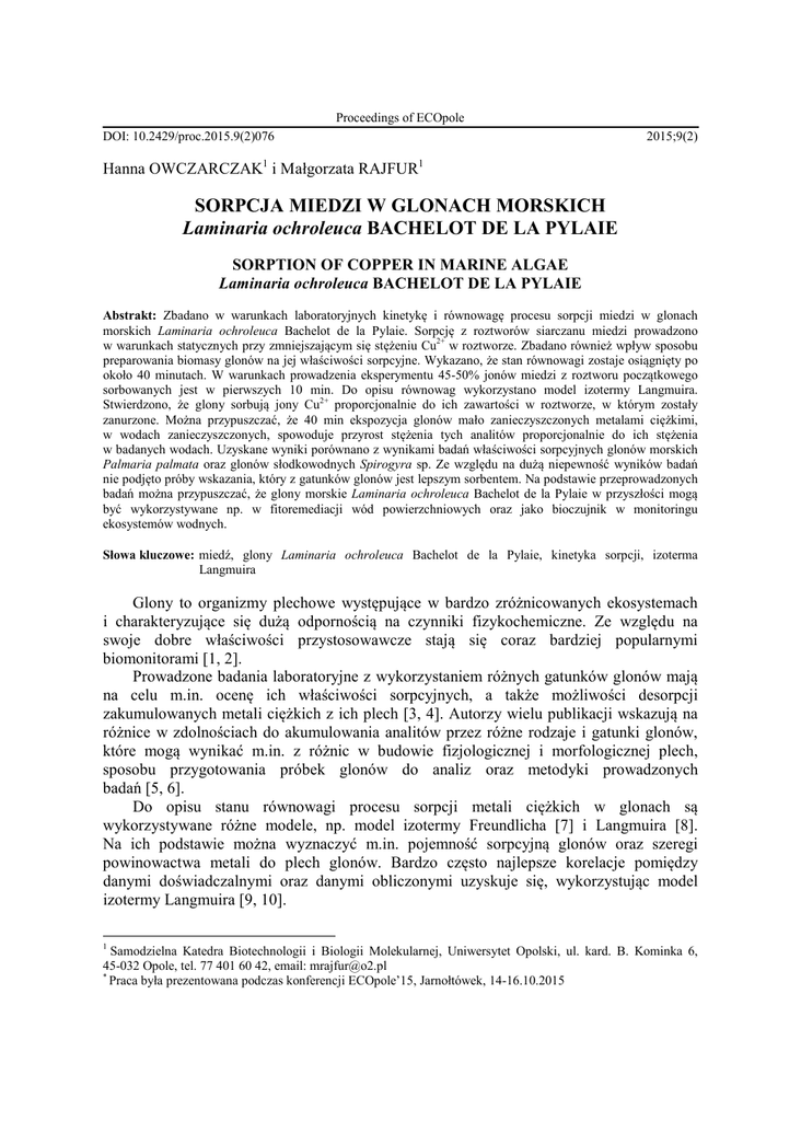 SORPCJA MIEDZI W GLONACH MORSKICH Laminaria ochroleuca