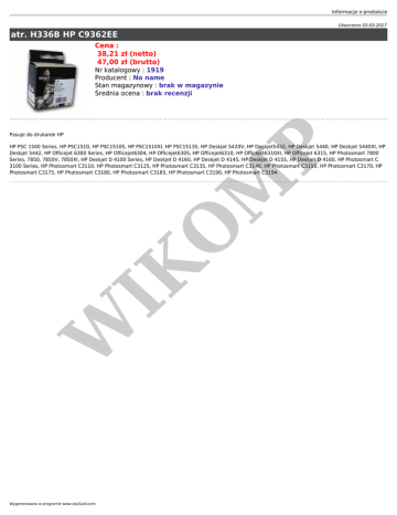 Informacje o produkcie Utworzono 03-03-2017 atr. H336B HP C9362EE Cena : 38,21 zł (netto) 47,00 zł (brutto) Nr katalogowy : 1919 Producent : No name Stan magazynowy : brak w magazynie Średnia ocena : brak recenzji Pasuje do drukarek HP W IK O M P HP PSC 1500 Series, HP PSC1510, HP PSC1510S, HP PSC1510XI, HP PSC1513S, HP Deskjet 5420V, HP Deskjet5432, HP Deskjet 5440, HP Deskjet 5440XI, HP Deskjet 5442, HP Officejet 6300 Series, HP Officejet6304, HP Officejet6305, HP Officejet6310, HP Officejet6310XI, HP Officejet 6315, HP Photosmart 7800 Series, 7850, 7850V, 7850XI, HP Deskjet D 4100 Series, HP Deskjet D 4160, HP Deskjet D 4145, HP Deskjet D 4155, HP Deskjet D 4160, HP Photosmart C 3100 Series, HP Photosmart C3110, HP Photosmart C3125, HP Photosmart C3135, HP Photosmart C3140, HP Photosmart C3150, HP Photosmart C3170, HP Photosmart C3175, HP Photosmart C3180, HP Photosmart C3185, HP Photosmart C3190, HP Photosmart C3194 Wygenerowano w programie www.oscGold.com