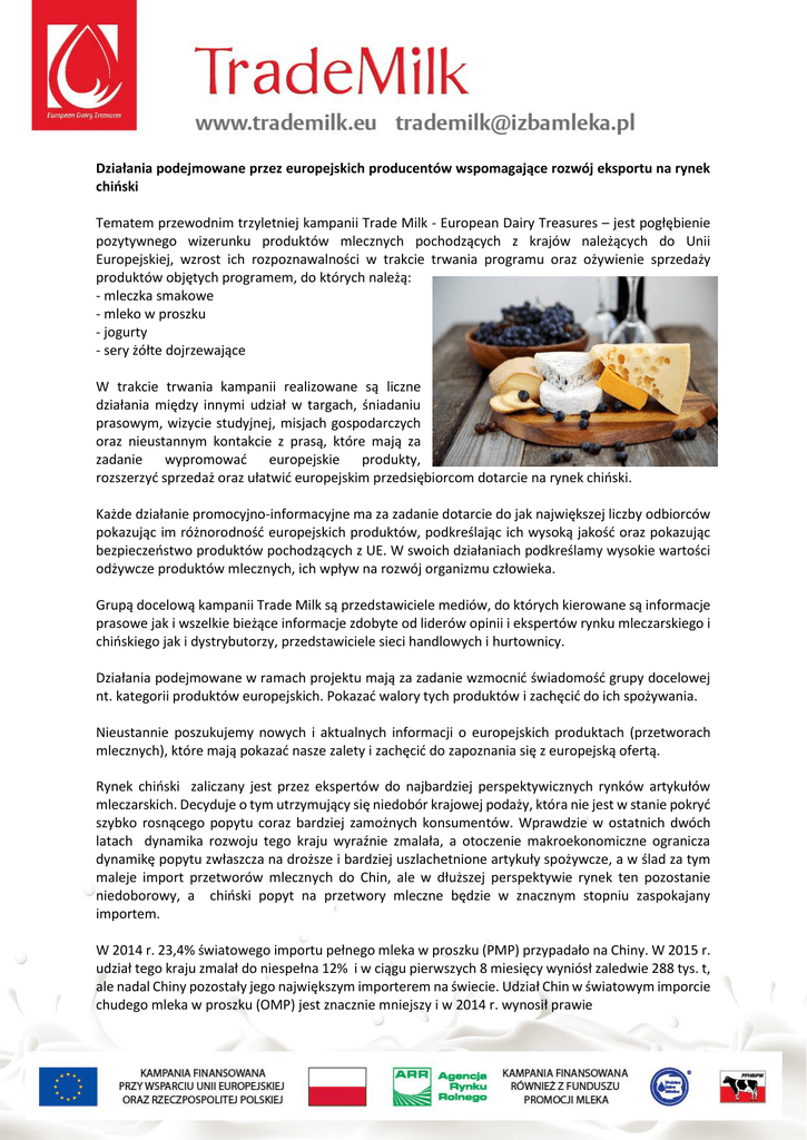 Działania podejmowane przez europejskich producentów wspomagające rozwój eksportu na rynek chiński Tematem przewodnim trzyletniej kampanii Trade Milk - European Dairy Treasures – jest pogłębienie pozytywnego wizerunku produktów mlecznych pochodzących z krajów należących do Unii Europejskiej, wzrost ich rozpoznawalności w trakcie trwania programu oraz ożywienie sprzedaży produktów objętych programem, do których należą: - mleczka smakowe - mleko w proszku - jogurty - sery żółte dojrzewające W trakcie trwania kampanii realizowane są liczne działania między innymi udział w targach, śniadaniu prasowym, wizycie studyjnej, misjach gospodarczych oraz nieustannym kontakcie z prasą, które mają za zadanie wypromować europejskie produkty, rozszerzyć sprzedaż oraz ułatwić europejskim przedsiębiorcom dotarcie na rynek chiński. Każde działanie promocyjno-informacyjne ma za zadanie dotarcie do jak największej liczby odbiorców pokazując im różnorodność europejskich produktów, podkreślając ich wysoką jakość oraz pokazując bezpieczeństwo produktów pochodzących z UE. W swoich działaniach podkreślamy wysokie wartości odżywcze produktów mlecznych, ich wpływ na rozwój organizmu człowieka. Grupą docelową kampanii Trade Milk są przedstawiciele mediów, do których kierowane są informacje prasowe jak i wszelkie bieżące informacje zdobyte od liderów opinii i ekspertów rynku mleczarskiego i chińskiego jak i dystrybutorzy, przedstawiciele sieci handlowych i hurtownicy. Działania podejmowane w ramach projektu mają za zadanie wzmocnić świadomość grupy docelowej nt. kategorii produktów europejskich. Pokazać walory tych produktów i zachęcić do ich spożywania. Nieustannie poszukujemy nowych i aktualnych informacji o europejskich produktach (przetworach mlecznych), które mają pokazać nasze zalety i zachęcić do zapoznania się z europejską ofertą. Rynek chiński zaliczany jest przez ekspertów do najbardziej perspektywicznych rynków artykułów mleczarskich. Decyduje o tym utrzymujący się niedobór krajowej podaży, która nie jest w stanie pokryć szybko rosnącego popytu coraz bardziej zamożnych konsumentów. Wprawdzie w ostatnich dwóch latach dynamika rozwoju tego kraju wyraźnie zmalała, a otoczenie makroekonomiczne ogranicza dynamikę popytu zwłaszcza na droższe i bardziej uszlachetnione artykuły spożywcze, a w ślad za tym maleje import przetworów mlecznych do Chin, ale w dłuższej perspektywie rynek ten pozostanie niedoborowy, a chiński popyt na przetwory mleczne będzie w znacznym stopniu zaspokajany importem. W 2014 r. 23,4% światowego importu pełnego mleka w proszku (PMP) przypadało na Chiny. W 2015 r. udział tego kraju zmalał do niespełna 12% i w ciągu pierwszych 8 miesięcy wyniósł zaledwie 288 tys. t, ale nadal Chiny pozostały jego największym importerem na świecie. Udział Chin w światowym imporcie chudego mleka w proszku (OMP) jest znacznie mniejszy i w 2014 r. wynosił prawie 10%, a w 2015 r. po 16% ograniczeniu wolumenu spadł do około 7,5%, ale i tak ten kraj pozostał największym importerem OMP na świecie. [źródło: dane FAO] Tab. 1 Import podstawowych przetworów mlecznych przez Chiny w latach 2004-2014 (tys. ton) Udział UE w 2014/ 2010 imporcie % 2012 ogółe Z UE 2010 2014 Produkt 2004 2010 2014 m PMP 80,1 324,7 402,4 670,0 206,4 64,1 4,7 1,4 Serwatka w proszku 178,0 264,6 378,39 404,7 153,0 166,5 36,9 40,4 OMP 55,4 88,5 167,8 252,6 456,0 516,8 14,7 26,7 Masło 12,4 23,5 48,3 52,3 342,9 248,7 6,6 4,8 Sery 7,2 22,9 38,8 66,0 287,7 309,5 9,4 10,1 Mleko płynne i śmietana 3,0 15,9 93,8 320,2 2015 2949 43,3 63,4 Jogurty 0,5 1,2 7,9 8,7 705,5 507,1 42,4 30,5 Lody 1,6 6,0 10,9 17,6 293,5 214,4 58,3 42,6 Ekwiwalent mleka surowego 2592 5477 7906 11371 207,6 215,6 18,4 19,1 Źródło: COMTRADE Wprawdzie Chiny nadal należą do krajów o najniższej konsumpcji mleka na świecie, ale spożycie to szybko rośnie w ostatnich latach . Według danych FAO konsumpcja mleka wraz z mlekiem zużytym do produkcji masła wyniosła niespełna 32 kg/mieszkańca ekwiwalentu mleka surowego i do 2014 r. wzrosła o ponad 20% do prawie 39 kg/mieszkańca. Spożycie to jest nadal około 3 krotnie mniejsze od przeciętnego spożycia na świecie. Szczególnie niska jest konsumpcja masła i serów (01-0,2 kg/mieszkańca rocznie), ale szybko rosnąca liczba ludności klasy średniej sprawia, że kraj ten rozwija również import serów i masła, choć jest on znacznie mniejszy i w 2014 r. wynosił odpowiednio 66,0 i 52,3 tys. t. [źródło: dane FAO] Oprócz mleka w proszku, masła i serów Chiny są także znaczącym importerem serwatki w proszku, której w 2014 r. zaimportowały ponad 400 tys. t. Importują także niewielkie ilości lodów, mleka płynnego i skondensowanego, a także jogurtów i śmietany. Całkowity import przetworów mlecznych wyrażony w ekwiwalencie mleka surowego wzrósł w latach 2010-2014 ponad 2-krotnie do prawie 11,4 mld kg. W 2015 r. import ten spadł, szczególnie wyraźnie w odniesieniu do pełnego mleka w proszku (w pierwszym półroczu 2015 r. spadek ten wyniósł 50%). Spadek importu chudego mleka w proszku był mniejszy (16%), ale i tak był znaczny. [źródło: dane COMTRADE] Unia jest liczącym się eksporterem na rynek chiński z około 18-19% udziałem w całkowitym wolumenie przywozu w latach 2011-2014. Z tego w imporcie serwatki i OMP udział ten wynosił w 2014 r. odpowiednio 40,4 i 26,7%, serów 10,1%, masła 4,8%, a pełnego mleka w proszku tylko 1,4%. Udział Unii Europejskiej w chińskim eksporcie produktów świeżych był znacznie większy i wahał się od 30,5% w przypadku jogurtów do 63,5% w przypadku mleka płynnego. Jeśli jednak uwzględnić potencjał eksportowy Unii Europejskiej udział ten mógłby być znacznie większy. [źródło: dane KE oraz COMTRADE] W unijnym eksporcie do Chin dominują: -w przypadku serów takie kraje jak Francja, Włochy, Dania