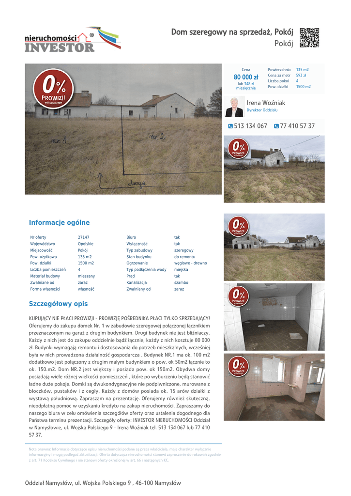 Dom szeregowy na sprzedaż, Pokój Pokój Cena 80 000 zł lub 348 zł miesięcznie Powierzchnia Cena za metr Liczba pokoi Pow. działki 135 m2 593 zł 4 1500 m2 Irena Woźniak Dyrektor Oddziału 513 134 067 Informacje ogólne Nr oferty 27147 Biuro tak Województwo Opolskie Wyłączność tak Miejscowość Pokój Typ zabudowy szeregowy Pow. użytkowa 135 m2 Stan budynku do remontu Pow. działki 1500 m2 Ogrzewanie węglowe - drewno Liczba pomieszczeń 4 Typ podłączenia wody miejska Materiał budowy mieszany Prąd tak Zwalniane od zaraz Kanalizacja szambo Forma własności własność Zwalniany od zaraz Szczegółowy opis KUPUJĄCY NIE PŁACI PROWIZJI - PROWIZJĘ POŚREDNIKA PŁACI TYLKO SPRZEDAJĄCY! Oferujemy do zakupu domek Nr. 1 w zabudowie szeregowej połączonej łącznikiem przeznaczonym na garaż z drugim budynkiem. Drugi budynek nie jest bliźniaczy. Każdy z nich jest do zakupu oddzielnie bądź łącznie, każdy z nich kosztuje 80 000 zł. Budynki wymagają remontu i dostosowania do potrzeb mieszkalnych, wcześniej była w nich prowadzona działalność gospodarcza . Budynek NR.1 ma ok. 100 m2 dodatkowo jest połączony z drugim małym budynkiem o pow. ok 50m2 łącznie to ok. 150.m2. Dom NR.2 jest większy i posiada pow. ok 150m2. Obydwa domy posiadają wiele różnej wielkości pomieszczeń , które po wyburzeniu będą stanowić ładne duże pokoje. Domki są dwukondygnacyjne nie podpiwniczone, murowane z bloczków, pustaków i z cegły. Każdy z domów posiada ok. 15 arów działki z wystawą południową. Zapraszam na prezentację. Oferujemy również skuteczną, nieodpłatną pomoc w uzyskaniu kredytu na zakup nieruchomości. Zapraszamy do naszego biura w celu omówienia szczegółów oferty oraz ustalenia dogodnego dla Państwa terminu prezentacji. Szczegóły oferty: INVESTOR NIERUCHOMOŚCI Oddział w Namysłowie, ul. Wojska Polskiego 9 - Irena Woźniak tel. 513 134 067 lub 77 410 57 37. Nota prawna: Informacje dotyczące opisu nieruchomości podane są przez właściciela, mają charakter wyłącznie informacyjny i mogą podlegać aktualizacji. Oferta dotycząca nieruchomości stanowi zaproszenie do rokowań zgodnie z art. 71 Kodeksu Cywilnego i nie stanowi oferty określonej w art. 66 i następnych KC. Oddział Namysłów, ul. Wojska Polskiego 9 , 46-100 Namysłów 77 410 57 37 77 400 01 76 • [email protected] • www.investor.net.pl 2017-03-03 13:57:45 Strona 1 z 1