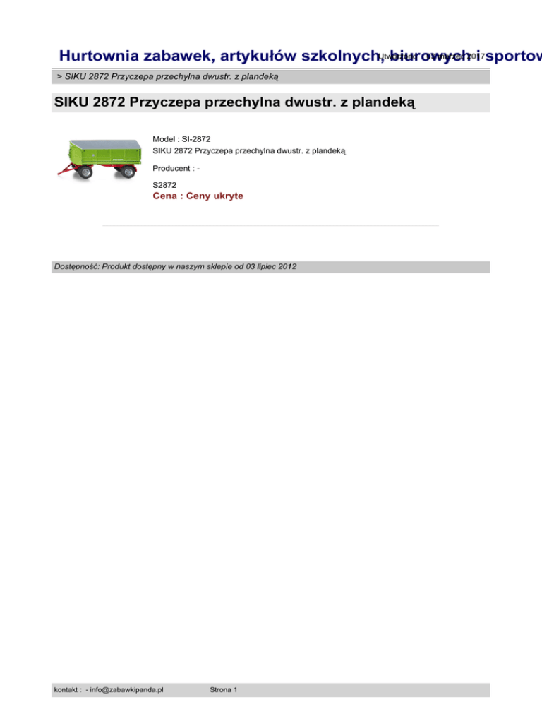 : 03 marzec 2017 Hurtownia zabawek, artykułów szkolnych,Utworzono biurowych i sportow > SIKU 2872 Przyczepa przechylna dwustr. z plandeką SIKU 2872 Przyczepa przechylna dwustr. z plandeką Model : SI-2872 SIKU 2872 Przyczepa przechylna dwustr. z plandeką Producent : S2872 Cena : Ceny ukryte Dostępność: Produkt dostępny w naszym sklepie od 03 lipiec 2012 kontakt : - [email protected] Strona 1