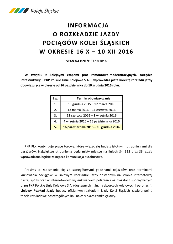 INFORMACJA O ROZKŁADZIE JAZDY POCIĄGÓW KOLEI ŚLĄSKICH W OKRESIE 16 X – 10 XII 2016 STAN NA DZIEŃ: 07.10.2016 W związku z kolejnymi etapami prac remontowo-modernizacyjnych, zarządca infrastruktury – PKP Polskie Linie Kolejowe S.A. – wprowadza piata korektę rozkładu jazdy obowiązującą w okresie od 16 października do 10 grudnia 2016 roku. L.p. Termin obowiązywania 1. 13 grudnia 2015 – 12 marca 2016 2. 13 marca 2016 – 11 czerwca 2016 3. 12 czerwca 2016 – 3 września 2016 4. 4 września 2016 – 15 października 2016 5. 16 października 2016 – 10 grudnia 2016 PKP PLK kontynuuje prace torowe, które wiązać się będą z istotnymi utrudnieniami dla pasażerów. Największe utrudnienia będą miały miejsce na liniach S4, S58 oraz S6, gdzie wprowadzona będzie zastępcza komunikacja autobusowa. Prosimy o zapoznanie się ze szczegółowymi godzinami odjazdów oraz terminami kursowania pociągów: w Liniowym Rozkładzie Jazdy dostępnym na stronie internetowej naszej spółki oraz w internetowych wyszukiwarkach połączeń i na plakatach sporządzanych przez PKP Polskie Linie Kolejowe S.A. (dostępnych m.in. na dworcach kolejowych i peronach). Liniowy Rozkład Jazdy będący oficjalnym rozkładem jazdy Kolei Śląskich zawiera pełne tabele rozkładowe poszczególnych linii na cały okres zamknięciowy. S4 Tychy Lodowisko – Tychy – Katowice – Sosnowiec Główny Z powodu kontunuowania prac związanych z naprawą podtorza na odcinku Katowice Ligota – PODG Mąkołowiec w całym okresie zamknięcia ruch pociągów pomiędzy stacjami Tychy i Katowice Ligota będzie odbywał się po jednym torze. W związku z tym za część pociągów zostanie wprowadzona autobusowa komunikacja zastępcza (kursy przyspieszone pomiędzy stacjami Katowice i Tychy Lodowisko, bez postojów na stacjach pośrednich), ponadto kilka połączeń będzie kursowało w skróconej relacji pomiędzy stacjami Tychy Lodowisko i Tychy z przesiadkami na pociągi innych linii. Szczegóły w tabelach poniżej: ZKA w kierunku do Katowic: L.p. Nr pociągu Trasa i godziny kursowania termin kursowania 1. 44294 Tychy Lodowisko 5:45 - Katowice 6:25 Ⓓ 2. 44316 Tychy Lodowisko 6:23 - Katowice 7:03 Ⓓ 3. 44288 Tychy Lodowisko 7:00 - Katowice 7:40 Ⓓ 4. 44148 Tychy Lodowisko 7:14 - Katowice 7:54 Ⓒ 5. 44196 Tychy Lodowisko 8:17 - Katowice 8:57 Ⓓ 6. 44320 Tychy Lodowisko 9:20 - Katowice 10:00 Ⓓ 7. 44156 Tychy Lodowisko 9:25 - Katowice 10:05 Ⓒ 8. 44158/44322 Tychy Lodowisko 11:15 - Katowice 11:55 ①-⑦ 9. 44338 Tychy Lodowisko 13:20 - Katowice 14:00 Ⓓ 10. 40932 Trasa ZKA: Tychy Lodowisko 14:03 - Katowice 14:43 Trasa pociągu: Katowice 14:54 - Sosnowiec Główny 15:04 Ⓓ 11. 44290 Tychy Lodowisko 15:15 - Katowice 15:55 Ⓓ 12. 44204 Tychy Lodowisko 16:05 - Katowice 16:45 Ⓓ 13. 40940 Trasa ZKA: Tychy Lodowisko 16:29 - Katowice 17:09 Trasa pociągu: Katowice 17:13 - Sosnowiec Główny 17:23 Ⓓ 14. 44340 Tychy Lodowisko 17:10 - Katowice 17:50 Ⓓ 15. 44324 Tychy Lodowisko 18:55 - Katowice 19:35 Ⓓ ZKA w kierunku do Tychów Lodowiska: L.p. Nr pociągu Trasa i godziny kursowania termin kursowania 1. 40915 Katowice 7:20 - Tychy Lodowisko 8:00 Ⓓ 2. 40937 Katowice 12:20 - Tychy Lodowisko 13:00 Ⓒ 3. 44327 Katowice 12:50 - Tychy Lodowisko 13:30 Ⓓ 4. 44063 Trasa pociągu: Sosnowiec Główny 13:34 - Katowice 13:45 Trasa ZKA: Katowice 13:50 - Tychy Lodowisko 14:30 Ⓓ 5. 44155 Katowice 14:40 - Tychy Lodowisko 15:20 Ⓒ 6. 40939 Katowice 15:17 - Tychy lodowisko 15:57 Ⓓ 7. 44329 Katowice 15:50 - Tychy Lodowisko 16:30 Ⓓ 8. 40943 Katowice 16:13 - Tychy Lodowisko 16:53 Ⓓ 9. 44293 Katowice 16:50 - Tychy Lodowisko 17:30 Ⓓ 10. 44343 Katowice 17:08 - Tychy Lodowisko 17:48 Ⓓ 11. 44161 Katwice 17:10 - Tychy Lodowisko 17:50 Ⓒ 12. 44333 Katowice 17:22 - Tychy Lodowisko 18:02 Ⓓ 13. 44331 Katowice 18:15 - Tychy Lodowisko 18:55 Ⓓ 14. 44337 Katowice 18:35 - Tychy Lodowisko 19:15 Ⓓ 15. 44345 Katowice 19:20 - Tychy Lodowisko 20:00 Ⓓ Lokalizacja przystanków ZKA: Katowice: Przystanek autobusowy „Andrzeja Dworzec”- przy Placu Oddziałów Młodzieży Powstańczej, Tychy Lodowisko: Przystanek MZK Tychy Lodowisko przy ul. Wyszyńskiego. Skrócone relacje: L.p. 1. 2. 3. 4. 5. 6. 7. 8. L.p. 1. 2. 3. 4. 5. 6. 7. Nr pociągu S5 S5 S5 S5 S5 S5 S6 S5 44186 44138 44192 49602 44194 49704 44106 49604 40922 44118 44200 49810 44110 44072 40948 49620 Nr pociągu S5 49711 40907 S5 49801 40911 S5 49713 40921 S5 44189 40919/21 S5 49617 40929 S5 49721 40935 S6 49341 40945 Trasa i godziny kursowania termin kursowania Tychy Lodowisko 4:56 - Tychy 5:05 Tychy 5:10 - Katowice 5:31 Tychy Lodowisko 6:13 - Tychy 6:23 Tychy 6:27 - Katowice 6:44 Tychy Lodowisko 7:21 - Tychy 7:30 Tychy 7:44 - Katowice 8:02 Tychy Lodowisko 8:00 - Tychy 8:09 Tychy 8:27 - Katowice 8:46 Tychy Lodowisko 11:52 - Tychy 12:02 Tychy 12:09 - Katowice 12:29 Tychy Lodowisko 14:28 - Tychy 14:38 Tychy 14:44 - Katowice 15:04 Tychy Lodowisko 15:40 - Tychy 15:49 Tychy 15:59 - Katowice 16:19 Tychy Lodowisko 18:36 - Tychy 18:45 Ⓓ Tychy 18:51 - Katowice 19:11 Ⓓ Ⓓ Ⓒ ①-⑦ Ⓓ Ⓒ Ⓓ Trasa i godziny kursowania termin kursowania Katowice 5:17 - Tychy 5:40 Tychy 5:46 - Tychy Lodowisko 5:55 Ⓓ Katowice 6:32 - Tychy 6:53 Tychy 6:59 - Tychy Lodowisko 7:08 Ⓓ Katowice 8:32 - Tychy 8:55 Tychy 9:02 - Tychy Lodowisko 9:12 Ⓒ Katowice 8:32 - Tychy 8:55 Tychy 9:08 - Tychy Lodowisko 9:18 Ⓓ Katowice 12:30 - Tychy 12:51 Tychy 12:58 - Tychy Lodowisko 13:09 Katowice 14:23 - Tychy 14:44 Tychy 14:50 - Tychy Lodowisko 15:00 Ⓓ Katowice 16:23 - Tychy 16:45 Ⓒ Tychy 16:52 - Tychy Lodowisko 17:02 Ⓓ S5 Katowice – Tychy – Pszczyna – Bielsko-Biała Główna – Żywiec – Zwardoń Do końca zamknięcia pociąg 49501 REKSIO będzie kursował w skróconej relacji ze stacji Tychy. Dojazd z Katowic zostanie zapewniony pociągiem innej linii, z uwzględnieniem czasu koniecznego na przesiadkę pomiędzy składami. Szczegóły odnośnie ww. informacji oraz pełny rozkł