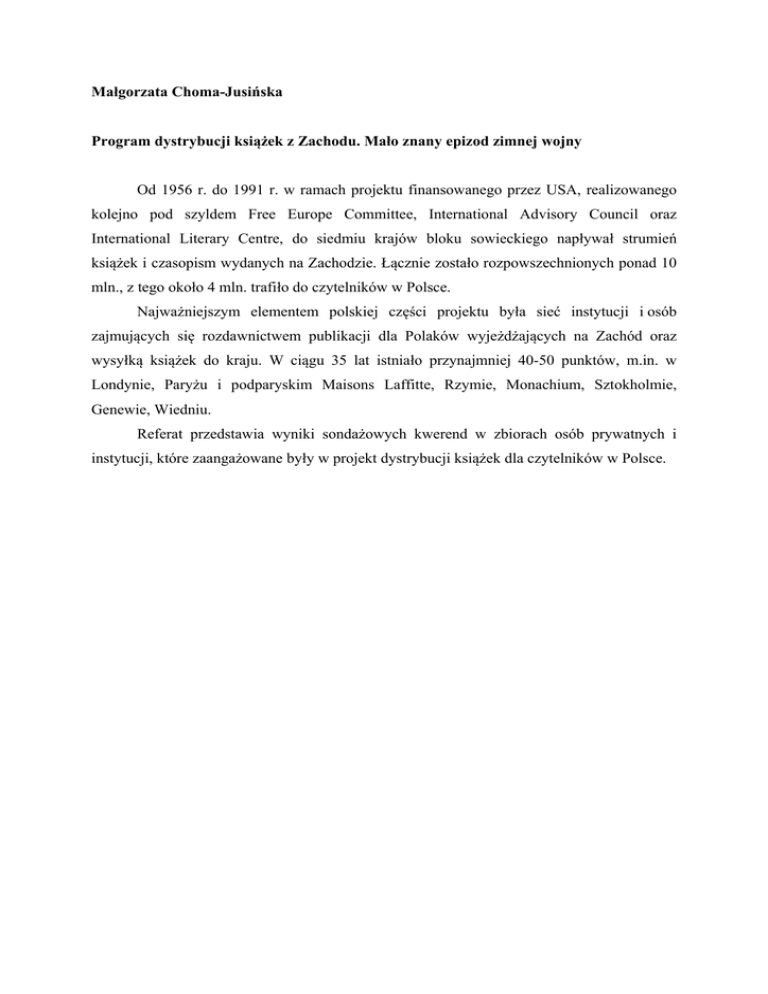 Małgorzata Choma-Jusińska Program dystrybucji książek z Zachodu. Mało znany epizod zimnej wojny Od 1956 r. do 1991 r. w ramach projektu finansowanego przez USA, realizowanego kolejno pod szyldem Free Europe Committee, International Advisory Council oraz International Literary Centre, do siedmiu krajów bloku sowieckiego napływał strumień książek i czasopism wydanych na Zachodzie. Łącznie zostało rozpowszechnionych ponad 10 mln., z tego około 4 mln. trafiło do czytelników w Polsce. Najważniejszym elementem polskiej części projektu była sieć instytucji i osób zajmujących się rozdawnictwem publikacji dla Polaków wyjeżdżających na Zachód oraz wysyłką książek do kraju. W ciągu 35 lat istniało przynajmniej 40-50 punktów, m.in. w Londynie, Paryżu i podparyskim Maisons Laffitte, Rzymie, Monachium, Sztokholmie, Genewie, Wiedniu. Referat przedstawia wyniki sondażowych kwerend w zbiorach osób prywatnych i instytucji, które zaangażowane były w projekt dystrybucji książek dla czytelników w Polsce.