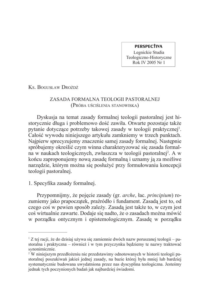 144 KS. BOGUSŁAW DROŻDŻ †T PERSPECTIVA Legnickie Studia Teologiczno-Historyczne Rok IV 2005 Nr 1 KS. BOGUSŁAW DROŻDŻ ZASADA FORMALNA TEOLOGII PASTORALNEJ (PRÓBA UŚCIŚLENIA STANOWISKA) Dyskusja na temat zasady formalnej teologii pastoralnej jest historycznie długa i problemowo dość zawiła. Otwarte pozostaje także pytanie dotyczące potrzeby takowej zasady w teologii praktycznej1. Całość wywodu niniejszego artykułu zamkniemy w trzech punktach. Najpierw sprecyzujemy znaczenie samej zasady formalnej. Następnie spróbujemy określić czym winna charakteryzować się zasada formalna w naukach teologicznych, zwłaszcza w teologii pastoralnej2. A w końcu zaproponujemy nową zasadę formalną i uznamy ją za możliwe narzędzie, którym można się posłużyć przy formułowaniu koncepcji teologii pastoralnej. 1. Specyfika zasady formalnej. Przypomnijmy, że pojęcie zasady (gr. arche, łac. principium) rozumiemy jako prapoczątek, praźródło i fundament. Zasadą jest to, od czego coś w pewien sposób zależy. Zasadą jest także to, w czym jest coś wirtualnie zawarte. Dodaje się nadto, że o zasadach można mówić w porządku ontycznym i epistemologicznym. Zasadę w porządku Z tej racji, że do dzisiaj używa się zamiennie dwóch nazw poruszanej teologii – pastoralna i praktyczna – również i w tym przyczynku będziemy te nazwy traktować synonimicznie. 2 W niniejszym przedłożeniu nie przedstawimy odnotowanych w historii teologii pastoralnej poszukiwań jakieś jednej zasady, na bazie której była mniej lub bardziej systematycznie budowana uwydatniona przez nas dyscyplina teologiczna. Jesteśmy jednak tych poczynionych badań jak najbardziej świadomi. 1 Zasada formalna teologii pastoralnej 145 ontycznym utożsamia się z racją ostateczną3. Jest ona w tym wypadku fundamentalnym składnikiem bytu. Natomiast porządek epistemologiczny ujmuje zasady jako „naczelne twierdzenia”. Mogą one występować jako ogólne założenia budowanych teorii lub ciągu rozumowania. Występują one również jako przesłanki w danym wnioskowaniu. Te zasady mogą być także regułami zapewniającymi wnioskowaniu konkluzywność. Nadmieńmy, że w etyce zasadami są naczelne normy. Z nich wydobywane są normy szczegółowe, które uwzględniają już okoliczności danego postępowania lub działania4. Swój ciężar gatunkowy posiada również określenie „formalny”. Znaczenie tego terminu obecnego w różnych słownych odmianach (forma w opozycji do materii czy treści, przyczyna formalna, formalizm, formalizacja), zasadniczo daje się sprowadzić do pewnego zabiegu myślowego polegającego na tworzeniu mniej lub bardziej sformalizowanej teorii dedukcyjnej5. Nas tak bardzo nie interesuje rzeczownikowe rozumienie terminu „forma”, ale jego znaczenie określające. Kładąc większy akcent na „zasadę”, próbujemy ją tylko doprecyzować. Oknem pozwalającym nam to uczynić jest właśnie strona formalna tej zasady6. Stąd i mowa o zasadzie formalnej. Czym zatem Jeżeli mówimy o zasadzie ontycznej to mamy na myśli realne byty lub ich składniki w funkcji ugruntowywania czegoś – w funkcji realnego uzasadniania. Mówiąc zaś o racji ontycznej, to bardziej wskazuje się na czynniki wyjaśniające jakieś stany rzeczy lub czynniki odkryte w toku rozumowania szukania odpowiedzi na pytanie. J. HERBUT. Zasada. W: Leksykon filozofii klasycznej. Lublin 1997 s. 549. 4 HERBUT. Zasada. s. 549. 5 „Język tej teorii składa się ze zmiennych i stałych logicznych wybranej logiki formalnej, a także z wyrażeń pozalogicznych, których sens konstruowana teoria ma właśnie w zorganizowanym układzie aksjomatów, definicji, dowodów i dowodzonych tez wyłożyć w sposób konsekwentny i intersubiektywnie dostępny dla wszystkich odbiorców, którzy są obeznani z funkcjonowaniem języków symbolicznych i regułami rządzącymi formalną poprawnością dedukcji”. E. NIEZNAŃSKI. Formalizacja. W: Leksykon filozofii klasycznej. s. 246. Dedukcjonistyczny sposób uprawiania nauki można scharakteryzować następująco: „w punkcie wyjścia nie tyle koncentrujemy się na danych doświadczenia, ile na problemach, które rodzą się na tle całokształtu dotychczasowej wiedzy i w konfrontacji teorii z doświadczeniem. Rozwikłanie problemu dokonuje się w oparciu o zasady logiki dedukcyjnej. Nie ma tu miejsca na stosowanie metody indukcyjnej. Popper stwierdza skrajnie, że indukcja jest mitem – na styku wiedzy teoretycznej i danych empirycznych rodzą się problemy prowadzące do nowych teorii, z których dedukcyjnie wyprowadza się zdania testowe, konfrontowane z wynikami obserwacji. To dedukcja więc, a nie indukcja angażowana jest w postępowaniu badawczym”. Z. HAJDUK. Ogólna metodologia nauk. Lublin 2000 s. 197. 6 Można bowiem mówić i o innych stronach tej zasady. Dają się one wyróżnić ponieważ „różne odmiany formalizmu zależą od tego, czemu przeciwstawia się formę, 3 146 KS. BOGUSŁAW DROŻDŻ jest zasada formalna? Jak należy ją rozumieć? Na bazie tego, co już powiedzieliśmy możemy drogą delikatnego rozstrzygnięcia zauważyć, że zasadą formalną w nauce jest to wszystko, co może wprowadzać określony i uzasadniony porządek w treściach, które chcemy przeanalizować, poddać krytyce i według wskazanego ładu, jeżeli tylko jest to możliwe, rozwinąć. Nasze pojmowanie zasady formalnej nie odbiega zasadniczo od jej rozumienia zaczerpniętego z terminologii scholastycznej, na którą to tradycję filozoficzną powołuje się F. Blachnicki7. Jest sens mówić o tej zasadzie jednie w naukach dedukcyjnych. Nauki indukcyjne wymykają się bowiem tak narzuconemu porządkowi. Aposterioryczność tych ostatnich ewentualną zasadę formalną każe traktować tylko jako „ciało obce”, które trzeba szybko odrzucić. Nauki indukcyjne prawdziwość poznania uzasadniają na podstawie doświadczenia, badania faktów. Współcześnie uważa się