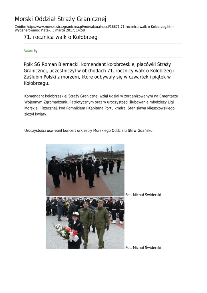 Morski Oddział Straży Granicznej Źródło: http://www.morski.strazgraniczna.pl/mor/aktualnosci/16671,71-rocznica-walk-o-Kolobrzeg.html Wygenerowano: Piątek, 3 marca 2017, 14:58 71. rocznica walk o Kołobrzeg Autor: tg Ppłk SG Roman Biernacki, komendant kołobrzeskiej placówki Straży Granicznej, uczestniczył w obchodach 71. rocznicy walk o Kołobrzeg i Zaślubin Polski z morzem, które odbywały się w czwartek i piątek w Kołobrzegu. Komendant kołobrzeskiej Straży Granicznej wziął udział w zorganizowanym na Cmentarzu Wojennym Zgromadzeniu Patriotycznym oraz w uroczystości ślubowania młodzieży Ligi Morskiej i Rzecznej. Pod Pomnikiem I Kapitana Portu kmdra. Stanisława Mieszkowskiego złożył kwiaty. Uroczystości uświetnił koncert orkiestry Morskiego Oddziału SG w Gdańsku. Fot. Michał Świderski Fot. Michał Świderski