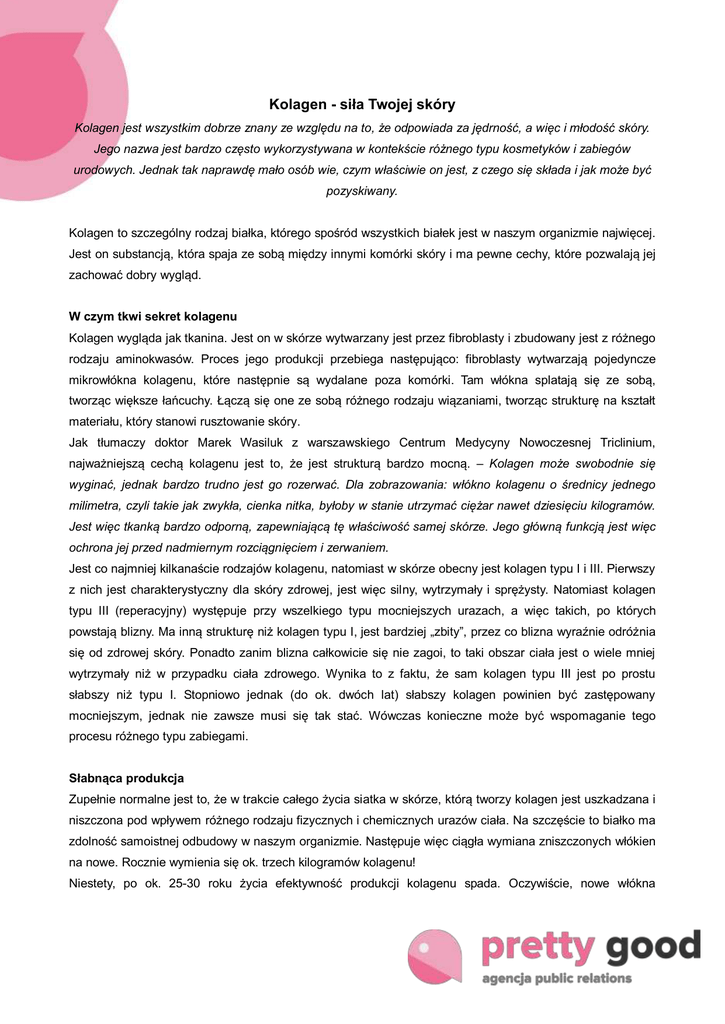Kolagen - siła Twojej skóry Kolagen jest wszystkim dobrze znany ze względu na to, że odpowiada za jędrność, a więc i młodość skóry. Jego nazwa jest bardzo często wykorzystywana w kontekście różnego typu kosmetyków i zabiegów urodowych. Jednak tak naprawdę mało osób wie, czym właściwie on jest, z czego się składa i jak może być pozyskiwany. Kolagen to szczególny rodzaj białka, którego spośród wszystkich białek jest w naszym organizmie najwięcej. Jest on substancją, która spaja ze sobą między innymi komórki skóry i ma pewne cechy, które pozwalają jej zachować dobry wygląd. W czym tkwi sekret kolagenu Kolagen wygląda jak tkanina. Jest on w skórze wytwarzany jest przez fibroblasty i zbudowany jest z różnego rodzaju aminokwasów. Proces jego produkcji przebiega następująco: fibroblasty wytwarzają pojedyncze mikrowłókna kolagenu, które następnie są wydalane poza komórki. Tam włókna splatają się ze sobą, tworząc większe łańcuchy. Łączą się one ze sobą różnego rodzaju wiązaniami, tworząc strukturę na kształt materiału, który stanowi rusztowanie skóry. Jak tłumaczy doktor Marek Wasiluk z warszawskiego Centrum Medycyny Nowoczesnej Triclinium, najważniejszą cechą kolagenu jest to, że jest strukturą bardzo mocną. – Kolagen może swobodnie się wyginać, jednak bardzo trudno jest go rozerwać. Dla zobrazowania: włókno kolagenu o średnicy jednego milimetra, czyli takie jak zwykła, cienka nitka, byłoby w stanie utrzymać ciężar nawet dziesięciu kilogramów. Jest więc tkanką bardzo odporną, zapewniającą tę właściwość samej skórze. Jego główną funkcją jest więc ochrona jej przed nadmiernym rozciągnięciem i zerwaniem. Jest co najmniej kilkanaście rodzajów kolagenu, natomiast w skórze obecny jest kolagen typu I i III. Pierwszy z nich jest charakterystyczny dla skóry zdrowej, jest więc silny, wytrzymały i sprężysty. Natomiast kolagen typu III (reperacyjny) występuje przy wszelkiego typu mocniejszych urazach, a więc takich, po których powstają blizny. Ma inną strukturę niż kolagen typu I, jest bardziej „zbity”, przez co blizna wyraźnie odróżnia się od zdrowej skóry. Ponadto zanim blizna całkowicie się nie zagoi, to taki obszar ciała jest o wiele mniej wytrzymały niż w przypadku ciała zdrowego. Wynika to z faktu, że sam kolagen typu III jest po prostu słabszy niż typu I. Stopniowo jednak (do ok. dwóch lat) słabszy kolagen powinien być zastępowany mocniejszym, jednak nie zawsze musi się tak stać. Wówczas konieczne może być wspomaganie tego procesu różnego typu zabiegami. Słabnąca produkcja Zupełnie normalne jest to, że w trakcie całego życia siatka w skórze, którą tworzy kolagen jest uszkadzana i niszczona pod wpływem różnego rodzaju fizycznych i chemicznych urazów ciała. Na szczęście to białko ma zdolność samoistnej odbudowy w naszym organizmie. Następuje więc ciągła wymiana zniszczonych włókien na nowe. Rocznie wymienia się ok. trzech kilogramów kolagenu! Niestety, po ok. 25-30 roku życia efektywność produkcji kolagenu spada. Oczywiście, nowe włókna kolagenowe nadal są produkowane, jednak odbywa się to już wolniej w stosunku do tempa rozpadu. – Od tego momentu, z każdym rokiem, produkujemy ok. 1 proc. kolagenu mniej niż się rozpada, a to dlatego, że fibroblasty z wiekiem stają się coraz bardziej leniwe. – tłumaczy doktor Marek Wasiluk z Triclinium. – Choć czynniki tego stanu rzeczy mogą być różne, to upraszczając, można wymienić następujące: genetyka, czynniki zewnętrzne (głównie działanie promieni słonecznych), tryb życia (palenie papierosów, zły tryb odżywiania). W efekcie wraz z wiekiem skóra, staje się cieńsza, bardziej gąbczasta w dotyku, zaczyna nieestetycznie opadać i jest podatna na zgniatanie, a więc wraz z wiekiem zaczynają pojawiać się na niej zmarszczki. Jak wytwarzać dobry kolagen? Kolagen ma więc kluczowy wpływ na wygląd skóry. Jak zmusić organizm, żeby wytwarzał ten najbardziej wartościowy? Według dr Marka Wasiluka z Triclinium należy wrócić do początku, czyli zastanowić się z czego jest on wytwarzany w naszym organizmie. Kolagen składa się z różnych aminokwasów, głównie proliny i glicyny oraz ich pochodnych, ale istnieją inne składniki niezbędne do powstania prawidłowego kolagenu, które musimy dostarczać z jedzeniem – Z produkcją kolagenu, a więc i wyglądem skóry, nierozerwalnie związane jest odżywianie. Jeśli nie dostarczamy naszemu organizmowi odpowiednich składników odżywczych, to w efekcie wytwarzany przez nasz organizm kolagen również jest niepełnowartościowy. Witamina C oraz żelazo biorą udział w budowie kolagenu, dlatego aby dłużej cieszyć się piękną i zdrową skórą należy zadbać o urozmaicony jadłospis. Za to stres powoduje jego rozkład, ponieważ kortyzol (hormon stresu) pobudza proces rozkładu kolagenu. Jeśli już wiemy, jakie składniki są potrzebne do wytworzenia kolagenu możemy się również zastanowić jak pomóc fibroblastom i poprawić proces jego produkcji w naszym organizmie. Dr Marek Wasiluk z Triclinium twierdzi, że aby przyśpieszyć i ożywić ich pracę warto jest wykonać zabieg ostrzykiwania skóry osoczem bogatopłytkowym, które stanowi paliwo dla komórek skóry. – Osocze bogatopłytkowe uzyskiwane z własnej krwi pacjenta zawiera składniki, które wywołują naturalne reakcje fizjologiczne przyspieszające i stymulujące gojenie się tkanek i powodujące prawidłową regenerację skóry kiedy na przykład się skaleczymy. Metoda mezoterapii osoczem bogatopłytkowym sprowadza się do oszukania organizmu i sztucznego zastymulowania komórek do pracy, czyli jej regeneracji za pomocą tych samych mechanizmów. Osocze bogatopłytkowe to coś jak paliwo dla komórek, które dzięki niemu są zmuszane do efektywniejszej pracy i szybszej produkcji kolagenu. Skąd czerpać 