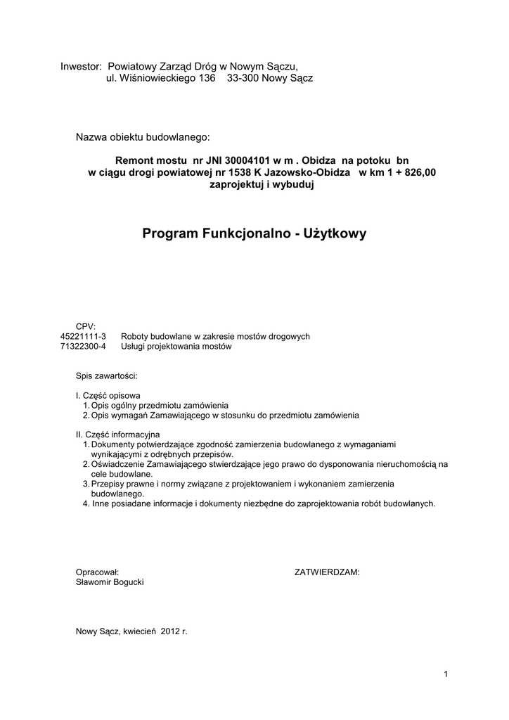 Inwestor: Powiatowy Zarz¹d Dróg w Nowym S¹czu, ul. Wiœniowieckiego 136 33-300 Nowy S¹cz Nazwa obiektu budowlanego: Remont mostu nr JNI 30004101 w m . Obidza na potoku bn w ci¹gu drogi powiatowej nr 1538 K Jazowsko-Obidza w km 1 + 826,00 zaprojektuj i wybuduj Program Funkcjonalno - U¿ytkowy CPV: 45221111-3 71322300-4 Roboty budowlane w zakresie mostów drogowych Usùugi projektowania mostów Spis zawartoœci: I. Czêœã opisowa 1. Opis ogólny przedmiotu zamówienia 2. Opis wymagañ Zamawiaj¹cego w stosunku do przedmiotu zamówienia II. Czêœã informacyjna 1. Dokumenty potwierdzaj¹ce zgodnoœã zamierzenia budowlanego z wymaganiami wynikaj¹cymi z odrêbnych przepisów. 2. Oœwiadczenie Zamawiaj¹cego stwierdzaj¹ce jego prawo do dysponowania nieruchomoœci¹ na cele budowlane. 3. Przepisy prawne i normy zwi¹zane z projektowaniem i wykonaniem zamierzenia budowlanego. 4. Inne posiadane informacje i dokumenty niezbêdne do zaprojektowania robót budowlanych. Opracowaù: Sùawomir Bogucki ZATWIERDZAM: Nowy S¹cz, kwiecieñ 2012 r. 1 I. Czêœã opisowa 1. Opis ogólny przedmiotu zamówienia. Przedmiotem zamówienia jest zadanie polegaj¹ce na wykonaniu: - Dokumentacji projektowej (projekt wykonawczy), Przedmiaru Robót i Szczegóùowych Specyfikacji Technicznych w zakresie remontu mostu na potoku bn. w m. Obidza gmina £¹cko, uzyskaniu wszelkich wymaganych prawem uzgodnieñ i decyzji pozwalaj¹cych wykonaã roboty budowlane, - Robót budowlanych okreœlonych w dokumentacji projektowej wykonanej przez Wykonawcê i zaakceptowanej przez Zamawiaj¹cego polegaj¹cych na remoncie mostu 1.1. Charakterystyczne parametry okreœlaj¹ce wielkoœã istniej¹cego obiektu i zakres robót budowlanych. mostu nr JNI 30004101 w m . Obidza na potoku bn. w ci¹gu drogi powiatowej nr 1538 K Jazowsko-Obidza w km 1 + 826,00 Opis konstrukcji mostu : - dùugoœã caùkowita konstrukcji noœnej 9,45 m, - most na prostej, - schemat statyczny obiektu – konstrukcja jednoprzêsùowa swobodnie podparta, - ustrój noœny mostu – 5 belek stalowych dwuteownik walcowany INP 450 - pomost – drewniany, - nawierzchnia jezdni bitumiczna, - noœnoœã obiektu - klasa obci¹¿enia D, - odwodnienie powierzchniowe, - przyczóùki betonowo-kamienne. Opis stanu technicznego mostu: Stan obiektu niezadawalaj¹cy , spêkana , pofaùdowana nawierzchnia , uszkodzone porêcze, brak wyniesienia chodników ponad poziom jezdni, zbutwiaùe elementy drewniane, skorodowane dêwigary. Cel i zakres przedmiotu zamówienia : Celem i efektem jest otrzymanie mostu o peùnych parametrach u¿ytkowych, klasy obci¹¿enia C (30 ton) dla caùej konstrukcji, speùniaj¹cego warunki rozporz¹dzenia Rozporz¹dzenie Ministra Transportu i Gospodarki Morskiej z dnia 30 maja 2000r. w sprawie warunków technicznych, jakim powinny odpowiadaã drogowe obiekty in¿ynierskie i ich usytuowanie (Dz.U.Nr 63 z dnia 3 sierpnia 2000r. poz. 735) W zakres wykonania przedmiotu zamówienia wchodz¹: - Wykonanie dokumentacji projektowej, zaakceptowanej przez Zamawiaj¹cego oraz projektu ewentualnego zabezpieczenia lub przeùo¿enia urz¹dzeñ obcych na czas wykonywania robót budowlanych o ile istniej¹. Pozyskanie uzgodnieñ i decyzji administracyjnych wg wùaœciwoœci wraz ze szczegóùowymi specyfikacjami technicznymi, przedmiarami robót. Wykonanie operatu wodnoprawnego . Dokumentacja powinna byã sprawdzona zgodnie z prawem budowlanym przez osoby posiadaj¹ce odpowiednie uprawnienia oraz doœwiadczenie w projektowaniu drogowych obiektów mostowych. - Wykonanie robót budowlanych polegaj¹cych na: a) Rozbiórce uszkodzonych jezdni asfaltowej , porêczy, gzymsów i pomostu drewnianego b) Oczyszczenie (poprzez piaskowanie) i pomalowanie dêwigarów i poprzecznic stalowych (3 warstwy) wykonanie dodatkowych stê¿eñ poprzecznych i dêwigarów je¿eli bêdzie to wynikaùo z projektu c) Wykonanie belki podùo¿yskowej oraz monta¿ ùo¿ysk elastomerowych d) Podniesienie konstrukcji mostu o ile bêdzie to wynikaùo z operatu wodnoprawnego e) Wykonanie ¿elbetowej pùyty pomostu zespolonej z dêwigarami lub innej, f) Wykonanie izolacji i jej odwodnienia g) Wykonanie ¿elbetowych kap chodnikowych na moœcie i skrzydeùkach 2 h) Uùo¿enie krawê¿ników kamiennych na mieszance grysowo-¿ywicznej i) Uùo¿enie kanaùów technologicznych w kapach chodnikowych j) Wykonanie nawierzchni jezdni z betonu asfaltowego na moœcie i na dojazdach - na moœcie w-wa ochronna œcieralna - na dojazdach w-wa wi¹¿¹ca , œcieralna na dùugoœci min 2x20 m k) Wykonanie nawierzchni na chodnikach z ¿ywicy lub emulsji asfaltowej modyfikowanej i grysów l) Monta¿ barieroporêczy mostowych m) Monta¿ barier na dojazdach n) Wykonanie dylatacji(bitumicznych lub moduùowych o) Remont przyczóùków, dostosowanie do ¿elbetowej pùyty mostu i dylatacji (wykonanie œcianki zaplecznej , skrzydeùek) p) przebudowa lub zabezpieczenie istniej¹cych urz¹dzeñ obcych na czas prowadzenia robót, które ewentualnie mog¹ siê pojawiã na dojazdach, q) remont koryta kamiennego potoku pod mostem i w obrêbie pasa drogowego (wykonanie okùadziny kamiennej) r) zabezpieczenie ruchu pieszego i pojazdów na czas trwania robót –oznakowanie robót, s) wykonanie wszystkich innych robót niezbêdnych dla zapewnienia zamierzonego efektu Ponadto Wykonawca bêdzie zobowi¹zany do opracowania, wykonania i uzgodnienia z Zamawiaj¹cym:, - Harmonogramu – do 7 dni po podpisaniu umowy, - Projektu organizacji ruchu na czas robót, - Innych opracowañ, które bêd¹ wymagane w celu wykonania robót (np. projekt zabezpieczenia lub przeùo¿enia urz¹dzeñ obcych itp.), - Zapewnienie potrzeb polityki transportowej dla spoùecznoœci lokalnej na czas prowadzenia robót budowlanych, - Wszystkie wymagane prawem i normami dokumenty w tym ewentualne decyzje administracyjne wymagane przy tego typu robotach budowlanych, jak równie¿ decyzje, pozwolenia wraz z czêœci¹ geodezyjn¹ umo¿liwiaj¹ce ewentualne wyjœcie poz