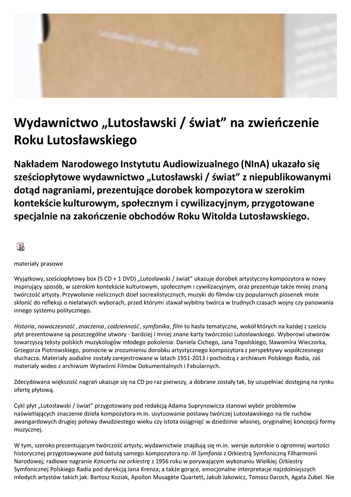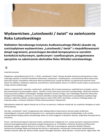 Wydawnictwo „Lutosławski / świat” na zwieńczenie Roku Lutosławskiego Nakładem Narodowego Instytutu Audiowizualnego (NInA) ukazało się sześciopłytowe wydawnictwo „Lutosławski / świat” z niepublikowanymi dotąd nagraniami, prezentujące dorobek kompozytora w szerokim kontekście kulturowym, społecznym i cywilizacyjnym, przygotowane specjalnie na zakończenie obchodów Roku Witolda Lutosławskiego. materiały prasowe Wyjątkowy, sześciopłytowy box (5 CD + 1 DVD) „Lutosławski / świat” ukazuje dorobek artystyczny kompozytora w nowy inspirujący sposób, w szerokim kontekście kulturowym, społecznym i cywilizacyjnym, oraz prezentuje także mniej znaną twórczość artysty. Przywołanie nielicznych dzieł socrealistycznych, muzyki do filmów czy popularnych piosenek może skłonić do refleksji o niełatwych wyborach, przed którymi stawał wybitny twórca w trudnych czasach wojny czy panowania innego systemu politycznego. Historia, nowoczesność, znaczenia, codzienność, symfonika, film to hasła tematyczne, wokół których na każdej z sześciu płyt prezentowane są poszczególne utwory - bardziej i mniej znane karty twórczości Lutosławskiego. Wyborowi utworów towarzyszą teksty polskich muzykologów młodego pokolenia: Daniela Cichego, Jana Topolskiego, Sławomira Wieczorka, Grzegorza Piotrowskiego, pomocne w zrozumieniu dorobku artystycznego kompozytora z perspektywy współczesnego słuchacza. Materiały audialne zostały zarejestrowane w latach 1951-2013 i pochodzą z archiwum Polskiego Radia, zaś materiały wideo z archiwum Wytwórni Filmów Dokumentalnych i Fabularnych. Zdecydowana większość nagrań ukazuje się na CD po raz pierwszy, a dobrane zostały tak, by uzupełniać dostępną na rynku ofertę płytową. Cykl płyt „Lutosławski / świat” przygotowany pod redakcją Adama Suprynowicza stanowi wybór problemów naświetlających znaczenie dzieła kompozytora m.in. usytuowanie postawy twórczej Lutosławskiego na tle ruchów awangardowych drugiej połowy dwudziestego wieku czy istota osiągnięć w dziedzinie własnej, oryginalnej koncepcji formy muzycznej. W tym, szeroko prezentującym twórczość artysty, wydawnictwie znajdują się m.in. wersje autorskie o ogromnej wartości historycznej przygotowywane pod batutą samego kompozytora np. III Symfonia z Orkiestrą Symfoniczną Filharmonii Narodowej; radiowe nagranie Koncertu na orkiestrę z 1956 roku w porywającym wykonaniu Wielkiej Orkiestry Symfonicznej Polskiego Radia pod dyrekcją Jana Krenza; a także gorące, emocjonalne interpretacje najzdolniejszych młodych artystów takich jak: Bartosz Koziak, Apollon Musagète Quartett, Jakub Jakowicz, Tomasz Daroch, Agata Zubel. Nie zabraknie również piosenek Witolda Lutosławskiego w wykonaniu Ireny Santor, Violetty Villas czy Kaliny Jędrusik, piosenek dla dzieci w interpretacji Jana Kobuszewskiego, zapomnianych kompozycji socrealistycznych oraz filmów z lat 40. z muzyką kompozytora. Wydawnictwo dostępne będzie w sprzedaży przedpremierowo od 24 stycznia br. w sklepie internetowym NInA, a od marca w wybranych salonach muzycznych. Projekt graficzny: Justyna Kosińska ze studia Temperówka. Niemal wszystkich utworów Witolda Lutosławskiego można bezpłatnie, w całości słuchać nawww.trzejkompozytorzy.pl, dzięki specjalnej muzycznej kolekcji udostępnionej przez NInA. Więcej na www.nina.gov.pl oraz www.muzykotekaszkolna.pl Kontakt dla Mediów: Agnieszka Wolak rzecznik prasowy Narodowego Instytutu Audiowizualnego, T. +48 22 380 49 75 M. 0503 099 013 E-mail: [email protected] www.nina.gov.pl Data publikacji: 31 / 01 / 2014