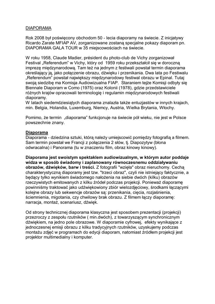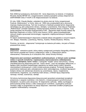 DIAPORAMA Rok 2008 był poświęcony obchodom 50 - lecia diaporamy na świecie. Z inicjatywy Ricardo Zarate MFIAP AV, zorganizowane zostaną specjalne pokazy diaporam pn. DIAPORAMA GALA TOUR w 35 miejscowościach na świecie. W roku 1958, Claude Madier, président du photo-club de Vichy zorganizował Festival „Referendum” w Vichy, który od 1959 roku przekształcił się w doroczną imprezę międzynarodową. Tam też na jednym z festiwali powstał termin diaporama określający ją, jako połączenie obrazu, dźwięku i przenikania. Dwa lata po Festiwalu „Referendum” powstał największy międzynarodowy festiwal obrazu w Epinal. Tutaj swoją siedzibę ma Komisja Audiowizualna FIAP. Staraniem tejże Komisji odbyły się Biennale Diaporam w Como (1975) oraz Kolonii (1978), gdzie przedstawiciele różnych krajów opracowali terminologię i regulamin międzynarodowych festiwali diaporamy. W latach siedemdziesiątych diaporama znalazła także entuzjastów w innych krajach, min. Belgia, Holandia, Luxemburg, Niemcy, Austria, Wielka Brytania, Włochy. Pomimo, że termin „diaporama” funkcjonuje na świecie pół wieku, nie jest w Polsce powszechnie znany. Diaporama Diaporama - dziedzina sztuki, którą należy umiejscowić pomiędzy fotografią a filmem. Sam termin powstał we Francji z połączenia 2 słów, tj. Diapozytyw (błona odwracalna) i Panorama (tu w znaczeniu film, obraz kinowy kinowy). Diaporama jest swoistym spektaklem audiowizualnym, w którym autor poddaje widza w sposób świadomy i zaplanowany równoczesnemu oddziaływaniu obrazów, dźwięków, barw i treści. Z fotografii "wzięła" obraz nieruchomy. Cechą charakterystyczną diaporamy jest tzw. "trzeci obraz", czyli nie istniejący faktycznie, a będący tylko wynikiem świadomego nałożenia na siebie dwóch (kilku) obrazów rzeczywistych emitowanych z kilku źródeł podczas projekcji. Ponieważ diaporamę powinniśmy traktować jako udźwiękowiony zbiór wielozdjęciowy, środkami łączącymi kolejne obrazy lub sekwencje obrazów są: przenikania, cięcia, rozjaśnienia, ściemnienia, migotania, czy chwilowy brak obrazu. Z filmem łączy diaporamę: narracja, montaż, scenariusz, dźwięk. Od strony technicznej diaporama klasyczna jest sposobem prezentacji (projekcji) przezroczy z zespołu rzutników ( min.dwóch), z towarzyszącym synchronicznym dźwiękiem, na jedno pole obrazowe. W diaporamie cyfrowej, efekty wynikające z jednoczesnej emisji obrazu z kilku tradycyjnych rzutników, uzyskujemy podczas montażu zdjęć w programach do edycji diaporam, natomiast źródłem projekcji jest projektor multimedialny i komputer.