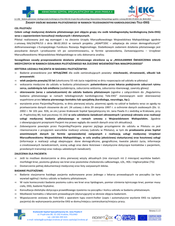 (v.1.05) Badanie pilotażowe: telediagnostyka kardiologiczna (Tele-EKG) dla Urzędu Marszałkowskiego Województwa Małopolskiego zgodnie z umową DO-423.175.2013 z dn. 08.02.2013 ZASADY OGÓLNE BADANIA PILOTAŻOWEGO W RAMACH TELEDIAGNOSTYKI KARDIOLOGICZNEJ TELE-EKG CEL PILOTAŻU Celem usługi medycznej działania pilotażowego jest objęcie grupy stu osób telediagnostyką kardiologiczną (tele-EKG) wraz z zapewnieniem konsultacji medycznych i dietetycznych. Pilotaż realizowany jest wg wymagań i na zlecenie Urzędu Marszałkowskiego Województwa Małopolskiego zgodnie z umową IXA/24/PR/13 z dnia 08.02.2013 w ramach projektu „ADAPT2DC – adaptacja do zmian demograficznych” dofinansowanego z Europejskiego Funduszu Rozwoju Regionalnego. Dodatkowym zadaniem działania pilotażowego jest pozyskanie danych i przekazanie ich po zanonimizowaniu, w formie sprawozdania, Zamawiającemu – Urzędowi Marszałkowskiemu Województwa Małopolskiego w celu dokonania analizy. Szczegółowe zasady przeprowadzenie działania pilotażowego określone są w „REGULAMINIE ŚWIADCZENIA USŁUG MEDYCZNYCH W RAMACH DZIAŁANIA PILOTAŻOWEGO NA ZLECENIE WOJEWÓDZTWA MAŁOPOLSKIEGO” KRYTERIA UDZIAŁU PACJENTA W BADANIU PILOTAŻOWYM: • Badanie przewidziane jest WYŁĄCZNIE dla osób zamieszkujących powiaty: miechowski, chrzanowski, olkuski lub proszowicki. • wiek pacjenta powyżej 55 lat (ukończony 55 rok życia najpóźniej w dniu rozpoczęcia od udziału w pilotażu) • wskazania medyczne do udziału w badaniu pilotażowym: potwierdzone przez lekarza podejrzenie zaburzeń rytmu serca, zasłabnięcia lub omdlenia (zasłabnięcia, zaburzenia widzenia, zaburzenia równowagi, zawroty głowy) • skierowanie (wraz z zaświadczeniem) do udziału badaniu pilotażowym (zgodne z załącznikiem do „Regulaminu badania pilotażowego w ramach telediagnostyki kardiologicznej Tele-EKG” stanowiącym wzór skierowania) wypełnione przez lekarza pierwszego kontaktu lub specjalistę (kardiologa, neurologa, itp.). • wyrażenie przez Pacjentkę/Pacjenta, w dniu pierwszej wizyty, pisemnej zgody na udział w badaniu wraz ze zgodą na przetwarzanie danych stosownie do art. 24 ustawy z dnia 29 sierpnia 1997 r. o ochronie danych osobowych (Dz. U. 2002 r. Nr 101 poz. 926, ze zm.) przez Krakowski Szpital Specjalistyczny im. Jana Pawła II z siedzibą w Krakowie, przy ul. Prądnickiej 80, kod pocztowy 31-202 w celu udzielania świadczeń zdrowotnych i promocji zdrowia oraz realizacji usługi medycznej badania pilotażowego w ramach umowy z Województwem Małopolskim. Zgodnie z obowiązującymi przepisami Pacjent ma prawo wglądu do swoich danych oraz ich aktualizacji. • Zobowiązanie powzięte przez Pacjentkę/Pacjenta poprzez jej/jego przystąpienie do udziału w Pilotażu co jest równoznaczne z przyjęciem warunków realizacji umowy (udziału w Pilotażu), w tym do przekazania przez Szpital anonimowych danych (w formie sprawozdania) związanych z realizacją usługi medycznej Urzędowi Marszałkowskiemu Województwa Małopolskiego, w celu analizy jakościowej statystycznej oraz kosztowej usługi (informacje o realizacji usługi obejmujące: dane demograficzne, geograficzne, kwestie jakości życia, informacje o zrealizowanych świadczeniach, ocenę usługi oraz dane ilościowe i statystyczne dotyczące kontaktów z pacjentem, przesłanych transmisji oraz rodzaju udzielonych świadczeń). ZALECENIA DLA PACJENTA • • Jeśli to możliwe dostarczenie w dniu pierwszej wizyty aktualnych (nie starszych niż 2 miesiące) wyników badań: morfologii krwi, poziomu glukozy we krwi oraz poziomów cholesterolu całkowitego, LDL, HDL i triglicerydów (TG) Dostarczenie pełnej dokumentacji medycznej oraz listy zażywanych leków. BADANIE PILOTAŻOWE: • Badanie stacjonarne każdego pacjenta wykonywane przez jednego z lekarzy prowadzących na początku (w tym wywiad ogólny) i końcu udziału w badaniu pilotażowym. • W razie konieczności badanie poziomu cukru we krwi oraz lipidogram, pomiar ciśnienia tętniczego krwi, pomiar masy ciała, EKG, badanie fizykalne. • Konsultacja dietetyka dotycząca prawidłowego żywienia na początku i końcu udziału w badaniu pilotażowym. • Możliwość kontaktu z lekarzem prowadzącym (dyżurującym) w okresie objęcia badaniem. • Wypożyczenie zestawu do Tele-EKG z aparatem typu event-holter (zapis i automatyczne wysłanie EKG na żądanie pacjenta) do wykonywania pomiarów EKG w domu/miejscu zamieszkania/miejscu pracy. Krakowski Szpital Specjalistyczny im. Jana Pawła II ul. Prądnicka 80, 31-202 Kraków, POLAND tel: +48 504 299 323 e-mail: [email protected] www.szpitaljp2.krakow.pl Strona 1 z 2 (v.1.05) Badanie pilotażowe: telediagnostyka kardiologiczna (Tele-EKG) dla Urzędu Marszałkowskiego Województwa Małopolskiego zgodnie z umową DO-423.175.2013 z dn. 08.02.2013 • • Szkolenie z obsługi zestawu do Tele-EKG i pomoc techniczną dot. obsługi aparatu w okresie objęcia usługą. Pełna diagnoza nadesłanych zapisów Tele-EKG otrzymywaną podczas kończącej wizyty u lekarza z zaleceniami dalszego postępowania. PRZEBIEG BADANIA PILOTAŻOWEGO • Lekarz rodzinny, pierwszego kontaktu lub specjalista kieruje pacjenta spełniającego „Kryteria udziału w badaniu pilotażowym” na badanie wypełniając skierowanie wraz z zaświadczeniem, których blankiet jest możliwy do pobrania ze strony www.szpitaljp2.krakow.pl lub pobrany jest/został w trakcie spotkań akcji informacyjnej organizowanej przez Urząd Marszałkowski Województwa Małopolskiego. • Pacjent posiadający prawidłowo wypełnione skierowanie wraz z zaświadczeniem, wyrażający wolę uczestnictwa w badaniu pilotażowym i zgadzający się na jego warunki kontaktuje się telefonicznie lub mailowo ze Szpitalem (pod wskazanym na skierowaniu numerem telefonu +48 504 299 323 lub adresem e-mail: [email protected]) w celu ustalenia terminu wizyt. • Usługą zostanie objętych pierwszych 100 zgłoszonych pacje