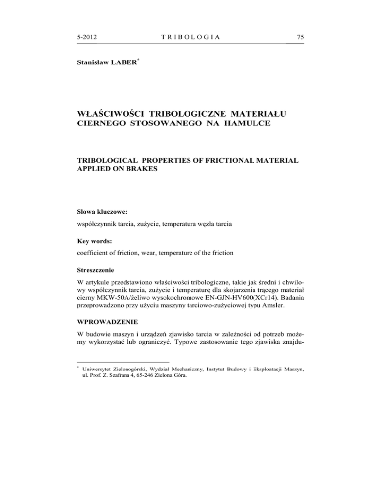 5-2012 TRIBOLOGIA 75 Stanisław LABER* WŁAŚCIWOŚCI TRIBOLOGICZNE MATERIAŁU CIERNEGO STOSOWANEGO NA HAMULCE TRIBOLOGICAL PROPERTIES OF FRICTIONAL MATERIAL APPLIED ON BRAKES Slowa kluczowe: współczynnik tarcia, zużycie, temperatura węzła tarcia Key words: coefficient of friction, wear, temperature of the friction Streszczenie W artykule przedstawiono właściwości tribologiczne, takie jak średni i chwilowy współczynnik tarcia, zużycie i temperaturę dla skojarzenia trącego materiał cierny MKW-50A/żeliwo wysokochromowe EN-GJN-HV600(XCr14). Badania przeprowadzono przy użyciu maszyny tarciowo-zużyciowej typu Amsler. WPROWADZENIE W budowie maszyn i urządzeń zjawisko tarcia w zależności od potrzeb możemy wykorzystać lub ograniczyć. Typowe zastosowanie tego zjawiska znajdu- * Uniwersytet Zielonogórski, Wydział Mechaniczny, Instytut Budowy i Eksploatacji Maszyn, ul. Prof. Z. Szafrana 4, 65-246 Zielona Góra. 76 TRIBOLOGIA 5-2012 jemy w układach hamulcowych, szczególnie w przypadku wysokosprawnych i wysokoobciążonych hamulców samochodów ciężkich, a także kół samolotów. W wyniku ciągłego rozwoju techniki poszukiwane są coraz to nowe lepsze i wytrzymalsze materiały stosowane na elementy układów hamulcowych. Metodami eksperymentalno-badawczymi i symulacyjnymi poszukuje się nowych materiałów na pary cierne oraz nowego podejścia podczas projektowania układów hamulcowych. Badania wymagają wysokiej dokładności oraz precyzji, gdyż ich wyniki decydują o bezpieczeństwie ludzi eksploatujących urządzenia i maszyny, w których są stosowane badane materiały. Materiały cierne stosowane na hamulce powinny zapewniać stabilny współczynnik tarcia, niskie zużycie przy różnych prędkościach pracy, ciśnieniach, temperaturach oraz warunkach otoczenia. Materiały cierne muszą być odporne na wibrację i hałas podczas hamowania [L. 7, 8 ]. Na materiały cierne stosuje się: żeliwo szare, żeliwo szare z zawartością tytanu, stopy aluminium, stopy tytanu, ceramika, kompozyty [L. 1–7, 9]. W artykule [L. 5] przedstawiono wyniki badań trzech rodzajów żeliwa: żeliwa szarego o twardości 250 HB, o dużej zawartości węgla oraz żeliwa szarego z zawartością tytanu. Uzyskane wyniki badań w porównaniu z kompaktowym żelazem z zawartością grafitu (CGI) charakteryzowały się niższą siłą tarcia, mniejszą stratą mocy oraz niższą temperaturą węzła tarcia. M.H. Cho i współautorzy [L. 4] badali wpływ ilości płatków grafitu żeliwa szarego oraz ilości ferrytu na współczynnik tarcia. Wyniki badań wykazały, że istotny wpływ na współczynnik tarcia ma ilość grafitu płatkowego w żeliwie szarym, a nie ilość ferrytu. Oprócz żeliwa na tarcze hamulcowe stosowane są inne materiały. M.A. Maleque i współautorzy [L. 9] prowadzili badania nad wyborem najlepszego materiału na wirnik hamulca. Do badań przyjęto następujące materiały: żeliwo, stop aluminium, stopy tytanu, ceramika i kompozyty. Spośród badanych materiałów najlepszymi właściwościami tarciowymi, mechanicznymi oraz najkorzystniejszą przewodnością cieplną i gęstością charakteryzował się stop aluminiowy. Prowadzono również badania wpływu stopów tytanu na korozję, zużycie i na odporność na wysokie temperatury. Stopy tytanu zwiększyły odporność na korozję, zużycie i pracę węzła tarcia w wysokich temperaturach [L. 2]. W celu uzyskania pozytywnej charakterystyki wpływu prędkości na współczynnik tarcia prowadzono badania wpływu różnych włókien metalowych Cu, stali, Al we współpracy z żeliwem. Materiał cierny z miedzią wykazał się niekorzystną charakterystyką współczynnika tarcia – prędkość poślizgu. Miedź we współpracy z kompozytem Al- MMC wykazała się korzystną charakterystyką współczynnik tarcia – prędkość [L. 6]. 5-2012 TRIBOLOGIA 77 Duży wpływ na właściwości tribologiczne węzła tarcia ma wilgotność otoczenia. J. Abol i E. A. Shamseldin [L. 1] wykazali, że na wyniki badań właściwości tribologicznych kompozytów CVIC- C ma wpływ wilgotność otoczenia, zostało to poparte badaniami za pomocą skaningowej mikroskopii elektronowej i spektroskopii Ramma. Z analizy literatury wynika, że na pracę hamulca ma wpływ wiele różnych czynników. EKSPERYMENT Metoda eksperymentu Wyznaczenie właściwości tribologicznych: chwilowego i średniego współczynnika tarcia, zużycia oraz temperatury węzła tarcia wykonano za pomocą maszyny tarciowo-zużyciowej typu Amsler. Węzeł tarcia obciążano skokowo 300 N, 400 N, 500 N, 600 N przy stałej prędkości obrotowej przeciwpróbki wynoszącej 200 obr./min. Model węzła tarcia przedstawiono na Rys. 1. Rys. 1. Model węzła tarcia Fig. 1. Model of the friction Ocenę struktury geometrycznej powierzchni przed i po procesie tarcia wykonano za pomocą profilografometru TR-200. Wykorzystując wyniki badań obliczono średni współczynnik tarcia µśr i chwilowy współczynnik tarcia µch według zależności: µ śr = gdzie: A – praca tarcia [Nm], P – obciążenie próbki [N], D – średnica próbki[m], A ⋅10 3 , P ⋅ D ⋅ π ⋅ nc 78 TRIBOLOGIA µ ch = 5-2012 2M t , P⋅D nc – całkowita liczba obrotów w jednym badaniu, gdzie: Mt – moment tarcia [Nm], P – obciążenie próbki [N], D – średnica próbki [m]. Próbka i przeciwpróbka Do badań właściwości tribologicznych pary ciernej zastosowano materiały, które są używane do budowy hamulca samolotu. Na próbkę zastosowano materiał MKW-50A o składzie chemicznym: C = 16,6% Cr = 33,6% Fe = 40,4% Cu = 7%, Mg = 0,4% Al = 0,2% Si = 1,6% S = 0,2% Na Rys. 2 przedstawiono mikrostrukturę materiału MKW-50A. Na przeciwpróbkę zastosowano żeliwo wysokochromowe EN-GJN-HV600(XCr14) o następującym składzie chemicznym: C = 2,15%, Cu = 0,078%, Mn = 0,21%, Ni = 0,50%, Cr =14,02% P = 0,82%, S = 0,022%, Si = 0,835% . Mikrostrukturę badanego żeliwa przedstawiono na Rys. 3. Rys.