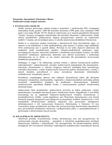 Ekonomia: Specjalność: Ekonomia i Biznes Studia pierwszego stopnia zaoczne: I. WYMAGANIA OGÓLNE Studia zaoczne pierwszego stopnia trwają 6 semestrów i przekraczają 60% wymaganej minimalnej liczby godzin, 1800 dla kierunku ekonomia (1098 godz. przy minimum 1080 godz.) oraz mają 180 pkt. ECTS. Studia te realizowane są w ramach specjalności Ekonomia i biznes, łaczącej wymagania ministerialne dla kierunku Ekonomia i jednocześnie, dzięki ofercie przedmiotów praktycznych, dającej przygotowanie zarówno do rozpoczęcia studiów 2 stopnia, jak też podjęcia pracy w szeroko pojmowanej działalności biznesowej. Studia te w znacznym stopniu korzystają z internetowych form prowadzenia zajęć, co stanowi o ich unikalności w skali ogólnopolskiej, gdyż ponad 1/3 godzin zajęć (dokładnie 34%) realizowana jest w sposób zdalny. Powinno to nie tylko stanowić ułatwienie dla studentów (brak przeładowania zjazdów sobotnio-niedzielnych godzinami zajęć, powodującymi znaczne zmęczenie studentów i utrudnienie przyswajana wiedzy), ale także umożliwić solidniejsze opanowanie materiału oraz ułatwić korzystanie z technologii informatycznej na co dzień, co ma istotne znaczenie dla prowadzenia nowoczesnej działalności gospodarczej. Studiujący w ciągu 3 lat zdobywają szeroką wiedzę z zakresu teoretycznych podstaw mikroekonomii i makroekonomii, narzędzi analitycznych (matematyka dla ekonomistów, statystyka, ekonometria), w zakresie mogącym stanowić niezbędną bazę zawodowego warsztatu ekonomisty, a także empirycznych zastosowań analizy ekonomicznej i wiedzy z innych dziedzin, potrzebnych w pracy zawodowej ekonomisty (informatyka, rachunkowość, zarządzanie, prawo). Przedmioty uzupełniające główny nurt edukacji ekonomicznej (takie jak ekonomia intergracji europejskiej, intytucjonalna, regionalna i eksperymaentalna) pozwalają pełniej zrozumieć niejednolitość podejścia do problemów ekonomicznych, pobudzić zainteresowanie sposobami badania świata z wykorzystaniem podstaw rozumowania ekonomicznego. Jednocześnie blok przedmiotów praktycznych pozwala na dobre połączenie wiedzy ekonomicznej i wymagań stawianych przez współczesny biznes. Zagadnienia w tym bloku koncentrują się na aspektach finansowo-analitycznych (Analiza ekonomiczna w przedsiębiorstwie, Giełda i rynek kapitałowy oraz Warszrtaty ekonomiczne), oraz dwóch istotnych grupach miejętności pozwalających na pozyskanie środków finansowych z Unii europejskiej (Wykorzystanie funduszy unijnych) oraz poszerzenie umiejętnosci informatycznych o ich zastosowania biznesowe (Informatyka w biznesie). Te trzy wymienione grupy przedmiotów powinny dać pewną przewagą absolwentom specjalności przy prowadzeniu działalności biznesowj i podejmowaniu pracy w przedsiębiorstwach w porównaniu z absolwentami innych uczelni. II. KWALIFIKACJE ABSOLWENTA Absolwent posiada wszechstronną wiedzę ekonomiczną oraz jest przygotowany do wykonywania zawodu ekonomisty – specjalisty w dziedzinie gospodarowania zasobami finansowymi, ludzkimi i materialnymi. Jest przygotowany do przeprowadzania analizy dostępnych lub tworzonych informacji wspierających podejmowanie racjonalnych decyzji osadzonych w kanonach nauk ekonomicznych. Absolwent jest przygotowany do pracy w przedsiębiorstwach, organizacjach i instytucjach (publicznych i pozarządowych) – głównie na stanowiskach operacyjnych – w kraju i za granicą. Posiada niezbędną wiedzę i umiejętności do samodzielnego prowadzenia działalności gospodarczej. Potrafi poruszać się swobodnie w europejskiej przestrzeni społeczno-gospodarczej. Zna język obcy na poziomie biegłości B2 Europejskiego Systemu Opisu Kształcenia Językowego Rady Europy. III. RAMOWE TREŚCI KSZTAŁCENIA 1 GRUPY TREŚCI KSZTAŁCENIA, LICZBA GODZIN ZORGANIZOWANYCH ORAZ LICZBA PUNKTÓW ECTS godziny ZAJĘĆ ECTS A. GRUPA TREŚCI PODSTAWOWYCH 540 92 B. GRUPA TREŚCI KIERUNKOWYCH 216* 38* Razem 756 130 * - bez powtarzania godzin i punktacji zawartej już w grupie treści podstawowych. 2 SKŁADNIKI TREŚCI KSZTAŁCENIA W GRUPACH WEDŁUG STANDARDU KIERUNKU EKONOMIA A. GRUPA TREŚCI PODSTAWOWYCH Treści kształcenia w zakresie: 1. Matematyki 60: Matematyka dla ekonomistów 96 godz., 2. Statystyki opisowej 30: Statystyka 48 godz. 3. Ekonometrii 30: Ekonometria 48 godz. 4. Mikroekonomii 60: Mikroekonomia 96 godz. 5. Podstaw makroekonomii 60: Makroekonomia 96 godz. 6. Zarządzania 30: Zarządzanie – 30 godz. 7. Rachunkowości 30: Rachunkowość – 30 godz. 8. Międzynarodowych stosunków gospodarczych 30: Teoria wymiany międzynarodowej – 36 godz. 9. Prawa 30: Prawo 30 godz. B. GRUPA TREŚCI KIERUNKOWYCH Treści kształcenia w zakresie: 1. Polityki społecznej: Rynek pracy i polityka społeczna 24 godz. 2. Polityki gospodarczej: Mikroekonomia, Makroekonomia, Wykorzystanie funduszy unijnych 216 godz. 3. Analizy ekonomicznej: Analiza ekonomiczna w przedsiębiorstwie, Warsztaty ekonomiczne 48 godz. 4. Finansów publicznych i rynków finansowych: Finanse, Giełda i rynek kapitałowy 72 godz. 5. Ekonomii integracji europejskiej: Ekonomia integracji europejskiej 24 godz. 6. Gospodarki regionalnej: Ekonomia regionalna 24 godz. 3 TREŚCI I EFEKTY KSZTAŁCENIA W ROZBICIU NA PRZEDMIOTY I BLOKI PRZEDMIOTÓW A. Blok podstawowy 1. Matematyka dla ekonomistów Treści kształcenia: Rachunek różniczkowy funkcji jednej zmiennej. Funkcje wielu zmiennych: pochodne częściowe, ekstrema funkcji – zastosowania ekonomiczne. Rachunek całkowy funkcji jednej zmiennej – całka nieoznaczona, oznaczona i niewłaściwa. Macierze, układy równań liniowych, wyznaczniki. Programowanie liniowe. Metody – graficzna i simpleks. Dualność w programowaniu liniowym. Programy komputerowe z zakresu programowania matematycznego. Efekty kształcenia – umiejętności i kompetencje: stosowanie wiedzy matematycznej jako narzędzia w warsztacie ekonomisty; stosowanie wiedzy matematycznej w badaniu zjawisk i pr