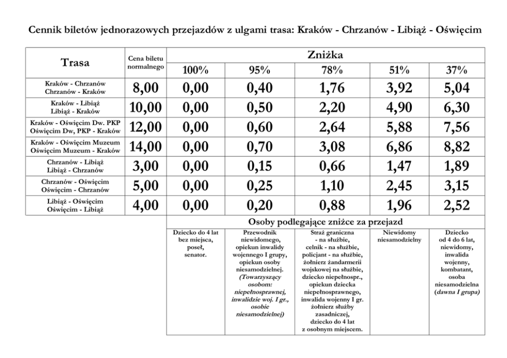 Cennik biletów jednorazowych przejazdów z ulgami trasa: Kraków - Chrzanów - Libiąż - Oświęcim Trasa Cena biletu normalnego Kraków - Chrzanów Chrzanów - Kraków 8,00 10,00 12,00 14,00 3,00 5,00 4,00 Kraków - Libiąż Libiąż - Kraków Kraków - Oświęcim Dw. PKP Oświęcim Dw, PKP - Kraków Kraków - Oświęcim Muzeum Oświęcim Muzeum - Kraków Chrzanów - Libiąż Libiąż - Chrzanów Chrzanów - Oświęcim Oświęcim - Chrzanów Libiąż - Oświęcim Oświęcim - Libiąż 100% 95% Zniżka 78% 0,00 0,00 0,00 0,00 0,00 0,00 0,00 0,40 0,50 0,60 0,70 0,15 0,25 0,20 1,76 2,20 2,64 3,08 0,66 1,10 0,88 51% 37% 3,92 4,90 5,88 6,86 1,47 2,45 1,96 5,04 6,30 7,56 8,82 1,89 3,15 2,52 Osoby podlegające zniżce za przejazd Dziecko do 4 lat bez miejsca, poseł, senator. Przewodnik niewidomego, opiekun inwalidy wojennego I grupy, opiekun osoby niesamodzielnej. (Towarzyszący osobom: niepełnosprawnej, inwalidzie woj. I gr., osobie niesamodzielnej) Straż graniczna - na słuźbie, celnik - na służbie, policjant - na służbie, żołnierz żandarmerii wojskowej na służbie, dziecko niepełnospr., opiekun dziecka niepełnosprawnego, inwalida wojenny I gr. żołnierz służby zasadniczej, dziecko do 4 lat z osobnym miejscem. Niewidomy niesamodzielny Dziecko od 4 do 6 lat, niewidomy, inwalida wojenny, kombatant, osoba niesamodzielna (dawna I grupa)