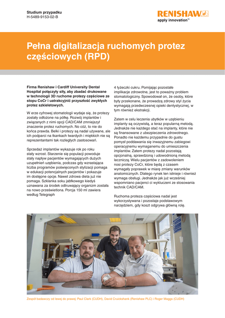 Studium przypadku H-5489-9153-02-B Pełna digitalizacja ruchomych protez częściowych (RPD) Firma Renishaw i Cardiff University Dental Hospital połączyły siły, aby zbadać drukowane w technologii 3D ruchome protezy częściowe ze stopu CoCr i uatrakcyjnić przyszłość zwykłych protez szkieletowych. W erze cyfrowej stomatologii wydaje się, że protezy zostały odłożone na półkę. Rozwój implantów i związanych z nimi opcji CAD/CAM zmniejszył znaczenie protez ruchomych. No cóż, to nie do końca prawda. Belki i protezy są nadal używane, ale ich podparci na tkankach twardych i miękkich nie są reprezentantami tak rozległych zastosowań. Sprzedaż implantów wykazuje rok po roku stały wzrost. Starzenie się populacji powoduje stały napływ pacjentów wymagających dużych uzupełnień uzębienia, podczas gdy wzrastająca liczba programów poświęconych stylizacji pomaga w edukacji potencjalnych pacjentów i pokazuje im dostępne opcje. Nawet zdrowa dieta już nie pomaga. Szklanka soku jabłkowego kiedyś uznawana za środek odtruwający organizm została na nowo prześwietlona. Porcja 150 ml zawiera według Telegraph 4 łyżeczki cukru. Pomijając pozostałe implikacje zdrowotne, jest to poważny problem stomatologiczny. Spowodował on, że osoby, które były przekonane, że prowadzą zdrowy styl życia wymagają przedwczesnej opieki dentystycznej, w tym również ekstrakcji. Zatem w celu leczenia ubytków w uzębieniu implanty są oczywistą, a teraz popularną metodą. Jednakże nie każdego stać na implanty, które nie są finansowane z ubezpieczenia zdrowotnego. Ponadto nie każdemu przypadnie do gustu pomysł poddawania się inwazyjnemu zabiegowi operacyjnemu wymaganemu do umieszczenia implantów. Zatem protezy nadal pozostają opcjonalną, sprawdzoną i udowodnioną metodą leczniczą. Wielu pacjentów z zadowoleniem nosi protezy CoCr, które będą z czasem wymagały poprawek w miarę zmiany warunków anatomicznych. Dlatego rynek ten istnieje i również wymaga obsługi. Jednakże jak już wcześniej wspomniano pacjenci ci wykluczeni ze stosowania technik CAD/CAM. Ruchoma proteza częściowa nadal jest wykorzystywana i pozostaje podstawowym narzędziem, gdy koszt odgrywa główną rolę. Zespół badawczy od lewej do prawej: Paul Clark (CUDH), David Cruickshank (Renishaw PLC) i Roger Maggs (CUDH) Częściowo cyfrowe części Dzisiejszy rynek produkcji protez częściowych daje bardzo ograniczony wybór. Najbardziej powszechne opcje są następujące: • Ręcznie wykonany model woskowy i odlew. • Projekt cyfrowy, dane przesłane do wytwórcy modelu woskowego i odlew we własnym zakresie • Projekt cyfrowy, dane przesłane do wytwórcy modelu woskowego i dodatkowy koszt odlewu wykonanego przez firmę zewnętrzną Zatem cyfrowa proteza to już prawie rzeczywistość, ale nadal nie istnieje całościowy cykl pracy prowadzący od etapu projektu do jego produkcji bez istotnego wkładu ręcznego. Obecnie Cardiff University Dental Hospital (CUDH) produkuje ok 380 do 400 protez chromowych w ciągu roku i chociaż poprawki są zwykle utrzymywane na minimalnym poziomie, to nadal obserwuje się nieprawidłowe odlewy. Celem szpitala jest ciągłe ograniczanie ich liczby. Czynniki, które prowadzą do nieprawidłowych odlewów są liczne i wynikają z wydłużonego cyklu pracy oraz złożonej natury protez ruchomych. Ponadto, pomijając nieudane odlewy, szereg innych czynników może spowodować potrzebę przeróbek. Należą do nich zmiany w projekcie, długi odstęp pomiędzy wizytami i/lub niedokładności wycisków, które można przypisać brakowi doświadczenia stażystów stomatologii w szpitalu klinicznym. Dane zwrotne z przemysłu sugerują, że odsetek poprawek odlewów może wynosić od 14% do 20%. Liczby tej wielkości są nie do pomyślenia w większości innych działów przemysłu wytwórczego. populacji. Przedstawiciele środowiska akademickiego, przemysłu i praktycy pracują w harmonii W celu rozwiązania wcześniej wspomnianych problemów i wprowadzenia protez ruchomych w erę cyfrową szereg zagadnień wymaga gruntownego podejścia. David Cruickshank, pracownik firmy Renishaw zajmuje się tym samym zagadnieniem w ramach swojej pracy doktorskiej na temat cyfrowego projektowania protez. David ukończył technologię stomatologiczną na uniwersytecie Cardiff Metropolitan University (poprzednio University of Wales Institute, Cardiff). Od zawsze wykazywał zainteresowanie protezami i na co dzień zajmuje się w Renishaw drukiem 3D z metalu. Oznacza to, że nie mógł znaleźć lepszego tematu na swoją pracę doktorską. David pracuje nad omawianym nowym procesem produkcyjnym wraz z Rogerem Maggsem RDT – dyrektorem zarządzającym pracowni protetycznej, Liamem Addym – konsultantem w zakresie stomatologii rekonstrukcyjnej i Paulem Clarkiem RDT – starszym technikiem dentystycznym (wszyscy pracują w CUDH). Konkretnymi obszarami badań są: sposób projektowania protez w środowisku cyfrowym, rodzaj materiałów dających najlepsze wyniki, sposób wytwarzania protez z wykorzystaniem technologii przyrostowej (ang. additive manufacturing – AM) w sposób wydajny. Wzrastający wpływ czynników środowiskowych i ekonomicznych zmusza do przejęcia kontroli nad tą sytuacją tak, aby poprawić wydajność pracowni protetycznych i jakość opieki stomatologicznej, a przez to uczynić ją dostępną dla większej części Wydrukowana w technologii 3D proteza – wypolerowana i gotowa do nadbudowy Przewaga protez cyfrowych nad tradycyjnymi według CUDH • Zmniejszone koszty utrzymania drogich pieców i sprzętu do odlewania • Mniej zmarnowanego stopu • Brak zmarnowanego wosku • Brak zmarnowanego materiału pomocniczego • Poprawione cechy związane ze zdrowiem i bezpieczeństwem • Potencjalne ograniczenie wpływu na środowisko przez zmniejszenie odpadów Roger Maggs CUDH i Paul Clark CUDH oceniający dopasowanie ostatniego przypadku. Można równi