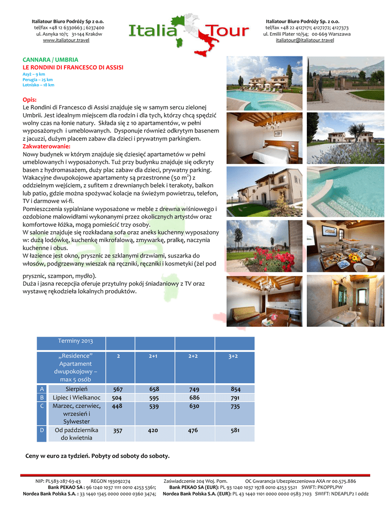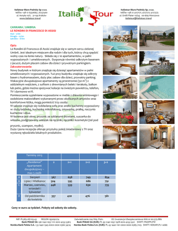 Italiatour Biuro Podróży Sp z o.o. tel/fax +48 12 6330663 ; 6237400 ul. Asnyka 10/1; 31-144 Kraków www.italiatour.travel Italiatour Biuro Podróży Sp. z o.o. tel/fax +48 22 4127171; 4127272; 4127373 ul. Emilii Plater 10/54; 00-669 Warszawa [email protected] CANNARA / UMBRIA LE RONDINI DI FRANCESCO DI ASSISI Asyż – 9 km Perugia – 25 km Lotnisko – 18 km Opis: Le Rondini di Francesco di Assisi znajduje się w samym sercu zielonej Umbrii. Jest idealnym miejscem dla rodzin i dla tych, którzy chcą spędzić wolny czas na łonie natury. Składa się z 10 apartamentów, w pełni wyposażonych i umeblowanych. Dysponuje również odkrytym basenem z jacuzzi, dużym placem zabaw dla dzieci i prywatnym parkingiem. Zakwaterowanie: Nowy budynek w którym znajduje się dziesięć apartametów w pełni umeblowanych i wyposażonych. Tuż przy budynku znajduje się odkryty basen z hydromasażem, duży plac zabaw dla dzieci, prywatny parking. Wakacyjne dwupokojowe apartamenty są przestronne (50 m2) z oddzielnym wejściem, z sufitem z drewnianych belek i terakoty, balkon lub patio, gdzie można spożywać kolacje na świeżym powietrzu, telefon, TV i darmowe wi-fi. Pomieszczenia sypialniane wyposażone w meble z drewna wiśniowego i ozdobione malowidłami wykonanymi przez okolicznych artystów oraz komfortowe łóżka, mogą pomieścić trzy osoby. W salonie znajduje się rozkładana sofa oraz aneks kuchenny wyposażony w: dużą lodówkę, kuchenkę mikrofalową, zmywarkę, pralkę, naczynia kuchenne i obus. W łazience jest okno, prysznic ze szklanymi drzwiami, suszarka do włosów, podgrzewany wieszak na ręczniki, ręczniki i kosmetyki (żel pod prysznic, szampon, mydło). Duża i jasna recepcjia oferuje przytulny pokój śniadaniowy z TV oraz wystawę rękodzieła lokalnych produktów. Terminy 2013 A B C D „Residence” Apartament dwupokojowy – max 5 osób 2 2+1 2+2 3+2 Sierpień Lipiec i Wielkanoc Marzec, czerwiec, wrzesień i Sylwester Od października do kwietnia 567 504 448 658 595 539 749 686 630 854 791 735 357 420 476 581 Ceny w euro za tydzień. Pobyty od soboty do soboty. NIP: PL583-287-63-43 REGON 193092274 Bank PEKAO SA : 96 1240 1037 1111 0010 4253 5361; Nordea Bank Polska S.A. : 33 1440 1345 0000 0000 0360 3474; Zaświadczenie 204 Woj. Pom. OC Gwarancja Ubezpieczeniowa AXA nr 00.575.886 Bank PEKAO SA (EUR): PL 93 1240 1037 1978 0010 4253 5521 SWIFT: PKOPPLPW Nordea Bank Polska S.A. (EUR): PL 43 1440 1101 0000 0000 0583 7103 SWIFT: NDEAPLP2 I oddz Italiatour Biuro Podróży Sp z o.o. tel/fax +48 12 6330663 ; 6237400 ul. Asnyka 10/1; 31-144 Kraków www.italiatour.travel Italiatour Biuro Podróży Sp. z o.o. tel/fax +48 22 4127171; 4127272; 4127373 ul. Emilii Plater 10/54; 00-669 Warszawa [email protected] Cena zawiera: pościel, ręczniki w łazience i kuchni, zużycie wody, elektryczności, gazu, sprzątanie końcowe, po tygodniu i sprzątanie w czasie tygodnia (dotyczy pobytów minimum 7 dniowych), Wi-Fi, kołyskę (na życzenie w momencie rezerwacji), korzystanie z basenu, placu zabaw i parkingu. „Śniadanie śródziemnomorskie” dostępne jest na życzenie od 8.30 do 10.30 – 6 € za osobę. Dzieci od 0 do 3 lat bezpłatnie, od 4 do 12 lat – 3 €. Terminy 2013 HB – max 5 osób 2 dorosłych 2 dorosłych + dziecko 2 dorosłych +2 dzieci 2 dorosłych + 3 dzieci A Sierpień B Lipiec i Wielkanoc Marzec, czerwiec, wrzesień i Sylwester Od października do kwietnia 133 833 161 1.015 189 1.197 123 770 151 952 179 1.134 113 714 141 896 169 1.078 98 623 121 777 144 924 217 1.393 207 1.330 197 1.274 172 1.120 C D Ceny podane są w Euro. Pierwsza cena dotyczy pobytu za dzień, druga pobytu tygodniowego. Cena zawiera: pościel, ręczniki w łazience i kuchni, zużycie wody, elektryczności, gazu, sprzątanie końcowe, po tygodniu i sprzątanie w czasie tygodnia (dotyczy pobytów minimum 7 dniowych), Wi-Fi, kołyskę (na życzenie w momencie rezerwacji), korzystanie z basenu, placu zabaw i parkingu + śniadanie, obiad i kolacja w restauracji. Restauracja „Hazienda” oferuje kuchnię typową dla Umbrii. Check-in – 16.00 – 19.30 Check-out do 10.30 Pobyt minimum 2 noce: ogrzewanie/ klimatyzacja i sprzątanie końcowe gratis ( w przeciwnym razie – ogrzewanie/klimatyzacja 10 € dziennie, sprzątanie końcowe 50 €) Pobyt przynajmniej 1 tydzień, przyjazd i wyjazd w sobotę – gratis jedna noc, sprzątanie końcowe i jedno sprzątanie w trakcie tygodnia Pobyt przynajmniej 2 tygodnie, przyjazd i wyjazd w sobotę – końcowy rabat 10% Klimatyzacja i ogrzewanie wliczone w cenę. Dostępne na życzenie: Pranie pościeli i ręczników – 3 € za osobę, minimum 6 Sprzątanie dodatkowe – 30 € za pokój NIP: PL583-287-63-43 REGON 193092274 Bank PEKAO SA : 96 1240 1037 1111 0010 4253 5361; Nordea Bank Polska S.A. : 33 1440 1345 0000 0000 0360 3474; Zaświadczenie 204 Woj. Pom. OC Gwarancja Ubezpieczeniowa AXA nr 00.575.886 Bank PEKAO SA (EUR): PL 93 1240 1037 1978 0010 4253 5521 SWIFT: PKOPPLPW Nordea Bank Polska S.A. (EUR): PL 43 1440 1101 0000 0000 0583 7103 SWIFT: NDEAPLP2 I oddz