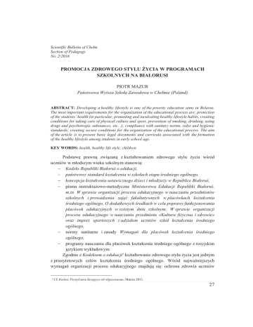 Scientific Bulletin of Chełm Section of Pedagogy No. 2/2016 PROMOCJA ZDROWEGO STYLU ŻYCIA W PROGRAMACH SZKOLNYCH NA BIAŁORUSI PIOTR MAZUR Państwowa Wyższa Szkoła Zawodowa w Chełmie (Poland) ABSTRACT: Developing a healthy lifestyle is one of the priority education aims in Belarus. The most important requirements for the organization of the educational process are: protection of the students’ health (in particular, promoting and inculcating healthy lifestyle habits, creating conditions for taking care of physical culture and sport, prevention of smoking, drinking, using drugs and psychotropic substances, etc. .); compliance with sanitary norms, rules and hygienic standards; creating secure conditions for the organization of the educational process. The aim of the article is to present basic legal documents and curricula associated with the formation of the healthy lifestyle among students in early school age. KEY WORDS: health, healthy life style, children Podstawę prawną związaną z kształtowaniem zdrowego stylu życia wśród uczniów w młodszym wieku szkolnym stanowią: - Kodeks Republiki Białoruś o edukacji, - państwowy standard kształcenia w szkołach etapu średniego ogólnego, - koncepcja kształcenia ustawicznego dzieci i młodzieży w Republice Białoruś, - pisma instruktażowo-metodyczne Ministerstwa Edukacji Republiki Białoruś, m.in. W sprawie organizacji procesu edukacyjnego w nauczaniu przedmiotów szkolnych i prowadzenia zajęć fakultatywnych w placówkach kształcenia średniego ogólnego, O dodatkowych środkach w celu poprawy funkcjonowania placówek edukacyjnych w szóstym dniu szkolnym; W sprawie organizacji procesu edukacyjnego w nauczaniu przedmiotu «Kultura fizyczna i zdrowie» oraz imprez sportowych z udziałem uczniów szkół kształcenia średniego ogólnego, - normy sanitarne i zasady Wymagań dla placówek kształcenia średniego ogólnego, - programy nauczania dla placówek kształcenia średniego ogólnego z rosyjskim językiem wykładowym. Zgodnie z Kodeksem o edukacji1 kształtowanie zdrowego stylu życia jest jednym z priorytetowych celów kształcenia średniego ogólnego. Wśród najważniejszych wymagań organizacji procesu edukacyjnego znajdują się: ochrona zdrowia uczniów 1 Cf. Кодекс Республики Беларусь об образовании, Минск 2011. 27 (w szczególności promocja i wpajanie nawyków zdrowego stylu życia, stwarzanie warunków do dbania o kulturę fizyczną i uprawiania sportu, zapobieganie i zwalczanie palenia tytoniu, picia alkoholu, sięgania po narkotyki, substancje psychotropowe, ich odpowiedniki, środki toksyczne i inne substancje odurzające itd.); przestrzeganie norm sanitarnych, zasad i standardów higienicznych; tworzenie bezpiecznych warunków dla organizacji procesu edukacyjnego. Według Kodeksu zrozumienie wartości i nawyków zdrowego stylu życia jest kluczowym zadaniem współczesnej edukacji. Elementem samowychowania jest też wpojenie młodym kultury zdrowego stylu życia, ukierunkowane na: kształtowanie odpowiednich nawyków, postrzeganie zdrowia jako wartości, samodoskonalenie fizyczne. W państwowym standardzie dotyczącym nauczania w szkołach kształcenia średniego ogólnego istotnym celem jest wdrażanie świadomości prowadzenia zdrowego stylu życia i bezpiecznego zachowania2. Wśród zadań, zapewniających osiągnięcie takiego celu, wymienione są: stworzenie warunków do rozwoju fizycznego uczniów; ochrona i wzmocnienie stanu zdrowia fizycznego i psychicznego uczniów; wpajanie starannego i odpowiedzialnego podejścia do własnego zdrowia i zdrowia innych osób; kształtowanie nawyków związanych z higieną; propagowanie doświadczeń zdrowego stylu życia i bezpiecznych zachowań. Takie cele i zadania określają również podstawowe wymagania co do poziomu przygotowania uczniów w szkole ogólnej: znajomość i korzystanie z zasad higieny, zdrowego stylu życia i bezpiecznych zachowań, starannego i odpowiedzialnego podejścia do własnego zdrowia i zdrowia innych osób (klasy I–IV); znajomość podstaw i doświadczenie związane z bezpieczeństwem i zdrowym trybem życia (V klasa). Najdokładniej kwestie kształtowania zdrowego stylu życia wśród uczniów przedstawione są w koncepcji kształcenia ustawicznego dzieci i młodzieży w Republice Białoruś3. Zgodnie z tym dokumentem zdrowy styl życia przejawia się nie tylko w stosunku do swojego zdrowia czy innych osób, ale również w wartościach i zrozumieniu własnej odpowiedzialności za zdrowie przyszłych pokoleń. Istotne jest też budowanie umiejętności odrzucania szkodliwych dla zdrowia form zachowań, kształtowanie nawyków higieny osobistej, profilaktyka (tj. wzmacnianie stanu zdrowia). W Koncepcji zaprezentowano, iż podstawa pracy wychowawczej, związanej z kształtowaniem zdrowego stylu życia, powinna być nakierowana na: zrozumienie przez uczniów, jak szerokim pojęciem jest „zdrowie”; postrzeganie go jako wartości uniwersalnej i osobistej; wpajanie starannego i odpowiedzialnego podejścia do własnego zdrowia i zdrowia innych osób; przygotowanie do zajęć w kółkach i sekcjach sportowych; kształtowanie kultury odżywiania, pracy i wypoczynku; zapobieganie szkodliwym uzależnieniom. 2 Cf. Образовательный стандарт «Общее среднее образование. Основные нормативы и требования», „Вестник образования: ежемесячный научно-практический и информационно-методический журнал” 2008, nr 12, s. 319. 3 Cf. Концепция непрерывного воспитания детей и учащейся молодежи в Республике Беларусь: Постановление Министерства образования РБ 14.12.2006 nr 125, Сборник нормативных документов Минист