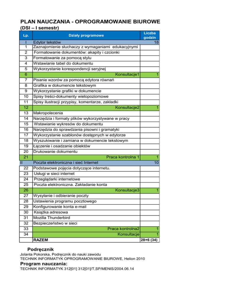 PLAN NAUCZANIA - OPROGRAMOWANIE BIUROWE (DSI – I semestr) Działy programowe Lp. I 1 2 3 4 5 6 7 8 9 10 11 12 13 14 15 16 17 18 19 20 21 II 22 23 24 25 26 27 28 29 30 31 32 33 34 Liczba godzin Edytor tekstów 18 Zaznajomienie słuchaczy z wymaganiami edukacyjnymi Formatowanie dokumentów: akapity i czcionki Formatowanie za pomocą stylu Wstawianie tabel do dokumentu Wykorzystanie korespondencji seryjnej Konsultacje1 1 Pisanie wzorów za pomocą edytora równań Grafika w dokumencie tekstowym Wykorzystanie grafiki w dokumencie Spisy treści-dokumenty wielopoziomowe Spisy ilustracji przypisy, komentarze, zakładki Konsultacje2 1 Makropolecenia Narzędzia i formaty plików wykorzystywane w pracy biurowej Wstawianie wykresów do dokumentu Narzędzia do sprawdzania pisowni i gramatyki Wykorzystanie szablonów dostępnych w edytorze tekstów Wyszukiwanie i zamiana w dokumencie tekstowym Łączenie i osadzanie obiektów Drukowanie dokumentu Praca kontrolna 1 1 Poczta elektroniczna i sieć Internet 10 Podstawowe pojęcia dotyczące internetu. Usługi w sieci internet Przeglądarki internetowe Poczta elektroniczna. Zakładanie konta Konsultacje3 1 Wysyłanie i odbieranie poczty Ustawienia programu pocztowego Konfigurowanie konta e-mail Książka adresowa Mozilla Thunderbird Bezpieczeństwo w sieci Praca kontrolna2 1 Konsultacje 1 28+6 (34) RAZEM Podręcznik Jolanta Pokorska, Podręcznik do nauki zawodu TECHNIK INFORMATYK OPROGRAMOWANIE BIUROWE, Helion 2010 Program nauczania: TECHNIK INFORMATYK 312[01] 312[01]/T,SP/MENIS/2004.06.14
