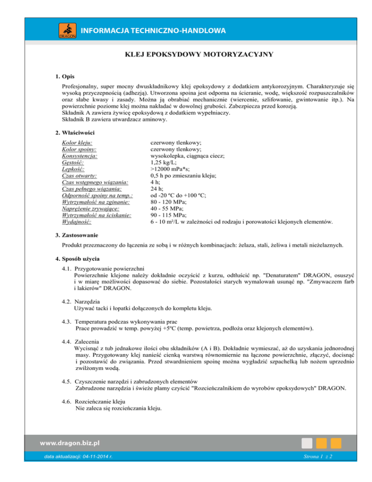porządzona zgodnie z Rozporządzeniem REACH 1907/2006 z późniejszymi zmianami Sporządzona zgodnie z Rozporządzeniem (WE) nr 1907/2006 z późniejszymi zmianami KLEJ EPOKSYDOWY MOTORYZACYJNY 1. Opis Profesjonalny, super mocny dwuskładnikowy klej epoksydowy z dodatkiem antykorozyjnym. Charakteryzuje się wysoką przyczepnością (adhezją). Utworzona spoina jest odporna na ścieranie, wodę, większość rozpuszczalników oraz słabe kwasy i zasady. Można ją obrabiać mechanicznie (wiercenie, szlifowanie, gwintowanie itp.). Na powierzchnie poziome klej można nakładać w dowolnej grubości. Zabezpiecza przed korozją. Składnik A zawiera żywicę epoksydową z dodatkiem wypełniaczy. Składnik B zawiera utwardzacz aminowy. 2. Właściwości Kolor kleju: Kolor spoiny: Konsystencja: Gęstość: Lepkość: Czas otwarty: Czas wstępnego wiązania: Czas pełnego wiązania: Odporność spoiny na temp.: Wytrzymałość na zginanie: Naprężenie zrywające: Wytrzymałość na ściskanie: Wydajność: czerwony tlenkowy; czerwony tlenkowy; wysokolepka, ciągnąca ciecz; 1,25 kg/L; >12000 mPa*s; 0,5 h po zmieszaniu kleju; 4 h; 24 h; od -20 ºC do +100 ºC; 80 - 120 MPa; 40 - 55 MPa; 90 - 115 MPa; 6 - 10 m²/L w zależności od rodzaju i porowatości klejonych elementów. 3. Zastosowanie Produkt przeznaczony do łączenia ze sobą i w różnych kombinacjach: żelaza, stali, żeliwa i metali nieżelaznych. 4. Sposób użycia 4.1. Przygotowanie powierzchni Powierzchnie klejone należy dokładnie oczyścić z kurzu, odtłuścić np. "Denaturatem" DRAGON, osuszyć i w miarę możliwości dopasować do siebie. Pozostałości starych wymalowań usunąć np. "Zmywaczem farb i lakierów" DRAGON. 4.2. Narzędzia Używać tacki i łopatki dołączonych do kompletu kleju. 4.3. Temperatura podczas wykonywania prac Prace prowadzić w temp. powyżej +5ºC (temp. powietrza, podłoża oraz klejonych elementów). 4.4. Zalecenia Wycisnąć z tub jednakowe ilości obu składników (A i B). Dokładnie wymieszać, aż do uzyskania jednorodnej masy. Przygotowany klej nanieść cienką warstwą równomiernie na łączone powierzchnie, złączyć, docisnąć i pozostawić do związania. Przed stwardnieniem spoinę można wygładzić szpachelką lub nożem uprzednio zwilżonym wodą. 4.5. Czyszczenie narzędzi i zabrudzonych elementów Zabrudzone narzędzia i świeże plamy czyścić "Rozcieńczalnikiem do wyrobów epoksydowych" DRAGON. 4.6. Rozcieńczanie kleju Nie zaleca się rozcieńczania kleju. data aktualizacji: 04-11-2014 r. Strona 1 z 2 porządzona zgodnie z Rozporządzeniem REACH 1907/2006 z późniejszymi zmianami Sporządzona zgodnie z Rozporządzeniem (WE) nr 1907/2006 z późniejszymi zmianami 4.7. Ograniczenia i uwagi Należy szczególnie uważać aby nie pomylić nakrętek. Wiązanie kleju można przyspieszyć ogrzewając połączenie ciepłym powietrzem. 5. Gramatura Kod towaru DKM018/BL Gramatura 2*18 ml Typ opakowania tuba blistrowana 6. Okres ważności 1 rok 7. Uwagi Warunki transportowania i magazynowania: Transportować i przechowywać w szczelnie zamkniętym, oryginalnym opakowaniu w temp. od 0 ºC do +30 ºC. Chronić przed dziećmi. Pozostałe uwagi: W trakcie prowadzenia prac oraz po ich zakończeniu pomieszczenie należy intensywnie wietrzyć, aż do zaniku charakterystycznego zapachu. Nie klei PP, PE, PTFE. Klej nie jest klejem konstrukcyjnym, nie jest przeznaczony do przenoszenia znacznych naprężeń. Przed zastosowaniem sprawdzić działanie kleju na klejone elementy. Mieszanina ta spełnia kryteria klasyfikacji jako niebezpieczna zgodnie z rozporządzeniem dyrektywy 1999/45/WE Parlamentu Europejskiego i Rady z dnia 31 maja 1999 r. w sprawie zbliżenia przepisów ustawowych, wykonawczych i administracyjnych Państw Członkowskich odnoszących się do klasyfikacji, pakowania i etykietowania preparatów niebezpiecznych, w związku z czym jest dla niej sporządzona karta charakterystyki zgodnie z Rozporządzeniem (WE) Nr 1907/2006 Parlamentu Europejskiego i Rady z dnia 18 grudnia 2006 roku w sprawie rejestracji, oceny, udzielania zezwoleń i stosowanych ograniczeń w zakresie chemikaliów (REACH), utworzenia Europejskiej Agencji Chemikaliów, zmieniające dyrektywę 1999/45/WE oraz uchylające rozporządzenie Rady (EWG) nr 793/93 i rozporządzenie Komisji (WE) nr 1488/94, jak również dyrektywę Rady 76/769/EWG i dyrektywy Komisji 91/155/EWG, 93/67/EWG, 93/105/WE i 2000/21/WE. data aktualizacji: 04-11-2014 r. Strona 2 z 2