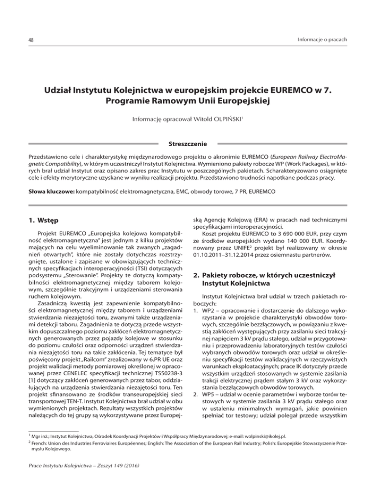 Informacje o pracach 48 Udział Instytutu Kolejnictwa w europejskim projekcie EUREMCO w 7. Programie Ramowym Unii Europejskiej Informację opracował Witold OLPIŃSKI1 Streszczenie Przedstawiono cele i charakterystykę międzynarodowego projektu o akronimie EUREMCO (European Railway ElectroMagnetic Compatibility), w którym uczestniczył Instytut Kolejnictwa. Wymieniono pakiety robocze WP (Work Packages), w których brał udział Instytut oraz opisano zakres prac Instytutu w poszczególnych pakietach. Scharakteryzowano osiągnięte cele i efekty merytoryczne uzyskane w wyniku realizacji projektu. Przedstawiono trudności napotkane podczas pracy. Słowa kluczowe: kompatybilność elektromagnetyczna, EMC, obwody torowe, 7 PR, EUREMCO 1. Wstęp Projekt EUREMCO „Europejska kolejowa kompatybilność elektromagnetyczna” jest jednym z kilku projektów mających na celu wyeliminowanie tak zwanych „zagadnień otwartych”, które nie zostały dotychczas rozstrzygnięte, ustalone i zapisane w obowiązujących technicznych specyfikacjach interoperacyjności (TSI) dotyczących podsystemu „Sterowanie”. Projekty te dotyczą kompatybilności elektromagnetycznej między taborem kolejowym, szczególnie trakcyjnym i urządzeniami sterowania ruchem kolejowym. Zasadniczą kwestią jest zapewnienie kompatybilności elektromagnetycznej między taborem i urządzeniami stwierdzania niezajętości toru, zwanymi także urządzeniami detekcji taboru. Zagadnienia te dotyczą przede wszystkim dopuszczalnego poziomu zakłóceń elektromagnetycznych generowanych przez pojazdy kolejowe w stosunku do poziomu czułości oraz odporności urządzeń stwierdzania niezajętości toru na takie zakłócenia. Tej tematyce był poświęcony projekt „Railcom” zrealizowany w 6.PR UE oraz projekt walidacji metody pomiarowej określonej w opracowanej przez CENELEC specyfikacji technicznej TS50238-3 [1] dotyczący zakłóceń generowanych przez tabor, oddziałujących na urządzenia stwierdzania niezajętości toru. Ten projekt sfinansowano ze środków transeuropejskiej sieci transportowej TEN-T. Instytut Kolejnictwa brał udział w obu wymienionych projektach. Rezultaty wszystkich projektów należących do tej grupy są wykorzystywane przez Europej- 1 2 ską Agencję Kolejową (ERA) w pracach nad technicznymi specyfikacjami interoperacyjności. Koszt projektu EUREMCO to 3 690 000 EUR, przy czym ze środków europejskich wydano 140 000 EUR. Koordynowany przez UNIFE2 projekt był realizowany w okresie 01.10.2011–31.12.2014 przez osiemnastu partnerów. 2. Pakiety robocze, w których uczestniczył Instytut Kolejnictwa Instytut Kolejnictwa brał udział w trzech pakietach roboczych: 1. WP2 – opracowanie i dostarczenie do dalszego wykorzystania w projekcie charakterystyki obwodów torowych, szczególnie bezzłączowych, w powiązaniu z kwestią zakłóceń występujących przy zasilaniu sieci trakcyjnej napięciem 3 kV prądu stałego, udział w przygotowaniu i przeprowadzeniu laboratoryjnych testów czułości wybranych obwodów torowych oraz udział w określeniu specyfikacji testów walidacyjnych w rzeczywistych warunkach eksploatacyjnych; prace IK dotyczyły przede wszystkim urządzeń stosowanych w systemie zasilania trakcji elektrycznej prądem stałym 3 kV oraz wykorzystania bezzłączowych obwodów torowych. 2. WP5 – udział w ocenie parametrów i wyborze torów testowych w systemie zasilania 3 kV prądu stałego oraz w ustaleniu minimalnych wymagań, jakie powinien spełniać tor testowy; udział polegał przede wszystkim Mgr inż.; Instytut Kolejnictwa, Ośrodek Koordynacji Projektów i Współpracy Międzynarodowej; e-mail: [email protected]. French: Union des Industries Ferroviaires Européennes; English: The Association of the European Rail Industry; Polish: Europejskie Stowarzyszenie Przemysłu Kolejowego. Prace Instytutu Kolejnictwa – Zeszyt 149 (2016) Informacje o pracach na zapoznawaniu się z projektami raportów i zgłaszaniu uwag do wersji wstępnych raportów z zadań 5.2 [3], 5.3 [4] i 5.4 [5] przygotowywanych przez partnera uczestniczącego w projekcie – firmę ALSTOM. 3. WP6 – udział w analizie zakłóceń generowanych przez tabor trakcyjny oraz obowiązujących wymagań dotyczących tego taboru, udział w opracowaniu wymagań dotyczących nowego taboru pod względem kompatybilności elektromagnetycznej z urządzeniami detekcji taboru oraz przeprowadzenie jednej z zaplanowanych narodowych serii pomiarów zakłóceń od taboru trakcyjnego na liniach niezelektryfikowanych, uzyskanie danych z pozostałych takich kampanii oraz opracowanie raportu D6.3 [6]z tych kampanii. Tylko dwa pierwsze wymienione zadania, należące do pakietu roboczego WP2 wykonano w pierwszym okresie sprawozdawczym projektu, to jest do marca 2013 roku włącznie. Realizacja większości pozostałych zadań została rozpoczęta w pierwszym okresie sprawozdawczym i była kontynuowana w drugim okresie, trwającym od kwietnia 2013 r. Ponieważ nie zostały one zakończone przed końcem 2013 r., w 2014 roku nadal były realizowane wszystkie przewidziane dla IK zadania wchodzące w skład pakietów roboczych WP2, WP5 i WP6. 3. Zadania zrealizowane przez Instytut Kolejnictwa Zasadniczym zadaniem realizowanym przez IK w 2014 roku było przeprowadzenie wszystkich czynności przewidzianych w opisie zadania nr 6.3 pakietu roboczego WP6. Zgodnie z przyjętym opisem realizacji projektu, Instytut Kolejnictwa pełnił rolę lidera tego zadania i do zakresu jego obowiązków należało zebranie odpowiednich informacji od pozostałych partnerów uczestniczących w jego realizacji i sporządzenie raportu końcowego z przeprowadzonych działań, określonego jako raport nr D6.3 [6]. W pierwszej kolejności IK prowadził rozpoznanie możliwości pozyskania na czas badań kilku jednakowych wagonów o wymaganych parametrach oraz lokomotywy z generatorem prądu do celów zasilania magistrali pociągowej, wykorzystywanej do zasilania urządz
