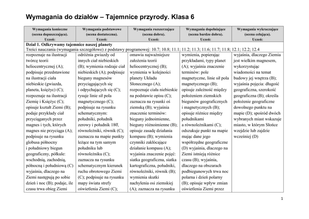 Wymagania do działów – Tajemnice przyrody. Klasa 6 Wymagania konieczne (ocena dopuszczająca). Uczeń: Wymagania podstawowe (ocena dostateczna). Uczeń: Wymagania rozszerzające (ocena dobra). Uczeń: Wymagania dopełniające (ocena bardzo dobra). Uczeń: Wymagania wykraczające (ocena celująca). Uczeń: Dział 1. Odkrywamy tajemnice naszej planety Treści nauczania (wymagania szczegółowe) z podstawy programowej: 10.7; 10.8; 11.1; 11.2; 11.3; 11.6; 11.7; 11.8; 12.1; 12.2; 12.4 rozpoznaje na ilustracji odróżnia gwiazdy od omawia najważniejsze wymienia, popierając wyjaśnia, dlaczego Ziemia twórcę teorii innych ciał niebieskich założenia teorii przykładami, typy planet jest wielkim magnesem, heliocentrycznej (A); (B); wymienia rodzaje ciał heliocentrycznej (B); (A); wyjaśnia znaczenie wykorzystując podpisuje przedstawione niebieskich (A); podpisuje wymienia w kolejności terminów: pole wiadomości na temat na ilustracji ciała bieguny magnesów planety Układu magnetyczne, linie sił pola budowy jej wnętrza (B); niebieskie (gwiazda, przyciągających się Słonecznego (A); magnetycznego (B); wyjaśnia pojęcia: długość planeta, księżyc) (C); i odpychających się (C); rozpoznaje ciała niebieskie opisuje zależność między geograficzna, szerokość rozpoznaje na ilustracji rysuje linie sił pola na podstawie opisu (C); położeniem ziemskich geograficzna (B); określa Ziemię i Księżyc (C); magnetycznego (C); zaznacza na rysunki oś biegunów geograficznych położenie geograficzne opisuje kształt Ziemi (B); podpisuje na rysunku ziemską (B); wyjaśnia i magnetycznych (B); dowolnego punktu na podaje przykłady ciał schematycznym: znaczenie terminów: opisuje różnice między mapie (D); spośród dwóch przyciąganych przez południki, południk bieguny jednoimienne, południkami wybranych miast wskazuje magnes i tych, których zerowy i południk 180̊, bieguny różnoimienne (B); a równoleżnikami (C); miasto, w którym Słońce magnes nie przyciąga (A); równoleżniki, równik (C); opisuje zasadę działania odszukuje punkt na mapie wzejdzie lub zajdzie podpisuje na rysunku zaznacza na mapie punkty kompasu (B); wymienia mając dane jego wcześniej (D) globusa północny leżące na tym samym czynniki zakłócające współrzędne geograficzne i południowy biegun południku lub działanie kompasu (A); (D) wyjaśnia, dlaczego na geograficzny, półkule: równoleżniku (C); wyjaśnia znaczenie pojęć: Ziemi istnieją różnice wschodnią, zachodnią, zaznacza na rysunku siatka geograficzna, siatka czasu (B); wyjaśnia, północną i południową (C) schematycznym kierunek kartograficzna, południki, dlaczego na obszarach wyjaśnia, dlaczego na ruchu obrotowego Ziemi równoleżniki, równik (B); podbiegunowych trwa noc Ziemi następują po sobie (C); podpisuje na rysunku wymienia skutki polarna i dzień polarny dzień i noc (B); podaje, ile mapy świata strefy nachylenia osi ziemskiej (B); opisuje wpływ zmian czasu trwa obieg Ziemi oświetlenia Ziemi (C); (A); zaznacza na rysunku oświetlenia Ziemi przez 1 Wymagania do działów – Tajemnice przyrody. Klasa 6 Wymagania konieczne (ocena dopuszczająca). Uczeń: Wymagania podstawowe (ocena dostateczna). Uczeń: dookoła Słońca (A); wymienia daty rozpoczęcia kalendarzowych pór roku (A); podpisuje na rysunkach zwrotniki Raka i Koziorożca, równik i koła podbiegunowe (C); wymienia nazwy wszystkich ,kontynentów i trzech oceanów na kuli ziemskiej (A); opisuje odkrycie Krzysztofa Kolumba (A) wymienia nazwy oceanów (A); zaznacza na mapie trasę wyprawy morskiej Ferdynanda Magellana (C) Wymagania rozszerzające (ocena dobra). Uczeń: Wymagania dopełniające (ocena bardzo dobra). Uczeń: oświetlenie Ziemi w dniach tzw. przesileń (C); opisuje rolę oceanu jako magazynu żywności i źródła surowców mineralnych (B); wymienia przyczyny wielkich odkryć geograficznych (A) Słońce na warunki życia organizmów (B); opisuje poznane kontynenty (B); zaznacza na mapie portugalską drogę wschodnią i zachodni szlak hiszpański (C) Wymagania wykraczające (ocena celująca). Uczeń: Dział 2. Poznajemy zjawiska fizyczne Treści nauczania (wymagania szczegółowe) z podstawy programowej: 8.6; 8.7; 8.8; 8.9; 8.10; 9.5; 10.1; 10.2; 10.3; 10.4; 10.5; 10.6; 11.4; 11.5; 15.1; 15.2; 15.3 na podstawie rysunku toru wyjaśnia, czym jest ruch wyjaśnia, czym jest układ oblicza drogę, czas, mając wykonuje obliczenia rozpoznaje ruch ciał (B); charakteryzuje odniesienia (B); wyjaśnia, podane pozostałe wymagające przeliczania prostoliniowy wielkości opisujące ruch: na czym polega wielkości opisujące ruch jednostek prędkości (D); i krzywoliniowy (C); prędkość, drogę i czas (B); względność ruchu (B); (D); wyjaśnia, od czego opisuje przystosowania podaje przykłady wyjaśnia pojęcie: siła oblicza prędkość zależy siła tarcia (B); budowy zewnętrznej występowania siły tarcia oporu (B); opisuje poruszającego się ciała porównuje siły oporu zwierząt służące (A); wymienia czynniki, wzajemne oddziaływanie (C); wymienia sposoby powietrza i wody (C); zmniejszaniu siły oporu od których zależy ładunków o takich samych zwiększania i zmniejszania wyjaśnia, czym są ich ruchu (B); wyjaśnia, 2 Wymagania do działów – Tajemnice przyrody. Klasa 6 Wymagania konieczne (ocena dopuszczająca). Uczeń: Wymagania podstawowe (ocena dostateczna). Uczeń: Wymagania rozszerzające (ocena dobra). Uczeń: Wymagania dopełniające (ocena bardzo dobra). Uczeń: Wymagania wykraczające (ocena celująca). Uczeń: wielkość siły oporu (A); podaje przykłady elektryzowania ciał (B); podaje przykłady odbiorników prądu (A); rysuje schemat prostego obwodu elektrycznego (C); wymienia zasady bezpiecznego i oszczędnego korzystania z energii elektrycznej (A); podaje przykłady sztucznych źródeł światła (A); podaje cechy obrazu zaobserwowanego przez camerę obscurę (B); rysuje schemat odbicia promieni świ