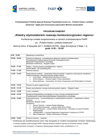 Przedsięwzięcie Polskiej Agencji Rozwoju Przedsiębiorczości pn. „Polskie klastry i polityka klastrowa” objęte jest honorowym patronatem Ministra Gospodarki PROGRAM RAMOWY „Klastry stymulatorem rozwoju konkurencyjności regionu” Konferencja została zorganizowana w ramach przedsięwzięcia PARP pn. „Polskie klastry i polityka klastrowa”. Zielona Góra, 8 listopada 2011, RUBEN HOTEL, Aleja Konstytucji 3 Maja 1 A, godz. 9:30 – 16:00 9:30 - 10:00 Rejestracja uczestników 10:00 – 10:20 Otwarcie konferencji - przedstawienie głównych założeń przedsięwzięcia: Przedstawiciel Polskiej Agencji Rozwoju Przedsiębiorczości Marszałek Województwa Lubuskiego Moderator konferencji – Brygida Cupiał 10:20 – 11:00 Klastry - szansą rozwoju przedsiębiorstw i regionu Andris Spulis - G3 Consulting SIA 11:00 – 11:20 Przerwa kawowa 11.20 – 12.30 Sesja dobrych praktyk – prezentacja dobrych praktyk z zagranicy dotyczących współpracy międzynarodowej i internacjonalizacji działań klastra Ivars Eniņš – Metalworking Industries of Latvia Andris Klepers – Vidzeme region Turism association Marins Barkans – Association of Latvian Vinegrowers and Winemakers of Latvian 12:20 – 12:30 Pytania do gości zagranicznych 12:30 – 13:15 Klastry stymulatorem rozwoju konkurencyjności regionu – Brygida Cupiał 13:15 – 14:00 Lunch / wystawa 14:00 – 14:30 Działania Województwa Lubuskiego na rzecz rozwoju przedsiębiorczości Przedstawiciel Urzędu Marszałkowskiego Województwa Lubuskiego 14:30 – 15:00 Panel dyskusyjny – rozwój klasteringu w województwie lubuskim – oczekiwania, bariery, korzyści. Moderator: Brygida Cupiał Uczestnicy: Janusz Gramza - Lubuski Klaster Metalowy Przemysław Karwowski - Lubuski Szlak Wina i Miodu Henryk Piekarski - Lubuski Klaster Szkoleniowo - Doradczy na rzecz Produktu Regionalnego Jadwiga Błoch - Lubuska Regionalna Organizacja Turystyczna LOTUR Marcin Bąkowski - Klaster Archiwizacji Cyfrowej 15:00 – 16:00 Przerwa kawowa – wystawa Konferencja jest współfinansowana przez Unię Europejską ze środków Europejskiego Funduszu Społecznego w ramach projektu systemowego PARP „Rozwój zasobów ludzkich poprzez promowanie wiedzy, transfer i upowszechnianie innowacji” z Programu Operacyjnego Kapitał Ludzki, poddziałanie 2.1.3. Organizatorem konferencji jest Polska Agencja Miejsce spotkania: Rozwoju Przedsiębiorczości we współpracy RUBEN HOTEL z Urzędem Aleja Konstytucji 3 Maja 1A Marszałkowskim Województwa 65-805 Zielona Góra Lubuskiego. Konferencja odbywa się pod honorowym patronatem Marszałka Województwa Lubuskiego. Konferencja organizowana jest w ramach przedsięwzięcia „Polskie klastry i polityka klastrowa”, którego głównym celem jest wzmocnienie polskich klastrów, podniesienie ich konkurencyjności i zdolności innowacyjnej poprzez rozwój kapitału ludzkiego oraz poprzez podniesienie efektywności kształtowania Źródło: http://maps.google.pl/ polityki klastrowej. W trakcie konferencji dystrybuowane będą darmowe katalogi prezentujące klastry z województwa lubuskiego. Organizator spotkania zapewnia tłumaczenie symultaniczne, poczęstunek w trakcie przerw kawowych oraz lunch. Równolegle z konferencją odbywać się będą targi, na których klastry z regionu zaprezentują Rejestracja: www.klastry.f5.pl swoją działalność. Prośba o potwierdzenie udziału/Dodatkowe Lista wystawców: informacje: 1. Lubuski Klaster Metalowy tel.: (061) 85 66 960 2. Lubuski Szlak Wina i Miodu e-mail: [email protected] 3. Lubuski Klaster Szkoleniowo - Doradczy na rzecz Produktu Regionalnego 4. Lubuska Regionalna Organizacja Turystyczna LOTUR 5. Klaster Archiwizacji Cyfrowej Zapraszamy również do odwiedzenia strony: http://www.pi.gov.pl/klastry/chapter_95353.asp
