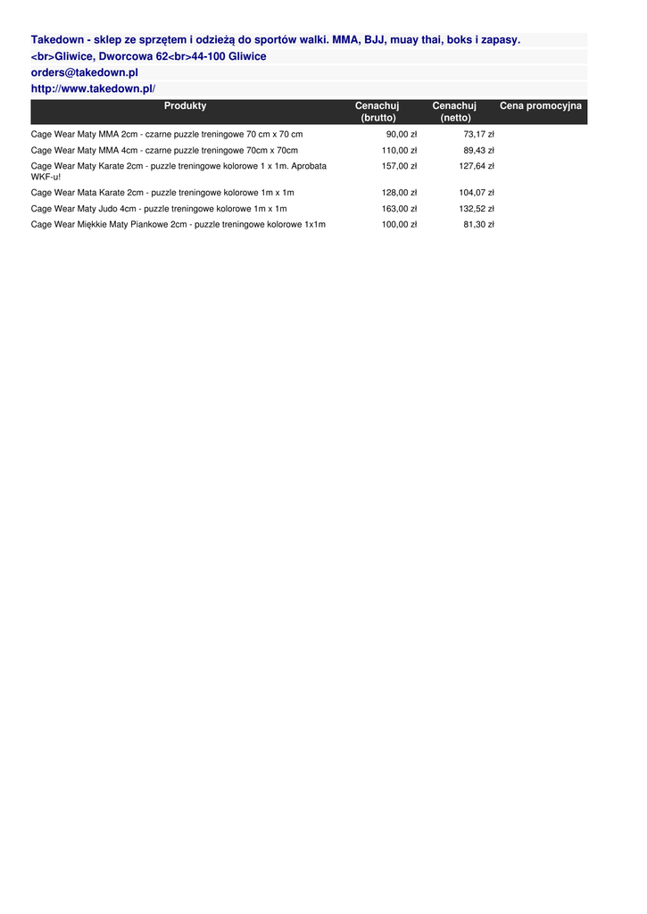 Takedown - sklep ze sprzętem i odzieżą do sportów walki. MMA, BJJ, muay thai, boks i zapasy. <br>Gliwice, Dworcowa 62<br>44-100 Gliwice [email protected] http://www.takedown.pl/ Produkty Cenachuj (brutto) Cenachuj (netto) Cage Wear Maty MMA 2cm - czarne puzzle treningowe 70 cm x 70 cm 90,00 zł 73,17 zł Cage Wear Maty MMA 4cm - czarne puzzle treningowe 70cm x 70cm 110,00 zł 89,43 zł Cage Wear Maty Karate 2cm - puzzle treningowe kolorowe 1 x 1m. Aprobata WKF-u! 157,00 zł 127,64 zł Cage Wear Mata Karate 2cm - puzzle treningowe kolorowe 1m x 1m 128,00 zł 104,07 zł Cage Wear Maty Judo 4cm - puzzle treningowe kolorowe 1m x 1m 163,00 zł 132,52 zł Cage Wear Miękkie Maty Piankowe 2cm - puzzle treningowe kolorowe 1x1m 100,00 zł 81,30 zł Cena promocyjna