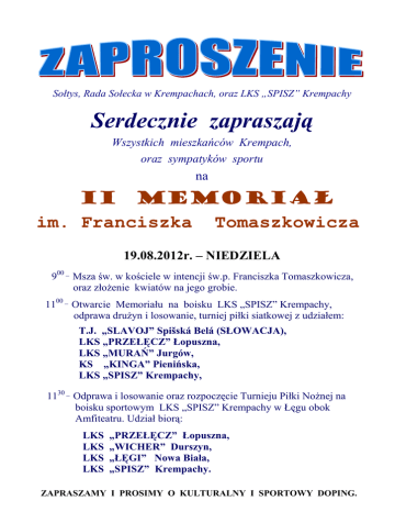 Sołtys, Rada Sołecka w Krempachach, oraz LKS „SPISZ” Krempachy Serdecznie zapraszają Wszystkich mieszkańców Krempach, oraz sympatyków sportu na II Memoriał im. Franciszka Tomaszkowicza 19.08.2012r. – NIEDZIELA 900 _ Msza św. w kościele w intencji św.p. Franciszka Tomaszkowicza, oraz złożenie kwiatów na jego grobie. 1100 _ Otwarcie Memoriału na boisku LKS „SPISZ” Krempachy, odprawa drużyn i losowanie, turniej piłki siatkowej z udziałem: T.J. „SLAVOJ” Spišská Belá (SŁOWACJA), LKS „PRZEŁĘCZ” Łopuszna, LKS „MURAŃ” Jurgów, KS „KINGA” Pienińska, LKS „SPISZ” Krempachy, 1130 _ Odprawa i losowanie oraz rozpoczęcie Turnieju Piłki Nożnej na boisku sportowym LKS „SPISZ” Krempachy w Łęgu obok Amfiteatru. Udział biorą: LKS LKS LKS LKS „PRZEŁĘCZ” Łopuszna, „WICHER” Durszyn, „ŁĘGI” Nowa Biała, „SPISZ” Krempachy. ZAPRASZAMY I PROSIMY O KULTURALNY I SPORTOWY DOPING.