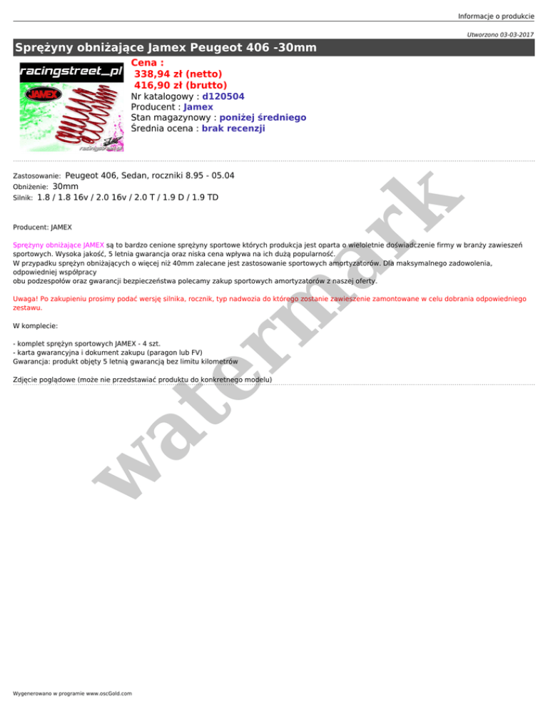 Informacje o produkcie Utworzono 03-03-2017 Sprężyny obniżające Jamex Peugeot 406 -30mm Cena : 338,94 zł (netto) 416,90 zł (brutto) Nr katalogowy : d120504 Producent : Jamex Stan magazynowy : poniżej średniego Średnia ocena : brak recenzji Peugeot 406, Sedan, roczniki 8.95 - 05.04 30mm Silnik: 1.8 / 1.8 16v / 2.0 16v / 2.0 T / 1.9 D / 1.9 TD Zastosowanie: er m ar k Obniżenie: Producent: JAMEX Sprężyny obniżające JAMEX są to bardzo cenione sprężyny sportowe których produkcja jest oparta o wieloletnie doświadczenie firmy w branży zawieszeń sportowych. Wysoka jakość, 5 letnia gwarancja oraz niska cena wpływa na ich dużą popularność. W przypadku sprężyn obniżających o więcej niż 40mm zalecane jest zastosowanie sportowych amortyzatorów. Dla maksymalnego zadowolenia, odpowiedniej współpracy obu podzespołów oraz gwarancji bezpieczeństwa polecamy zakup sportowych amortyzatorów z naszej oferty. Uwaga! Po zakupieniu prosimy podać wersję silnika, rocznik, typ nadwozia do którego zostanie zawieszenie zamontowane w celu dobrania odpowiedniego zestawu. W komplecie: - komplet sprężyn sportowych JAMEX - 4 szt. - karta gwarancyjna i dokument zakupu (paragon lub FV) Gwarancja: produkt objęty 5 letnią gwarancją bez limitu kilometrów w at Zdjęcie poglądowe (może nie przedstawiać produktu do konkretnego modelu) Wygenerowano w programie www.oscGold.com
