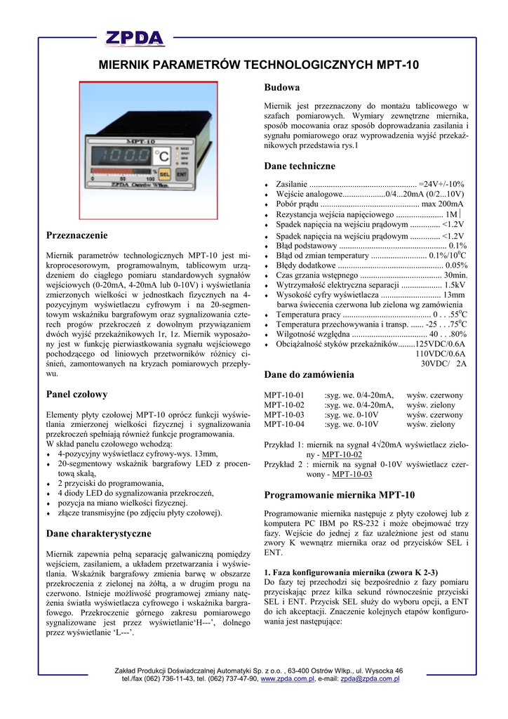 MIERNIK PARAMETRÓW TECHNOLOGICZNYCH MPT-10 Budowa Miernik jest przeznaczony do montażu tablicowego w szafach pomiarowych. Wymiary zewnętrzne miernika, sposób mocowania oraz sposób doprowadzania zasilania i sygnału pomiarowego oraz wyprowadzenia wyjść przekaźnikowych przedstawia rys.1 Dane techniczne ♦ ♦ ♦ ♦ ♦ Przeznaczenie ♦ ♦ Zasilanie .................................................. =24V+/-10% Wejście analogowe....................0/4...20mA (0/2...10V) Pobór prądu .............................................. max 200mA Rezystancja wejścia napięciowego ...................... 1MΩ Spadek napięcia na wejściu prądowym .............. <1.2V Spadek napięcia na wejściu prądowym .............. <1.2V Błąd podstawowy .................................................. 0.1% Błąd od zmian temperatury .......................... 0.1%/100C Błędy dodatkowe ................................................. 0.05% Czas grzania wstępnego ...................................... 30min. Wytrzymałość elektryczna separacji ................... 1.5kV Wysokość cyfry wyświetlacza ............................ 13mm barwa świecenia czerwona lub zielona wg zamówienia Temperatura pracy ......................................... 0 . . .550C Temperatura przechowywania i transp. ...... -25 . . .750C Wilgotność względna ................................... 40 . . .80% Obciążalność styków przekaźników........125VDC/0.6A 110VDC/0.6A 30VDC/ 2A Miernik parametrów technologicznych MPT-10 jest mikroprocesorowym, programowalnym, tablicowym urządzeniem do ciągłego pomiaru standardowych sygnałów wejściowych (0-20mA, 4-20mA lub 0-10V) i wyświetlania zmierzonych wielkości w jednostkach fizycznych na 4pozycyjnym wyświetlaczu cyfrowym i na 20-segmentowym wskaźniku bargrafowym oraz sygnalizowania czterech progów przekroczeń z dowolnym przywiązaniem dwóch wyjść przekaźnikowych 1r, 1z. Miernik wyposażony jest w funkcję pierwiastkowania sygnału wejściowego pochodzącego od liniowych przetworników różnicy ciśnień, zamontowanych na kryzach pomiarowych przepływu. ♦ Panel czołowy MPT-10-01 MPT-10-02 MPT-10-03 MPT-10-04 Elementy płyty czołowej MPT-10 oprócz funkcji wyświetlania zmierzonej wielkości fizycznej i sygnalizowania przekroczeń spełniają również funkcje programowania. W skład panelu czołowego wchodzą: ♦ 4-pozycyjny wyświetlacz cyfrowy-wys. 13mm, ♦ 20-segmentowy wskaźnik bargrafowy LED z procentową skalą, ♦ 2 przyciski do programowania, ♦ 4 diody LED do sygnalizowania przekroczeń, ♦ pozycja na miano wielkości fizycznej. ♦ złącze transmisyjne (po zdjęciu płyty czołowej). Dane charakterystyczne Miernik zapewnia pełną separację galwaniczną pomiędzy wejściem, zasilaniem, a układem przetwarzania i wyświetlania. Wskaźnik bargrafowy zmienia barwę w obszarze przekroczenia z zielonej na żółtą, a w drugim progu na czerwono. Istnieje możliwość programowej zmiany natężenia światła wyświetlacza cyfrowego i wskaźnika bargrafowego. Przekroczenie górnego zakresu pomiarowego sygnalizowane jest przez wyświetlanie‘H---’, dolnego przez wyświetlanie ‘L---’. ♦ ♦ ♦ ♦ ♦ ♦ ♦ ♦ Dane do zamówienia :syg. we. 0/4-20mA, :syg. we. 0/4-20mA, :syg. we. 0-10V :syg. we. 0-10V wyśw. czerwony wyśw. zielony wyśw. czerwony wyśw. zielony Przykład 1: miernik na sygnał 4÷20mA wyświetlacz zielony - MPT-10-02 Przykład 2 : miernik na sygnał 0-10V wyświetlacz czerwony - MPT-10-03 Programowanie miernika MPT-10 Programowanie miernika następuje z płyty czołowej lub z komputera PC IBM po RS-232 i może obejmować trzy fazy. Wejście do jednej z faz uzależnione jest od stanu zwory K wewnątrz miernika oraz od przycisków SEL i ENT. 1. Faza konfigurowania miernika (zwora K 2-3) Do fazy tej przechodzi się bezpośrednio z fazy pomiaru przyciskając przez kilka sekund równocześnie przyciski SEL i ENT. Przycisk SEL służy do wyboru opcji, a ENT do ich akceptacji. Znaczenie kolejnych etapów konfigurowania jest następujące: Zakład Produkcji Doświadczalnej Automatyki Sp. z o.o. , 63-400 Ostrów Wlkp., ul. Wysocka 46 tel./fax (062) 736-11-43, tel. (062) 737-47-90, www.zpda.com.pl, e-mail: [email protected] MIERNIK PARAMETRÓW TECHNOLOGICZNYCH MPT-10 PASS – wprowadzenie hasła, BRIG – ustawianie jasności (16 poziomów) wyświetlacza DISP i linijki diodowej LED, ♦ TEST – kolejne zapalanie wszystkich świecących elementów miernika, ♦ SERI – wprowadzenie konfiguracji miernika z IBM, ♦ INPU - określenie typu wejścia: 0 - 20, 4 - 20, 20 - 0, 20 - 4mA lub 0 –10, 2 - 10, 10 - 0, 10 - 2V, ♦ CHAR – określenie charakterystyki wejścia: liniowa LIN lub pierwiastkująca SQRT, ♦ SCAL – określanie zakresu pomiarowego: miejsce kropki dziesiętnej - DOT, początek zakresu - IN-L, koniec zakresu IN-H oraz znak „-”, ♦ FILT - filtr wejściowy o stałej czasowej 0-99.9 s, ♦ OUT - określanie progów przekroczeń: min 2 – PL2, min 1 – PL1, max 1 – PH1, max 2 – PH2, znak „-” oraz histereza - HYST, ♦ REL1,REL2 – przywiązanie wyjść przekaźnikowych do przekroczeń, ♦ END - zakończenie konfiguracji. 2. Faza przeglądania parametrów (zwora K 2-3). Do fazy przeglądania parametrów przechodzi się bezpośrednio z fazy pomiaru przyciskając przez kilka sekund przycisk SEL. Faza ta umożliwia tylko przeglądanie aktualnie wprowadzonych parametrów miernika. Znaczenie poszczególnych etapów (INPU, CHAR, IN-L, IN-H, FILT, PL2, PL1, PH1, PH2, HYST, REL1, REL2, END) przeglądania jest analogiczne jak w fazie konfigurowania. 3. Faza testowa (zwora K 1-2). Faza ta umożliwia testowanie miernika oraz wprowadzenie, usunięcie lub zmianę hasła uniemożliwiającego zmianę parametrów przez osoby nieupoważnione. Znaczenie poszczególnych etapów fazy testowej jest następujące: ♦ PASS – wprowadzanie zmiana lub usuwanie hasła, ♦ STR - strojenie - opcja tylko dla produ