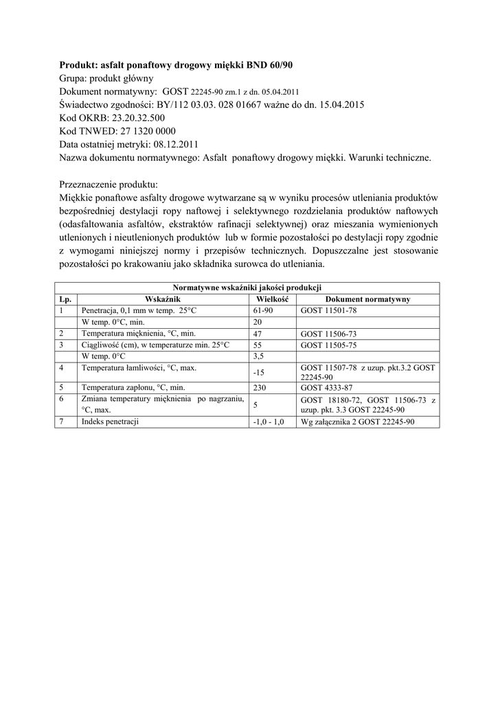 Produkt: asfalt ponaftowy drogowy miękki BND 60/90 Grupa: produkt