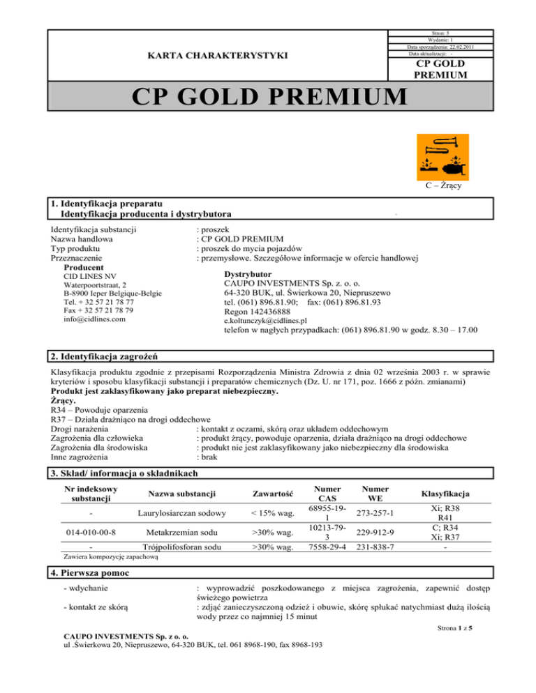 Stron: 5 Wydanie: 1 Data sporządzenia: 22.02.2011 Data aktualizacji: - KARTA CHARAKTERYSTYKI CP GOLD PREMIUM CP GOLD PREMIUM C – Żrący 1. Identyfikacja preparatu Identyfikacja producenta i dystrybutora Identyfikacja substancji Nazwa handlowa Typ produktu Przeznaczenie Producent : proszek : CP GOLD PREMIUM : proszek do mycia pojazdów : przemysłowe. Szczegółowe informacje w ofercie handlowej Dystrybutor CAUPO INVESTMENTS Sp. z. o. o. 64-320 BUK, ul. Świerkowa 20, Niepruszewo tel. (061) 896.81.90; fax: (061) 896.81.93 Regon 142436888 CID LINES NV Waterpoortstraat, 2 B-8900 Ieper Belgique-Belgie Tel. + 32 57 21 78 77 Fax + 32 57 21 78 79 [email protected] [email protected] telefon w nagłych przypadkach: (061) 896.81.90 w godz. 8.30 – 17.00 2. Identyfikacja zagrożeń Klasyfikacja produktu zgodnie z przepisami Rozporządzenia Ministra Zdrowia z dnia 02 września 2003 r. w sprawie kryteriów i sposobu klasyfikacji substancji i preparatów chemicznych (Dz. U. nr 171, poz. 1666 z późn. zmianami) Produkt jest zaklasyfikowany jako preparat niebezpieczny. Żrący. R34 – Powoduje oparzenia R37 – Działa drażniąco na drogi oddechowe Drogi narażenia : kontakt z oczami, skórą oraz układem oddechowym Zagrożenia dla człowieka : produkt żrący, powoduje oparzenia, działa drażniąco na drogi oddechowe Zagrożenia dla środowiska : produkt nie jest zaklasyfikowany jako niebezpieczny dla środowiska : brak Inne zagrożenia 3. Skład/ informacja o składnikach Nr indeksowy substancji Nazwa substancji Zawartość - Laurylosiarczan sodowy < 15% wag. 014-010-00-8 Metakrzemian sodu >30% wag. - Trójpolifosforan sodu >30% wag. Numer CAS 68955-191 10213-793 7558-29-4 Numer WE 273-257-1 229-912-9 231-838-7 Klasyfikacja Xi; R38 R41 C; R34 Xi; R37 - Zawiera kompozycję zapachową 4. Pierwsza pomoc - wdychanie - kontakt ze skórą : wyprowadzić poszkodowanego z miejsca zagrożenia, zapewnić dostęp świeżego powietrza : zdjąć zanieczyszczoną odzież i obuwie, skórę spłukać natychmiast dużą ilością wody przez co najmniej 15 minut Strona 1 z 5 CAUPO INVESTMENTS Sp. z o. o. ul .Świerkowa 20, Niepruszewo, 64-320 BUK, tel. 061 8968-190, fax 8968-193 KARTA CHARAKTERYSTYKI Stron: 5 Wydanie: 1 Data sporządzenia: 22.02.2011 Data aktualizacji: - CP GOLD PREMIUM CP GOLD PREMIUM - kontakt z okiem - spożycie : spłukać niezwłocznie dużą ilością wody przez co najmniej 15 minut przy otwartych powiekach, zapewnić natychmiastową pomoc medyczną. : nie wywoływać wymiotów. W przypadku wystąpienia wymiotów głowa powinna być nisko utrzymywana (tak, aby wymiociny nie dostały się do płuc). W przypadku połknięcia przepłukać usta wodą, podać do wypicia niewielką ilość wody, zapewnić ciepło i spokój. Natychmiast zapewnić pomoc medyczną. Osobie nieprzytomnej niczego nie podawać do ust. 5. Postępowanie w przypadku pożaru Klasa palności Odpowiednie środki gaśnicze Otoczenie Środki ochrony indywidualnej Procedury specjalne : preparat nie jest palny : wszystkie dostępne środki gaśnicze mogą być wykorzystane : schładzać opakowania z produktem znajdujące się w strefie zagrożonej pożarem lub wystawione na działanie wysokiej temperatury rozpyloną wodą lub mgłą wodną; w miarę możliwości usunąć z obszaru zagrożenia : nie wchodzić w strefę pożaru bez odpowiedniego sprzętu ochronnego w tym ochrony układu oddechowego oraz rękawic kwaso- i ługoodpornych. : zachować szczególną ostrożność przy gaszeniu każdego pożaru chemikaliów 6. Postępowanie w przypadku niezamierzonego uwolnienia do środowiska W odniesieniu do ludzi : ekipa czyszcząca powinna być wyposażoną w odpowiedni sprzęt ochrony indywidualnej włączając ochronę układu oddechowego oraz ochronę oczu W odniesieniu do środowiska : zapobiec przedostaniu się środka do kanalizacji lub wód publicznych, gleby, rowów oraz rzek, a w razie zajścia takiego zdarzenia poinformować odpowiednie władze : rozsypany preparat zebrać unikając powstania pyłu i umieścić w zamkniętym Sposób czyszczenia / zbierania pojemniku; uszkodzone opakowanie umieścić w pojemniku ochronnym; zabezpieczyć studzienki ściekowe 7. Postępowanie z preparatem i jego magazynowanie Techniczne środki ostrożności : zapewnić odpowiednią wentylację pomieszczeń miejscową, ogólną wyciągową Ochrona osobista : zapewnić możliwość szybkiego usunięcia środka z oczu, skóry i ubrania. Magazynowanie : przechowywać w szczelnie zamkniętym opakowaniu w dobrze wentylowanym pomieszczeniu o nienasiąkliwej, ługoodpornej i łatwo zmywalnej podłodze. Postępowanie : przechowywać z dala od jedzenia, napojów oraz karmy dla zwierząt. Myć ręce i pozostałe narażone na kontakt części ciała delikatnym mydłem i wodą przed jedzeniem, piciem, paleniem i przed wyjściem z pracy 8. Kontrola narażenia i środki ochrony indywidualnej Najwyższe dopuszczalne stężenia: Zgodnie z Rozporządzeniem Ministra Pracy i Polityki Społecznej z dnia 29 listopada 2002r. w sprawie najwyższych dopuszczalnych stężeń i natężeń czynników szkodliwych dla zdrowia w środowisku pracy (Dz.U. nr 217 poz. 1833 z 2002r. z późn. zmianami) Wartości NDS, NDSCh, NDSP mg/m³ NDS NDSCh NDSP Trójpolifosforan sodu 10 Ochrona indywidualna - układ oddechowy : aparat oddechowy wyposażony w filtr przeciwpyłowy - ręce : rękawice ochronne z PCV - skóra : odzież ochronna wykonana z materiałów powlekanych, buty z kauczuku naturalnego Strona 2 z 5 CAUPO INVESTMENTS Sp. z o. o. ul .Świerkowa 20, Niepruszewo, 64-320 BUK, tel. 061 8968-190, fax 8968-193 KARTA CHARAKTERYSTYKI Stron: 5 Wydanie: 1 Data sporządzenia: 22.02.2011 Data aktualizacji: - CP GOLD PREMIUM CP GOLD PREMIUM - oczy : gogle ochronne lub okulary ochronne, w przypadku możliwości kontaktu za skórą stosować dodatkowo osłonę twarzy : nie jeść, nie pić i nie palić podczas stosowania : płuczka do oczu powinna być dostępna w pobliżu potencja