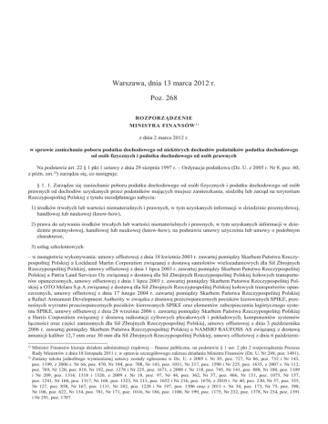 Warszawa, dnia 13 marca 2012 r. Poz. 268 ROZPORZĄDZENIE MINISTRA FINANSÓW 1) z dnia 2 marca 2012 r. w sprawie zaniechania poboru podatku dochodowego od niektórych dochodów podatników podatku dochodowego od osób fizycznych i podatku dochodowego od osób prawnych Na podstawie art. 22 § 1 pkt 1 ustawy z dnia 29 sierpnia 1997 r. – Ordynacja podatkowa (Dz. U. z 2005 r. Nr 8, poz. 60, z późn. zm.2)) zarządza się, co następuje: § 1. 1. Zarządza się zaniechanie poboru podatku dochodowego od osób fizycznych i podatku dochodowego od osób prawnych od dochodów uzyskanych przez podatników mających miejsce zamieszkania, siedzibę lub zarząd na terytorium Rzeczypospolitej Polskiej z tytułu nieodpłatnego nabycia: 1) środków trwałych lub wartości niematerialnych i prawnych, w tym uzyskanych informacji w dziedzinie przemysłowej, handlowej lub naukowej (know-how), 2) prawa do używania środków trwałych lub wartości niematerialnych i prawnych, w tym uzyskanych informacji w dziedzinie przemysłowej, handlowej lub naukowej (know-how), na podstawie umowy użyczenia lub umowy o podobnym charakterze, 3) usług szkoleniowych – w następstwie wykonywania: umowy offsetowej z dnia 18 kwietnia 2003 r. zawartej pomiędzy Skarbem Państwa Rzeczypospolitej Polskiej a Lockheed Martin Corporation związanej z dostawą samolotów wielozadaniowych dla Sił Zbrojnych Rzeczypospolitej Polskiej, umowy offsetowej z dnia 1 lipca 2003 r. zawartej pomiędzy Skarbem Państwa Rzeczypospolitej Polskiej a Patria Land Services Oy związanej z dostawą dla Sił Zbrojnych Rzeczypospolitej Polskiej kołowych transporterów opancerzonych, umowy offsetowej z dnia 1 lipca 2003 r. zawartej pomiędzy Skarbem Państwa Rzeczypospolitej Polskiej a OTO Melara S.p.A związanej z dostawą dla Sił Zbrojnych Rzeczypospolitej Polskiej kołowych transporterów opancerzonych, umowy offsetowej z dnia 17 lutego 2004 r. zawartej pomiędzy Skarbem Państwa Rzeczypospolitej Polskiej a Rafael Armament Development Authority w związku z dostawą przeciwpancernych pocisków kierowanych SPIKE, przenośnych wyrzutni przeciwpancernych pocisków kierowanych SPIKE oraz elementów zabezpieczenia logistycznego systemu SPIKE, umowy offsetowej z dnia 28 września 2006 r. zawartej pomiędzy Skarbem Państwa Rzeczypospolitej Polskiej a Harris Corporation związanej z dostawą radiostacji cyfrowych plecakowych i pokładowych, komponentów systemów łączności oraz części zamiennych dla Sił Zbrojnych Rzeczypospolitej Polskiej, umowy offsetowej z dnia 3 października 2006 r. zawartej pomiędzy Skarbem Państwa Rzeczypospolitej Polskiej a NAMMO RAUFOSS AS związanej z dostawą amunicji kaliber 12,7 mm oraz 30 mm dla Sił Zbrojnych Rzeczypospolitej Polskiej, umowy offsetowej z dnia 6 październi Minister Finansów kieruje działem administracji rządowej – finanse publiczne, na podstawie § 1 ust. 2 pkt 2 rozporządzenia Prezesa Rady Ministrów z dnia 18 listopada 2011 r. w sprawie szczegółowego zakresu działania Ministra Finansów (Dz. U. Nr 248, poz. 1481). 2) Zmiany tekstu jednolitego wymienionej ustawy zostały ogłoszone w Dz. U. z 2005 r. Nr 85, poz. 727, Nr 86, poz. 732 i Nr 143, poz. 1199, z 2006 r. Nr 66, poz. 470, Nr 104, poz. 708, Nr 143, poz. 1031, Nr 217, poz. 1590 i Nr 225, poz. 1635, z 2007 r. Nr 112, poz. 769, Nr 120, poz. 818, Nr 192, poz. 1378 i Nr 225, poz. 1671, z 2008 r. Nr 118, poz. 745, Nr 141, poz. 888, Nr 180, poz. 1109 i Nr 209, poz. 1316, 1318 i 1320, z 2009 r. Nr 18, poz. 97, Nr 44, poz. 362, Nr 57, poz. 466, Nr 131, poz. 1075, Nr 157, poz. 1241, Nr 166, poz. 1317, Nr 168, poz. 1323, Nr 213, poz. 1652 i Nr 216, poz. 1676, z 2010 r. Nr 40, poz. 230, Nr 57, poz. 355, Nr 127, poz. 858, Nr 167, poz. 1131, Nr 182, poz. 1228 i Nr 197, poz. 1306 oraz z 2011 r. Nr 34, poz. 173, Nr 75, poz. 398, Nr 106, poz. 622, Nr 134, poz. 781, Nr 171, poz. 1016, Nr 186, poz. 1100, Nr 199, poz. 1175, Nr 232, poz. 1378, Nr 234, poz. 1391 i Nr 291, poz. 1707. 1) Dziennik Ustaw –2– Poz. 268 ka 2006 r. zawartej pomiędzy Skarbem Państwa Rzeczypospolitej Polskiej a Saab Bofors Dynamics AB związanej z dostawą rakiet RBS15 Mk3 dla Marynarki Wojennej Rzeczypospolitej Polskiej, umowy offsetowej z dnia 15 lutego 2007 r. zawartej pomiędzy Skarbem Państwa Rzeczypospolitej Polskiej a Avio S.p.A związanej z dostawą silnika turbinowego wraz z kapsułą w związku z realizacją programu budowy korwety projekt 621 dla Marynarki Wojennej Rzeczypospolitej Polskiej, umowy offsetowej z dnia 22 października 2008 r. zawartej pomiędzy Skarbem Państwa Rzeczypospolitej Polskiej a Satlynx S.a.r.l. Luxemburg związanej z dostawą anten satelitarnych oraz podzespołów satelitarnego sprzętu nadawczo-odbiorczego do mobilnych terminali satelitarnych PPTS-1,8 w związku z dostawą mobilnych terminali satelitarnych PPTS-1,8 dla Sił Zbrojnych Rzeczypospolitej Polskiej, umowy offsetowej z dnia 10 grudnia 2008 r. zawartej pomiędzy Skarbem Państwa Rzeczypospolitej Polskiej a Rockwell Collins Inc. USA związanej z dostawą awioniki do samolotów M28 Bryza w związku z dostawą samolotów M28 Bryza dla Sił Zbrojnych Rzeczypospolitej Polskiej, umowy offsetowej z dnia 10 grudnia 2008 r. zawartej pomiędzy Skarbem Państwa Rzeczypospolitej Polskiej a Pratt & Whitney Canada Corp. związanej z dostawą silników do samolotów M28 Bryza w związku z dostawą samolotów M28 Bryza dla Sił Zbrojnych Rzeczypospolitej Polskiej, umowy offsetowej z dnia 30 grudnia 2008 r. zawartej pomiędzy Skarbem Państwa Rzeczypospolitej Polskiej a Kongsberg Defence & Aerospace AS związanej z dostawą uzbrojenia i sprzętu wojskowego dla Nadbrzeżnego Dywizjonu Rakietowego Marynarki Wojennej Rzeczypospolitej Polskiej, umowy offsetowej z dnia 27 października 2009 r. zawartej pomiędzy Skarbem Państwa Rzeczypospolitej Polskiej a Thales Communications & Security S.A. Francja związanej z dostawami komponentów dla Taktycznych Radiostacji Pola Walki w związku z dostawą r