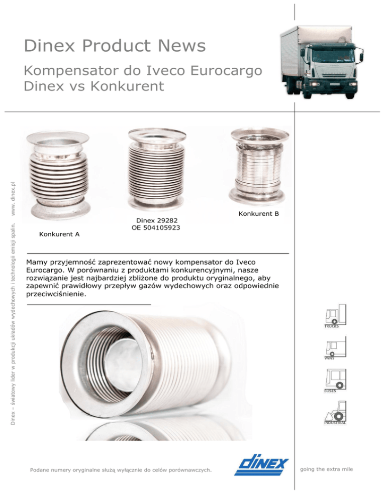 Dinex Product News Dinex – światowy lider w produkcji układów wydechowych i technologii emisji spalin. www. dinex.pl Kompensator do Iveco Eurocargo Dinex vs Konkurent Konkurent A Dinex 29282 OE 504105923 Konkurent B Mamy przyjemność zaprezentować nowy kompensator do Iveco Eurocargo. W porównaniu z produktami konkurencyjnymi, nasze rozwiązanie jest najbardziej zbliżone do produktu oryginalnego, aby zapewnić prawidłowy przepływ gazów wydechowych oraz odpowiednie przeciwciśnienie. Podane numery oryginalne służą wyłącznie do celów porównawczych. going the extra mile