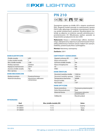 PN 210 LED Zewnętrzna oprawa na źródła LED o stopniu szczelności IP65. Elegancki kształt pozwala na zastosowanie oprawy PN210 jako głównego oświetlenia zewnętrznych korytarzy, przejść podziemnych, podcieni. Wysokiej jakości materiały są odporne na zmienne warunki atmosferyczne i promieniowanie UV. Wbudowany zasilacz pozwala na bezpośrednie przyłączenie do sieci 230V. Wykonanie: Korpus z ciśnieniowego odlewu aluminiowego, zabezpieczony odporną na promieniowanie UV powłoką poliestrową w kolorze szarym, białym lub czarnym. Ozdobny, przezroczysty klosz z poliwęglanu. Montaż: Naścienny, nastropowy. Zasilanie: 230 V DANE ELEKTRYCZNE Źródło światła Liczba źródeł światła Moc źródła światła Rodzaj osprzętu Napięcie znamionowe Zawiera źródło światła Moc oprawy CERTYFIKATY I OZNACZENIA LED 1 12W Zasilacz 230 V Tak 12 W Stopień ochrony (IP) Klasa ochronności Ochrona źródła światła Klasa energetyczna CE ENEC DANE ŚWIETLNE DANE MECHANICZNE Rodzaj montażu Materiał obudowy IP65 I Tak A+ Tak Tak Strumień świetlny źródła Strumień świetlny oprawy Temperatura barwowa Rozsył światła Kąt rozsyłu Powierzchniowy Aluminium odlewane ciśnieniowo 1500 lm 1500 lm 3000K DI 120° DANE OPTYCZNE Raster/przesłona Kolor klosza/pokrywy Materiał klosza Odbłyśnik Tworzywo przezroczyste Brak Tworzywo sztuczne przezroczyste Wysoki połysk WYKONANIA 18-4-2016 Kod Moc źródła światła [W] Kolor IV138001 IV138003 IV138004 1×12 1×12 1×12 Czarny Szary Biały www.pxf.pl, [email protected] PXF Lighting, ul. Jutrzenki 73, 02-230 Warszawa, tel. +48 22 33 44 000, fax +48 22 33 44 033 WYMIARY H F H [mm] F [mm] 30 210 H = Wysokość / głębokość | F = Średnica zewnętrzna 18-4-2016 www.pxf.pl, [email protected] PXF Lighting, ul. Jutrzenki 73, 02-230 Warszawa, tel. +48 22 33 44 000, fax +48 22 33 44 033