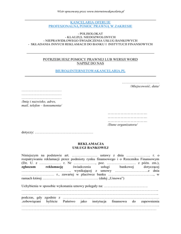 Wzór opracowany przez www.internetowakancelaria.pl ________________________________________________________________________ KANCELARIA OFERUJE PROFESJONALNĄ POMOC PRAWNĄ W ZAKRESIE - POLISOLOKAT - KLAUZUL NIEDOZWOLONYCH - NIEPRAWIDŁOWEGO ŚWIADCZENIA USŁUG BANKOWYCH - SKŁADANIA INNYCH REKLAMACJI DO BANKU I INSTYTUCJI FINANSOWYCH ______________________________________________________________________ POTRZEBUJESZ POMOCY PRAWNEJ LUB WERSJI WORD NAPISZ DO NAS [email protected] ________________________________________________________________________ …………………………. /Miejscowość, data/ …………………………… …………………………… …………………………… /Imię i nazwisko, adres, mail, telefon – konsumenta/ ………………………………. ………………………………. ………………………………. /Dane organizatora/ dotyczy: ………………………………………… REKLAMACJA USŁUGI BANKOWEJ Niniejszym na podstawie art. ………………… ustawy z dnia ……………….. r. o rozpatrywaniu reklamacji przez podmioty rynku finansowego i o Rzeczniku Finansowym (Dz. U. z ……………… r. Nr ………………, poz. …………………… z późn. zm.), zgłaszam reklamację świadczenia usługi bankowej dotyczącej …………………………………., wynikającej z umowy ………………………z dnia ……………………… r., zawartej w placówce banku ……………………………….., w ramach której ………………………………………. (dalej „Umowa”) Uchybienia w sposobie wykonania umowy polegały na: ……………………………… ………………………………………………………………………………………………….. ………………………………………………………………………………………………….. podczas, gdy zgodnie z …………………..………………………………………………… .zobowiązani byliście Państwo jako instytucja finansowa do zapewnienia ……………………………………………………………………………………….………….. ………………………………………………………………………………………………… Wzór opracowany przez www.internetowakancelaria.pl ………………………………………………………………………………………………… Powyższe stanowi naruszenie: a) klauzuli niedozwolonej wynikającej z rejestru klauzul niedozwolonych nr ………………… (wyrok Sądu Ochrony Konkurencji i Konsumentów z dnia …………., sygn. akt ……………); b) przepisu art. ………………….. ustawy z dnia ……………………………… o …………………… (Dz. U. z ……………… r. Nr ………………, poz. …………………… z późn. zm.); Informuję przy tym, iż w chwili składania oświadczenia woli w zakresie zawarcia umowy działałem pod wpływem błędu, co do treści czynności prawnej, ponieważ: a) ……………………………………………….; b) ……………………………………………….; tym samym stosownie do treści art. 84 kodeksu cywilnego, oświadczam, iż uchylam się od skutków prawnych oświadczenia woli złożonego w dniu ……………………… r. ___________________________________________________________________________ Mając na uwadze powyższe, wnoszę o: a) rozpatrzenie mojej reklamacji w trybie przepisów ustawy z dnia ……………….. r. o rozpatrywaniu reklamacji przez podmioty rynku finansowego i o Rzeczniku Finansowym (Dz. U. z ……………… r. Nr ………………, poz. …………………… z późn. zm.), z zachowaniem terminu ustawowego na jej rozpatrzenie określonego w art. 5 ww. ustawy; b) zwrot, wypłatę, inne roszczenie /wybrać właściwe/ W przypadku braku pozytywnego rozpatrzenia reklamacji lub braku jej rozpatrzenia w wyżej zakreślonym terminie, wystąpię na drogę sądową, wskutek czego zostaną Państwo obciążeni dodatkowymi kosztami procesu oraz kosztami ewentualnej egzekucji. ___________________________________________________________________________ Z poważaniem: …………………………. /podpis konsumenta/ Załącznik. 1. kserokopia umowy; 2. kserokopia innych dokumentów