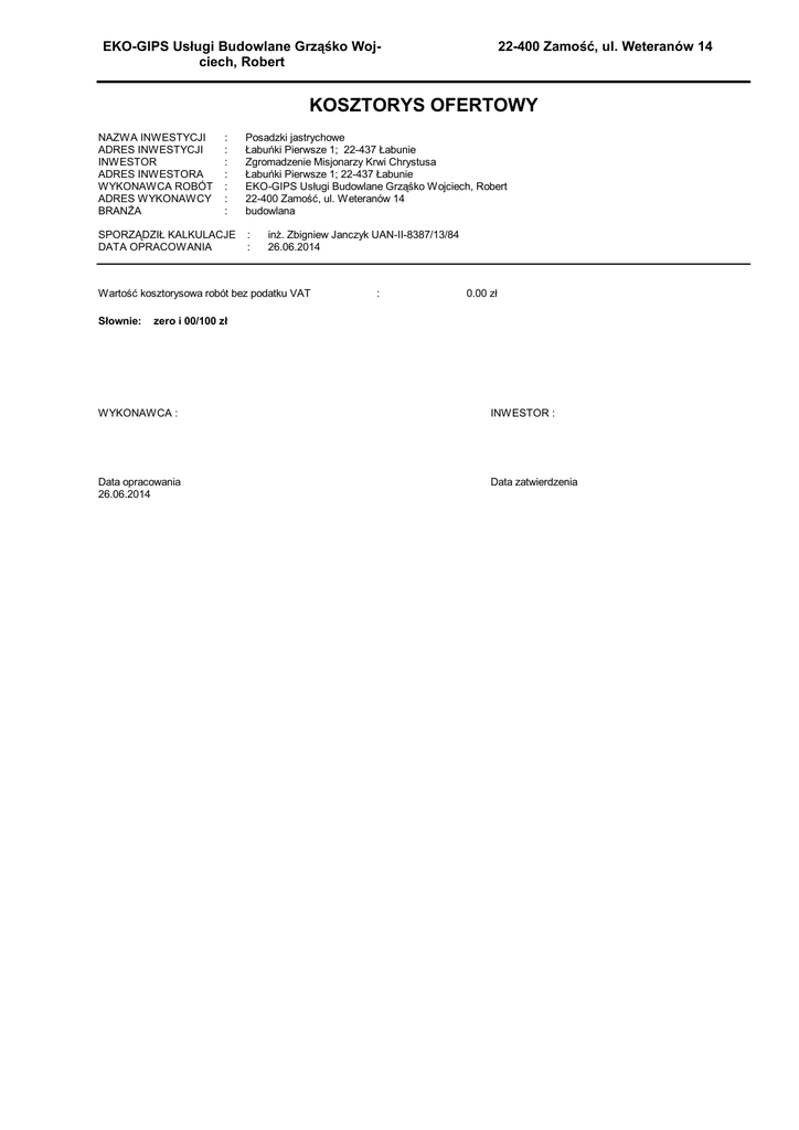 EKO-GIPS Usługi Budowlane Grząśko Wojciech, Robert 22-400 Zamość, ul. Weteranów 14 KOSZTORYS OFERTOWY NAZWA INWESTYCJI ADRES INWESTYCJI INWESTOR ADRES INWESTORA WYKONAWCA ROBÓT ADRES WYKONAWCY BRANŻA : : : : : : : SPORZĄDZIŁ KALKULACJE DATA OPRACOWANIA Posadzki jastrychowe Łabuńki Pierwsze 1; 22-437 Łabunie Zgromadzenie Misjonarzy Krwi Chrystusa Łabuńki Pierwsze 1; 22-437 Łabunie EKO-GIPS Usługi Budowlane Grząśko Wojciech, Robert 22-400 Zamość, ul. Weteranów 14 budowlana : : inż. Zbigniew Janczyk UAN-II-8387/13/84 26.06.2014 Wartość kosztorysowa robót bez podatku VAT Słownie: : 0.00 zł zero i 00/100 zł WYKONAWCA : INWESTOR : Data opracowania 26.06.2014 Data zatwierdzenia Lp. 1 Podstawa wyceny Opis Ilość Cena zł Wartość zł (5 x 6) 4 6 7 2 1 NNRNKB 202 1125-01 m2 5 270 2 m2 3 4 5 6 3 (z.VI) Podkłady betonowe grub. 8 cm wykonywane przy użyciu "Miksokreta" w pomieszczeniach o pow.ponad 8 m2 Krotność = 1.25 KNR-W 2-02 Izolacje przeciwwilgociowe i przeciwwodne z folii polietyle0606-01 nowej szerokiej - poziome podposadzkowe KNR-W 2-02 Izolacje cieplne i przeciwdźwiękowe z płyt styropianowych 0608-03 poziome na wierzchu konstrukcji na sucho - jedna warstwa; styropian gr 5cm KNR-W 2-02 Izolacje cieplne i przeciwdźwiękowe z płyt styropianowych 0608-04 poziome na wierzchu konstrukcji na sucho - każda nast. warstwa gr. 5cm KNR 2-02 1913- Dylatacje 01 analogia NNRNKB 202 (z.VI) Posadzki cementowe grub. 2 cm zatarte na ostro 1129-01 wykonywane przy użyciu "Miksokreta" w pomieszczeniach o pow.ponad 8 m2 Krotność = 3 Jedn. miary 0.000 0.00 270 0.000 0.00 m2 270 0.000 0.00 m2 270 0.000 0.00 m 150 0.000 0.00 m2 270 0.000 0.00 PODSUMOWANIE CAŁY KOSZTORYS RAZEM RAZEM OGÓŁEM Słownie: zero i 00/100 zł -2- Norma PRO Wersja 4.34 Nr seryjny: 20427 Jastrych II.ATH Lp. 1. robocizna ZESTAWIENIE ROBOCIZNY Nazwa Jm r-g Słownie: zero i 00/100 zł -3- Norma PRO Wersja 4.34 Nr seryjny: 20427 Ilość 1144.1880 Cena jedn. 0.00 RAZEM Wartość 0.00 ZESTAWIENIE MATERIAŁÓW Lp. 1. 2. 3. 4. 5. 6. 7. Nazwa Włókna zbrojeniowe PCV Taśma dylatacyjna gr. 1cm folia polietylenowa szeroka (6 lub 12 m) gr. 0,2 mm płyty styropianowe Piasek rzeczny 0-4 mm Cement portl,zwykły b.dod. CEM I 32,5-work materiały pomocnicze Jm kg m m2 m2 m3 t zł Ilość 27.0000 157.5000 324.0000 567.0000 40.4190 15.4845 Il inw. Il wyk. 27.0000 157.5000 324.0000 567.0000 40.4190 15.4845 Cena jedn. 0.00 0.00 0.00 0.00 0.00 0.00 RAZEM Słownie: zero i 00/100 zł -4- Norma PRO Wersja 4.34 Nr seryjny: 20427 Wartość 0.00 0.00 0.00 0.00 0.00 0.00 0.00 Grupa ZESTAWIENIE SPRZĘTU Lp. 1. środek transportowy 2. "Miksokret" 28 kW Nazwa Jm m-g m-g Słownie: zero i 00/100 zł -5- Norma PRO Wersja 4.34 Nr seryjny: 20427 Ilość 8.9670 224.1000 Cena jedn. 0.00 0.00 RAZEM Wartość 0.00 0.00 OBMIAR Lp. Podstawa Opis i wyliczenia j.m. 1 NNRNKB (z.VI) Podkłady betonowe grub. 8 cm wykonywane przy użyciu "Miksokreta" w po- m2 202 1125-01 mieszczeniach o pow.ponad 8 m2 Krotność = 1.25 270 m2 2 KNR-W 2-02 Izolacje przeciwwilgociowe i przeciwwodne z folii polietylenowej szerokiej - pozio0606-01 me podposadzkowe 270 m2 3 KNR-W 2-02 Izolacje cieplne i przeciwdźwiękowe z płyt styropianowych poziome na wierzchu 0608-03 konstrukcji na sucho - jedna warstwa; styropian gr 5cm 270 m2 4 KNR-W 2-02 Izolacje cieplne i przeciwdźwiękowe z płyt styropianowych poziome na wierzchu 0608-04 konstrukcji na sucho - każda nast. warstwa gr. 5cm 270 m2 5 KNR 2-02 1913-01 analogia Dylatacje m 150 m m2 m2 m2 6 NNRNKB (z.VI) Posadzki cementowe grub. 2 cm zatarte na ostro wykonywane przy użyciu " m2 202 1129-01 Miksokreta" w pomieszczeniach o pow.ponad 8 m2 Krotność = 3 270 m2 -6- Norma PRO Wersja 4.34 Nr seryjny: 20427 Poszcz Razem 270.000 RAZEM 270.000 270.000 RAZEM 270.000 270.000 RAZEM 270.000 270.000 RAZEM 270.000 150.000 RAZEM 150.000 270.000 RAZEM 270.000