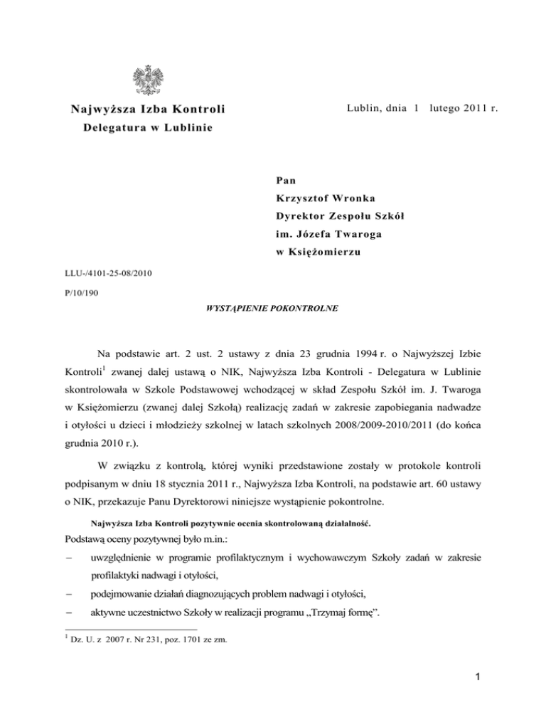 Lublin, dnia 1 lutego 2011 r. Najwyższa Izba Kontroli Delegatura w Lublinie Pan Krzysztof Wronka Dyrektor Zespołu Szkół im. Józefa Twaroga w Księżomierzu LLU-/4101-25-08/2010 P/10/190 WYSTĄPIENIE POKONTROLNE Na podstawie art. 2 ust. 2 ustawy z dnia 23 grudnia 1994 r. o Najwyższej Izbie Kontroli1 zwanej dalej ustawą o NIK, Najwyższa Izba Kontroli - Delegatura w Lublinie skontrolowała w Szkole Podstawowej wchodzącej w skład Zespołu Szkół im. J. Twaroga w Księżomierzu (zwanej dalej Szkołą) realizację zadań w zakresie zapobiegania nadwadze i otyłości u dzieci i młodzieży szkolnej w latach szkolnych 2008/2009-2010/2011 (do końca grudnia 2010 r.). W związku z kontrolą, której wyniki przedstawione zostały w protokole kontroli podpisanym w dniu 18 stycznia 2011 r., Najwyższa Izba Kontroli, na podstawie art. 60 ustawy o NIK, przekazuje Panu Dyrektorowi niniejsze wystąpienie pokontrolne. Najwyższa Izba Kontroli pozytywnie ocenia skontrolowaną działalność. Podstawą oceny pozytywnej było m.in.: − uwzględnienie w programie profilaktycznym i wychowawczym Szkoły zadań w zakresie profilaktyki nadwagi i otyłości, − podejmowanie działań diagnozujących problem nadwagi i otyłości, − aktywne uczestnictwo Szkoły w realizacji programu „Trzymaj formę”. 1 Dz. U. z 2007 r. Nr 231, poz. 1701 ze zm. 1 1. W Szkole stworzono warunki do podejmowania działań profilaktycznych związanych z przeciwdziałaniem nadwadze i otyłości u młodzieży. W procesie dydaktyczno-wychowawczym Szkoła uwzględniła problematykę przeciwdziałania nadwadze i otyłości wśród uczniów. Opracowano na każdy rok szkolny: 2008/2009, 2009/2010 i 2010/2011 programy wychowawcze i profilaktyczne, w których zawarto treści i działania o charakterze profilaktycznym na rzecz przeciwdziałania nadwadze i otyłości. Zorganizowano szereg przedsięwzięć promujących zdrowy styl życia i odżywiania, w tym: w Szkole realizowano programy mające na celu zwiększenie świadomości dotyczącej wpływu żywienia i aktywności na zdrowie uczniów, takie jak: „Trzymaj formę” „W zdrowym ciele zdrowy duch”, w ramach którego zorganizowano dzień sportu, rajd rowerowy, zajęcia rekreacyjne, wyjazd na basen. Nauczono młodzież wyznaczać własny BMI (Body Mass Index), który pełni funkcję diagnozującą i monitorującą wagę dziecka. Uczniowie zorganizowali liczne akcje i konkursy połączone z degustacją, promujące zdrowe odżywianie, przeprowadzono konkurs plastyczny pod hasłem Plakat „Zdrowa żywność”. Wśród uczniów przeprowadzono badania ankietowe na temat znajomości zasad prawidłowego odżywiania się: „Sprawdź, czy odżywiasz się prawidłowo” „Czy wiemy co jemy”. Psycholog szkolny prowadził zajęcia na temat zaburzeń odżywiania „Konsekwencje nieprawidłowego odżywiania – anoreksja, bulimia i otyłość”. Szkoła współpracowała z Powiatową Stacją Sanitarno – Epidemiologiczną w Kraśniku, która organizowała szkolenia i spotkania oraz dostarczała Szkole materiały (plakaty, broszury) promujące zdrowe odżywianie i zdrowy tryb życia w ramach koordynacji programu „Trzymaj formę”. Przy realizacji projektów „Las i my” oraz „Woda źródłem życia” Szkoła współpracowała z Urzędem Gminy Gościeradów oraz NZOZ „Refugium” w Gościeradowie i Kuratorium Oświaty w Lublinie. W stołówce szkolnej przy przygotowywaniu posiłków wykorzystywano zasady zdrowego żywienia, co wynikało m.in. z wprowadzonego i stosowanego systemu HACCP2. Posiłki sporządzano w oparciu o zalecaną przez Powiatową Stację Sanitarno- Epidemiologiczną w Kraśniku książkę pt. „Obiady szkolne”, zawierającą m.in. zalecenia w zakresie zdrowego żywienia oraz jadłospisy i receptury dla żywienia zbiorowego dzieci i młodzieży w placówkach oświatowo – wychowawczych. Stwierdzono jednakże, iż w sklepiku szkolnym znajdowały się artykuły spożywcze o niskiej wartości 2 postępowanie mające na celu zapewnienie bezpieczeństwa żywności przez identyfikację i oszacowanie skali zagrożeń z punktu widzenia wymagań zdrowotnych żywności oraz ryzyka wystąpienia zagrożeń podczas przebiegu wszystkich etapów produkcji i obrotu żywnością 2 żywieniowej takie jak m.in.: pączki, drożdżówki, gumy do żucia, sucharki smakowe, chipsy. W związku z powyższym wydaje się wskazane oddziaływanie dydaktyczne zmniejszające zainteresowanie uczniów tym asortymentem. Będące w użytkowaniu Szkoły obiekty sportowo-rekreacyjne wykorzystywano do kształtowania nawyków prozdrowotnych wśród uczniów. W ramach zajęć wychowania fizycznego zapewniono uczniom korzystanie z sali gimnastycznej wyposażonej w sprzęt sportowy oraz z boiska do piłki nożnej, siatkowej, ręcznej i placu zabaw. Uczniów klas I-III Szkoły Podstawowej objęto zajęciami ruchowo – tanecznymi i korekcyjno-kompensacyjnymi. Zapewniono cotygodniową opiekę nauczycieli na zajęciach pozalekcyjnych dla 15 uczniów dojeżdżających na basen położony ok. 30 km od Szkoły. 2. W Szkole Podstawowej podejmowano działania diagnozujące problem nadwagi i otyłości wśród uczniów. Pielęgniarka szkolna przeprowadzała systematyczne badania przesiewowe i bilanse zdrowia uczniów. W latach szkolnych 2008/2009, 2009/2010 i 2010/2011 problem otyłości i nadwagi zdiagnozowano odpowiednio u 11, 13 i 11 uczniów, co stanowiło 12,5%, 12,6% i 11,5% ogółu uczniów Szkoły Podstawowej. W tym okresie dwóch uczniów objęto opieką lekarską. Z analizy ankiet przeprowadzonych wśród 18 nauczycieli wynika, że 14 z nich (77,8%) czuje się przygotowanych do udzielenia porad uczniom i rodzicom w sprawach związanych z profilaktyką nadwagi i otyłości. Jednocześnie pięciu nauczycieli (27,8%) wyraziło chęć doskonalenia się w tym zakresie. NIK odstępuje od formułowania wniosków pokontrolnych, wnosząc jednocześnie o rozważenie działań mających wpływ na zmni