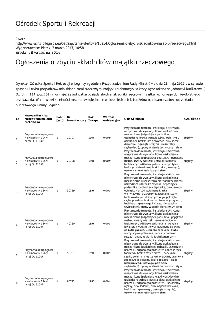 Ośrodek Sportu i Rekreacji Źródło: http://www.osir.bip.legnica.eu/osr/zapytania-ofertowe/16954,Ogloszenia-o-zbyciu-skladnikow-majatku-rzeczowego.html Wygenerowano: Piątek, 3 marca 2017, 14:58 Środa, 28 września 2016 Ogłoszenia o zbyciu składników majątku rzeczowego Dyrektor Ośrodka Sportu i Rekreacji w Legnicy zgodnie z Rozporządzeniem Rady Ministrów z dnia 21 maja 2010r, w sprawie sposobu i trybu gospodarowania składnikami rzeczowymi majątku ruchomego, w który wyposażone są jednostki budżetowe ( Dz. U. nr 114, poz.761) informuje, że jednostka posiada zbędne składniki rzeczowe majątku ruchomego do nieodpłatnego przekazania. W pierwszej kolejności zostaną uwzględnione wnioski jednostek budżetowych i samorządowego zakładu budżetowego Gminy Legnica. Lp. 1. 2. 3. 4. 5. 6. Nazwa składnika rzeczowego majątku ruchomego Ilość [szt.] Nr Rok inwentarzowy Zakupu Wartość ewidencyjna Przyczepa kempingowa Niewiadów N 126N nr rej DL 1104P 1 10727 1996 0,00zł Przyczepa kempingowa Niewiadów N 126N nr rej DL 1106P 1 20728 1996 0,00zł Przyczepa kempingowa Niewiadów N 126N nr rej DL 1101P 1 30729 1996 0,00zł Przyczepa kempingowa Niewiadów N 126N nr rej DL 1105P 1 40730 1996 0,00zł Przyczepa kempingowa Niewiadów N 126N nr rej DL 1102P 1 50731 1996 0,00zł Przyczepa kempingowa Niewiadów N 126N nr rej DL 1103P 1 60732 1997 0,00zł Opis Składnika Kwalifikacja Przyczepa do remontu, instalacja elektryczna niesprawna do wymiany, liczne uszkodzenia mechaniczne (odpadająca podsufitka, uszkodzona kratka wentylacyjna, brak lampy zbędny obrysowej, brak kurka gazowego, brak rączki drzwiowej, pęknięta skrzynia, nieszczelny szyberdach), opony w stanie technicznym złym Przyczepa do remontu, instalacja elektryczna niesprawna do wymiany, liczne uszkodzenia mechaniczne (odpadająca podsufitka, popękane meble, urwany wieszak, zerwana tapicerka, zbędny brak lewego odblasku, pęknięta lampa tylna, brak rączki drzwiowej, brak kurka gazowego), opony w stanie technicznym złym Przyczepa do remontu, instalacja elektryczna niesprawna do wymiany, liczne uszkodzenia mechaniczne (uszkodzenia mechaniczne lakieru, uszkodzona uszczelka okienne, odpadająca podsufitka, odchodząca tapicerka, brak lewego odblasku – przód, połamana kratka zbędny wentylacyjna, przewody gazowe zmurszałe, brak światła przedniego prawego, pęknięta szyba przednia, brak wsporników przy szybach, brak koła zapasowego i klucza, nieszczelny szyberdach), opony w stanie technicznym złym Przyczepa do remontu, instalacja elektryczna niesprawna do wymiany, liczne uszkodzenia mechaniczne (odpadająca podsufitka, popękane meble, urwany wieszak, zerwana tapicerka, brak lewego odblasku, pęknięta lampa tylna zbędny lewa, brak wtyczki siłowej, połamana skrzynia na butlę gazową, uszczelki popękane, kratki wentylacyjne połamane, zerwany hamulec ręczny), opony w stanie technicznym złym Przyczepa do remontu, instalacja elektryczna niesprawna do wymiany, liczne uszkodzenia mechaniczne (uszkodzone odblaski, uszkodzone uszczelki, odpadająca podsufitka i odchodząca tapicerka, brak lampy z przodu, popękane zbędny szafki, połamana kratka wentylacyjna, brak koła zapasowego i klucza, brak odblasku – przód, brak przewodu siłowego, połamany szyberdach), opony w stanie technicznym złym Przyczepa do remontu, instalacja elektryczna niesprawna do wymiany, liczne uszkodzenia mechaniczne (połamane kratki wentylacyjne, uszkodzone zabezpieczenia okna, uszkodzone zbędny uszczelki, odpadająca podsufitka, uszkodzony ręczny, brak lodówki, brak wsporników okna, brak koła zapasowego, pęknięta skrzynia), opony w stanie technicznym złym 7. Przyczepa kempingowa Niewiadów N 126N nr rej DL 0897P 1 70733 1997 0,00zł 8. Przyczepa kempingowa Niewiadów N 126N nr rej DL 1107 1 80734 1997 0,00zł Przyczepa do remontu, instalacja elektryczna niesprawna do wymiany, liczne uszkodzenia mechaniczne (połamana kratka wentylacyjna, brak odblasku, brak kurka gazowego, zbędny odpadająca podsufitka, brak poduszek i blatów, brak haka holowniczego, uszkodzone lampy – kierunkowskaz lewy, przeciwmgłowe, połamana nóżka), opony w stanie technicznym złym Przyczepa do remontu, instalacja elektryczna niesprawna do wymiany, liczne uszkodzenia mechaniczne (uszkodzone kratki wentylacyjne, odpadająca podsufitka, brak lampki podświetlania tablicy rejestracyjnej, brak zbędny światła obrysowego, złamana rączka, uszkodzony hamulec ręczny, uszkodzony statecznik, brak kurka gazowego, brak koła zapasowego), opony w stanie technicznym złym Metadane Data publikacji 28.09.2016 12.10.2016 Rejestr zmian Podmiot udostępniający informację: Ośrodek Sportu i Rekreacji Osoba wytwarzająca/odpowiadająca za informację: Osoba udostępniająca informację: Ewelina Łagosz dział techniczny Osoba modyfikująca informację: Ewelina Łagosz