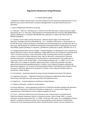 Regulamin świadczenia Usługi Ninateka § 1 Postanowienia ogólne 1. Regulamin niniejszy określa zakres i warunki świadczenia przez Dostawcę Usługi Ninateka na rzecz Abonenta przy użyciu technicznych rozwiązań udostępnianych w Sprzęcie Abonentowi przez Operatora. 2. Użyte w Regulaminie określenia oznaczają: 2.1. Operator - Netia SA z siedzibą przy ul. Poleczki 13, 02-822 Warszawa, zarejestrowaną w Sądzie Rejonowym dla m.st. Warszawy, Sąd Gospodarczy XIII Wydział KRS pod numerem KRS 0000041649, o kapitale zakładowym w wysokości 386.280.904 PLN, opłaconym w całości, NIP 526-02-05-575, REGON 011566374; 2.2. Dostawca Treści (dalej również Dostawca) – podmiot dostarczający Treści Abonentom Operatora, działający pod firmą FMS Media Sp. z o.o. z siedzibą w Warszawie, ul. Karola Miarki 13, 01-496 Warszawa, wpisaną do Rejestru Przedsiębiorców prowadzonego przez Sąd Rejonowy dla m.st. Warszawy, Sąd Gospodarczy, Wydział XIII Gospodarczy Krajowego Rejestru Sądowego pod numerem KRS 209593, kapitał zakładowy w wysokości: 140.000 PLN, opłaconym w całości, NIP 838-174-17-71. 2.3. Usługa Ninateka (dalej również Usługa) – usługa polegająca na udostępnianiu przez Dostawcę na żądanie Abonenta Treści w serwisie odpłatnym, drogą elektroniczną, bez możliwości zwielokrotniania Treści, w formie transmisji w czasie rzeczywistym (ang. streaming video live) lub na żądanie w miejscu i w czasie przez siebie wybranym (ang. video on demand) z zastosowaniem systemów teleinformatycznych, umożliwiających transmisję danych za pośrednictwem sieci publicznych w rozumieniu ustawy z dnia 16 lipca 2004 r. Prawo telekomunikacyjne (Dz. U. z 2004 r. Nr 171, poz. 1800 z późn. zm.). Usługa ma charakter jednorazowy (PPV). Usługa może posiadać licencyjne ograniczenie terytorialne (geolokalizacyjne) tj. niektóre Treści mogą być dostępne wyłącznie dla Abonentów logujących się z terytorium Rzeczypospolitej Polskiej i identyfikowanych polskim IP) oraz licencyjne i techniczne ograniczenia sprzętowe tj. niektóre Treści mogą być dostępne tylko na określonym rodzaju Sprzętu. 2.4. Zamówienie – dyspozycja Abonenta zakupu licencji niewyłącznej do danej Treści płatnej. 2.5. Regulamin Operatora – Regulamin Świadczenia Usług przez Spółki Grupy Netia dostępny http://www.netia.pl/pomoc_dla_domu,poradniki,192,regulaminy.html 2.6. Regulamin – niniejszy Regulamin świadczenia Usługi Ninateka. 2.7. Platforma Ninateka – platforma multimedialna. 2.8. Konto Abonenta – spersonalizowana przestrzeń na Platformie Ninateka dostępna dla Abonenta, który dokonał rejestracji na Platformie Ninateka po zalogowaniu z użyciem hasła i loginu, za pośrednictwem, której Abonent może zarządzać dostępem do Treści. 2.9. Treści - oferowane Abonentowi przez Dostawcę treści audiowizualne za pośrednictwem Platformy Ninateka stanowiące utwory w rozumieniu ustawy z dnia 4 lutego 1994 r. o prawie autorskim i prawach pokrewnych (Dz. U. z 2000 r. Nr 80, poz. 904 z późn. zm.) i podlegające ochronie zgodnie z przepisami wskazanej ustawy oraz innych przepisów prawa własności intelektualnej. Prawami do Treści dysponują podmioty, które udzieliły Dostawcy licencji oraz inne wskazane na Platformie Ninateka lub w samej Treści podmioty. Treści są płatne lub niepodlegające Opłacie zgodnie z aktualną ofertą na Platformie Ninateka dostępnej za pośrednictwem Sprzętu. Treści płatne oferowane są w formie PPV.. Treści prezentowane są z oryginalną ścieżką dźwiękową i polskim lektorem lub polskimi napisami. 2.10. Opłata - kwota uiszczana przez Abonenta za zakup licencji niewyłącznej do danej Treści płatnej umożliwiającej odtworzenie Treści na Sprzęcie. Wysokość kwoty podana jest w komunikacie w trakcie korzystania ze Sprzętu. Kwoty Opłat są cenami brutto i zawierają podatek VAT zgodnie ze stawką obowiązującą w chwili zakupu oraz obowiązującymi przepisami prawa. 2.11. PPV (ang. pay-per-view) płatny dostęp do Treści (VOD lub transmisja) oferowanej w ramach Usługi uprawniający do odtworzenia wybranej Treści przez Abonenta. Dostęp do zakupionej Treści jest możliwy przez 24 następujące po sobie godziny zegarowe. W przypadku rozpoczęcia transmisji dostęp jest możliwy do czasu jej zakończenia. 2.12. Sprzęt – zintegrowane z usługami Operatora urządzenia umożliwiające odbiór Treści przez Abonenta zgodnie z aktualną ofertą Usługi, pozostające własnością Operatora, udostępnione Abonentowi na podstawie zawartej Umowy o świadczenie usług telekomunikacyjnych. 2.13. Kod PIN – jest to 4-cyfrowy kod VOD i Kontroli rodzicielskiej zdefiniowany przez Abonenta w trakcie konfiguracji urządzenia podczas pierwszego uruchomienia Sprzętu udostępnionego Abonentowi przez Operatora, również do korzystania z Usługi Ninateka. Kod PIN pozwala zabezpieczyć dostęp do płatnych Treści i programów z ograniczeniem wiekowym. Abonent może w każdej chwili zmienić Kod PIN poprzez menu Ustawienia dostępne w głównym menu Sprzętu. § 3 Ogólne warunki korzystania z Usługi 1. Usługa Ninateka przeznaczona jest wyłącznie dla Abonentów i użytkowników, którzy ukończyli 18 rok życia. 2. Dostęp do Usługi Ninateka możliwy jest wyłącznie po podaniu przez Abonenta poprawnego kodu PIN. 3. Operator udostępnia Abonentom Regulamin podczas uruchomienia Usługi oraz przed złożeniem Zamówienia za pomocą Sprzętu, którym posługuje się Abonent oraz udostępniony jest również na stronie internetowej: www.netia.pl. 4. Korzystanie z Usługi Ninateka następuje przez dokonanie czynności faktycznych opisanych w zdaniu następnym oraz aktywację Usługi Ninateka przez Dostawcę. W celu skorzystania z Usługi należy złożyć Zamówienie Treści przy pomocy posiadanego Sprzętu, posługując się Numerem PIN, zgodnie z instrukcją Operatora i Dostawcy i zgodnie z ceną każdorazowo podaną przy danej Treśc