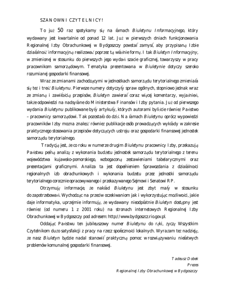 SZANOWNI CZYTELNICY! To już 50 raz spotykamy się na łamach Biuletynu Informacyjnego, który wydawany jest kwartalnie od ponad 12 lat. Już w pierwszych dniach funkcjonowania Regionalnej Izby Obrachunkowej w Bydgoszczy powstał zamysł, aby przypisaną Izbie działalność informacyjną realizować poprzez tą właśnie formę. I tak Biuletyn Informacyjny, w zmienionej w stosunku do pierwszych jego wydań szacie graficznej, towarzyszy w pracy pracownikom samorządowym. Tematyka prezentowana w Biuletynie dotyczy szeroko rozumianej gospodarki finansowej. Wraz ze zmianami zachodzącymi w jednostkach samorządu terytorialnego zmieniała się też i treść Biuletynu. Pierwsze numery dotyczyły spraw ogólnych, stopniowo jednak wraz ze zmianą i zawiłością przepisów, Biuletyn zawierał coraz więcej komentarzy, wyjaśnień, także odpowiedzi na nadsyłane do Ministerstwa Finansów i Izby pytania. Już od pierwszego wydania Biuletynu publikowane były artykuły, których autorami byliście również Państwo – pracownicy samorządowi. Tak pozostało do dziś. Na łamach Biuletynu oprócz wypowiedzi pracowników Izby można znaleźć również publikacje osób prowadzących wykłady w zakresie praktycznego stosowania przepisów dotyczących ustroju oraz gospodarki finansowej jednostek samorządu terytorialnego. Tradycją jest, że co roku w numerze drugim Biuletynu pracownicy Izby, przekazują Państwu pełną analizę z wykonania budżetu jednostek samorządu terytorialnego z terenu województwa kujawsko-pomorskiego, wzbogaconą zestawieniami tabelarycznymi oraz prezentacjami graficznymi. Analiza ta jest dopełnieniem Sprawozdania z działalności regionalnych izb obrachunkowych i wykonania budżetu przez jednostki samorządu terytorialnego corocznie opracowywanego i przekazywanego Sejmowi i Senatowi RP. Otrzymuję informacje, że nakład Biuletynu jest zbyt mały w stosunku do zapotrzebowań. Wychodząc na przeciw oczekiwaniom jak i wykorzystując możliwości, jakie daje informatyka, uprzejmie informuję, że wydawany nieodpłatnie Biuletyn dostępny jest również (od numeru 1 z 2001 roku) na stronach internetowych Regionalnej Izby Obrachunkowej w Bydgoszczy pod adresem: http://www.bydgoszcz.rio.gov.pl. Oddając Państwu ten jubileuszowy numer Biuletynu do ręki, życzę Wszystkim Czytelnikom dużo satysfakcji z pracy na rzecz społeczności lokalnych. Wyrażam też nadzieję, że nasz Biuletyn będzie nadal stanowił praktyczną pomoc w rozwiązywaniu niełatwych problemów komunalnej gospodarki finansowej. Tadeusz Dobek Prezes Regionalnej Izby Obrachunkowej w Bydgoszczy