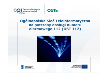 Ogólnopolska Sieć Teleinformatyczna na potrzeby obsługi numeru alarmowego 112 (OST 112) Główne produkty/rezultaty projektu Uruchomienie sieci szkieletowej w technologii IP/MPLS wraz z migracją usług z sieci POLWAN na potrzeby podmiotów SPR Instalacja urządzeń sieciowych i oprogramowania w ponad 900 lokalizacji - WCPR, CPR, jednostek PSP i Policji, UW –> podłączenie do OST 112 Uruchomienie centralnego systemu monitorowania i zarządzania siecią (CSZiM) Szkolenia dla administratorów i operatorów sieci Uruchomienie systemu VoIP, dostawa 1500 telefonów IP Zestawienie łączy na potrzeby OST 112 (10 Gbps, 1Gbps/155 Mbps, 32 Mbps) - dzierżawa łączy światłowodowych Elementy sieciowe poza OST 112 niezbędne dla SPR • Łącza OST 112 <-> WCPR – zestawione przez KGP/KWP • Łącza OST 112 <-> Dyspozytornia PRM, KM PSP, UW (WZK) – zestawianie przez KGP/KWP do końca 2011 r. OST 112 a SIPR PLI CBD Ośrodek Krajowy SI WCPR OST 112 (POL20, 35, 300) WCPR PSP Zarządzanie i utrzymanie OST 112 • Decyzja MSWiA nr 3 z 13 stycznia 2011 r. - KGP (BŁiI KGP) pełni rolę tymczasowego Operatora OST 112 (do momentu powołania podmiotu docelowego) • Zadania: utrzymanie i administrowanie OST 112, udział w pracach wdrożeniowych, przyszły rozwój sieci • Architektura OST 112 dostosowana do centralnego modelu zarządzania siecią • Serwis wykonawcy do końca 2015 roku Stan realizacji projektu • Szczegółowy Projekt Techniczny OST 112 • Zestawiono łącza POL20 i uruchomiono usługę transmisji danych na poziomie wojewódzkim – pomiędzy węzłami POL20 oraz zmigrowano większość usług POLWAN. • Umożliwiona transmisja na rzecz podmiotów SPR w miastach wojewódzkich (WCPR, KW/KM PSP) – podłączanie do węzłów POL20 • Zainstalowano infrastrukturę i uruchomiono CSZiM OST 112 • Trwa migracja usług POLWAN do OST 112 – do 30.09.2011 • Uruchomiono system szyfrowania oraz system PKI (bezpieczeństwo transmisji i sieci) Stan realizacji projektu (cd.) • Zestawiono łącza na poziomie POL35, uruchomiono usługę transmisji danych w 20 węzłach POL35 oraz uruchomiono pierwsze usługi POLWAN (możliwe podłączanie kolejnych jednostek SPR) – pełne uruchomienie i migracja do 30.09.2011 • Wykonano dostawy pierwszej partii telefonów IP do jednostek Policji (115) oraz finalizowane są dostawy 1098 kolejnych aparatów (PSP + Policja) • Przeprowadzono pierwszy etap szkoleń dla administratorów OST 112 – kolejne w listopadzie 2011 • Trwają prace związane z przygotowaniem infrastrukturalnym węzłów POL300 – uruchomienie i migracja do 23.12.2011 Podłączanie jednostek SPR do OST 112 • Wykonano integrację komponentów OK SI WCPR z OST 112 • Uruchomiono IP VPN dla KW PSP oraz WCPR dla 15 WCPR oraz 12 KW PSP (WCPR Katowice – tymczasowo, CPR Warszawa, WCPR Opole do II poł. września br.) Podłączanie jednostek SPR do OST 112 cd. • Podłączenie innych jednostek w 2011 r. – pozostałe KW PSP, KM PSP, dyspozytornie PRM, UW – zadanie powierzone służbom łączności Policji • Instalacja sprzętu sieciowego – KM PSP, UW – czekamy na ostatnie ustalenia dot. typów łączy i lokalizacji – planujemy dostawy od 15 września br. • KP PSP, JRG – brak zestawianych łączy w 2011 r. urządzenia trafią do lokalizacji prekonfigurowane, gotowe do podłączenia – planujemy dostawy od września br. Planowane zadania Do końca sierpnia 2011 Dostawa 1098 telefonów IP dla PSP i Policji • wrzesień 2011 • • do grudnia 2011 • • • Zakończenie uruchamiania i migracji POL35 oraz migracji POL20 Uruchomienie węzłów/migracja usług dla gotowych lokalizacji POL300 + zestawienie niezbędnych łączy Zakończenie uruchomienia węzłów, łączy oraz migracji POL300 Instalacja i konfiguracja sprzętu sieciowego i zestawienie sieci VPN dla pozostałych jednostek PSP oraz UW Zakończenie dostaw telefonów IP – 287 szt. dla Policji oraz uruchomienie systemu VoIP wraz z zainstalowanymi telefonami IP II część szkoleń dla administratorów DZIĘKUJĘ ZA UWAGĘ