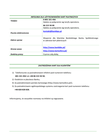 Telefon INFOLINIA DLA UŻYTKOWNIKÓW KART PŁATNICZYCH 0-801 321 456 Opłata za połączenie wg taryfy operatora. 86 215 50 00 Opłata za połączenie wg taryfy operatora. [email protected] Poczta elektroniczna Wsparcie dla klientów Beskidzkiego Banku Spółdzielczego w zakresie kart płatniczych Zakres spraw http://www.bankbbs.pl/ Strona www http://www.kartosfera.pl/ Godziny pracy Czynna całą dobę ZASTRZEŻENIA KART DLA KLIENTÓW 1) Telefonicznie za pośrednictwem Infolinii pod numerem telefonu: 801 321 456 lub +48 86 215 50 50; 2) Osobiście w placówce Banku; 4) Za pośrednictwem portalu kartowego (http://www.kartosfera.pl/); 5) Za pośrednictwem ogólnopolskiego systemu zastrzegania kart pod numerem telefonu: +48 828 828 828. Informujemy, że wszystkie rozmowy na Infolinii są nagrywane.