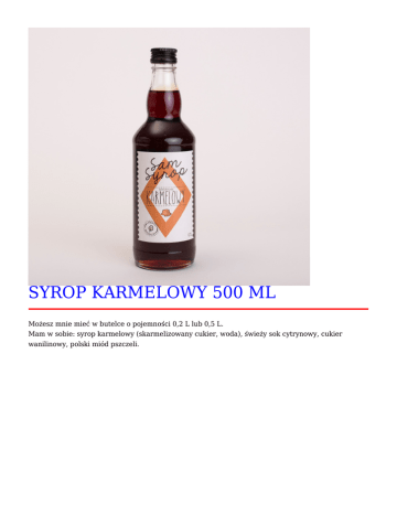 SYROP KARMELOWY 500 ML Możesz mnie mieć w butelce o pojemności 0,2 L lub 0,5 L. Mam w sobie: syrop karmelowy (skarmelizowany cukier, woda), świeży sok cytrynowy, cukier wanilinowy, polski miód pszczeli.