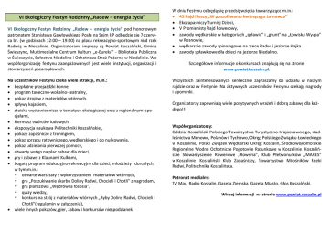 VI Ekologiczny Festyn Rodzinny „Radew – energia życia” VI Ekologiczny Festyn Rodzinny „Radew – energia życia” pod honorowym patronatem Stanisława Gawłowskiego Posła na Sejm RP odbędzie się 7 czerwca br. (w godzinach 12:00 – 19:00) na placu rekreacyjno-sportowym nad rzek Radwią w Niedalinie. Organizatorami imprezy są Powiat Koszaliński, Gmina Świeszyno, Multimedialne Centrum Kultury „e-Eureka" - Biblioteka Publiczna w Świeszynie, Sołectwo Niedalino i Ochotnicza Straż Pożarna w Niedalinie. We współorganizację festynu zaangażowanych jest wiele instytucji, organizacji i stowarzyszeń pozarządowych. Na uczestników Festynu czeka wiele atrakcji, m.in.: bezpłatne przejażdżki konne, program taneczno-wokalno-teatralny, pokaz strojów z materiałów wtórnych, spływy kajakiem, stoiska wystawiennicze o tematyce ekologicznej oraz z regionalnymi specjałami, kiermasz twórców ludowych, ekspozycja naukowa Politechniki Koszalińskiej, pokazy zapaśnicze z treningiem, pokaz sprzętu ratowniczego, wędkarskiego i do nurkowania, pokaz udzielania pierwszej pomocy, otwarty wstęp na plac zabaw dla dzieci, gry i zabawy z Klaunami Kulkami, bogaty program edukacyjno-rekreacyjny dla dzieci, młodzieży i dorosłych, w tym m.in.: otwarte warsztaty z wykorzystaniem materiałów wtórnych, gra „Poszukiwanie skarbu Doliny Radwi, Chocieli i Chotli” z nagrodami, gra planszowa „Wędrówka łososia”, quizy wiedzy, konkurs na strój z materiałów wtórnych „Ryby Doliny Radwi, Chocieli i Chotli”(regulamin w załączeniu), wiele innych pokazów, gier, zabaw i konkursów niespodzianek. W dniu Festynu odbędą się przedsięwzięcia towarzyszące m.in.: 45 Rajd Pieszy „W poszukiwaniu kwitnącego żarnowca” Ekozapaśniczy Turniej Dzieci, V Promienisty Rajd Rowerowy, zawody wędkarskie w kategoriach „spławik” i „grunt” na „Łowisku Wyspa” w Rosnowie, wędkarskie zawody spinningowe na rzece Radwi i jeziorze Hajka zawody spławikowe dla dzieci na jeziorze Niedalino. Szczegółowe informacje o konkursach znajdują się na stronie www.powiat.koszalin.pl. Wszystkich zainteresowanych serdecznie zapraszamy do udziału w naszym rajdzie oraz w Festynie. Na aktywnych uczestników Festynu czekają nagrody i upominki. Organizatorzy zapewniają wiele pozytywnych wrażeń i dobrą zabawę dla każdego!!! Współorganizatorzy: Oddział Koszaliński Polskiego Towarzystwa Turystyczno-Krajoznawczego, Nadleśnictwa Manowo, Polanów i Tychowo, Okręg Polskiego Związku Łowieckiego w Koszalinie, Polski Związek Wędkarski Okręg Koszalin, Środkowopomorskie Regionalne Wodne Ochotnicze Pogotowie Ratunkowe w Koszalinie, Koszalińskie Stowarzyszenie Rowerowe „Roweria”, Klub Płetwonurków „MARES” w Koszalinie, Koszaliński Klub Zapaśniczy, Towarzystwo Miłośników Rzeki Radwi, Politechnika Koszalińska. Patronat medialny: TV Max, Radio Koszalin, Gazeta Ziemska, Gazeta Miasto, Głos Koszaliński. Więcej informacji na stronie www.powiat.koszalin.pl INFORMACJA KRAJOZNAWCZA Zegrze Pomorskie – Nieduża popegerowska wieś w gminie Świeszyno na pograniczu Pojezierza Drawskiego i Równiny Białogardzkiej. Turystyczną atrakcję okolicy stanowi jezioro zaporowe Hajka o pow. 100,9 ha, uznane za strefę ciszy (nie można używać łodzi motorowych), chronione również w ramach obszaru Natura 2000. Powstało ono po wybudowaniu pierwszej w tej części Pomorza elektrowni wodnej Niedalino, którą wzniesiono w latach 1909-1922. Elektrownia pracuje w momencie spustu wody napędzającej turbiny w elektrowni w Rosnowie. Nazwa Hajka pochodzi od nazwiska danych młynarzy Heyków, które wyryte było na starym kamiennym moście przez Radew w Niedalinie. Po wojnie spolszczono je do dzisiejszej formy. Wieś Niedalino leży niecały kilometr na zachód od elektrowni. Początki Niedalina sięgają średniowiecza, gdy jako własność premonstrantek z Trzebiatowa zostało zapisane w dokumentach z 1227 r. Już w IX-X w. istniała tu obronna osada, której pozostałością jest niewielkie nizinne grodzisko w pobliżu Zegrza. W czasie reformacji stało się częścią włości jednej z najpotężniejszych w rejonie Koszalinie szlacheckich rodzin – von Kamecke. W Zegrzu jest: zespół dworsko-parkowy – barokowy pałac z XVIII w., który otacza park barokowy, przekomponowany w XIX na krajobrazowy. Najstarsze drzewa – dęby, graby oraz cisy liczą ok. 250 lat. Z zabudowań folwarcznych na uwagę załuguje gorzelnia oraz spichlerz. port lotniczy Koszalin – w 1953 r. na polach na wschód od Zegrza zbudowano lotnisko wojskowe dla 26. pułku myśliwskiego ze Świdwina. Lotnisko użytkowały również PLL LOT realizując połączenia pasażerskie m.in. do Warszawy. W dniu 1.06.1991 r. rozpoczął tutaj kolejną pielgrzymkę papież Jana Paweł II. Aktualnie lotnisku użytkuje Aeroklub Koszaliński. Rzeka Radew – prawobrzeżny i jednocześnie największy dopływ Parsęty ma długości 85 km i powierzchnię zlewni równą 1058 km2 co stanowi około 34% całej powierzchni zlewni Parsęty. Spadek rzeki wynosi 69 m. Ma ona bogato rozwiniętą sieć dopływów, a jej górne odcinki znajdują się na terenach wodonośnych, z których pobierana jest woda pitna studniami głębinowymi dla miasta Koszalina. Jako początek Radwi przyjmuje się jej wypływ z jeziora Kwiecko. Radew uchodzi do Parsęty w Karlinie trzema odnogami. Radew stanowi szlak turystyki kajakowej (trudny w górnym i środkowym biegu – głazy, szypoty). Dolina rzeki została objęta obszarem chronionego krajobrazu "Dolina Radwi" oraz obszarem sieci Natura 2000 – Dolina Radwi, Chocieli i Chotli. Nazwę Radew wprowadzono urzędowo w 1948 roku, zmieniając poprzednią niemiecką nazwę rzeki – Radüe. Dolina Radwi – obszar chronionego krajobrazu o powierzchni 3560 ha w woj. zachodniopomorskim, w powiecie koszalińskim. Został utworzony w 1975 roku. Obejmuje obszar doliny rzeki Radwi oraz Jeziora Rosnowskiego. Teren OChK "Doli