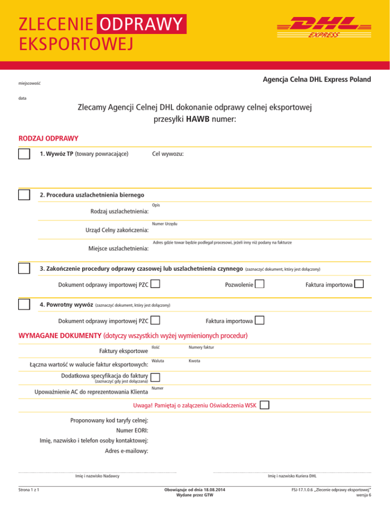 ZLECENIE ODPRAWY EKSPORTOWEJ Agencja Celna DHL Express Poland miejscowość data Zlecamy Agencji Celnej DHL dokonanie odprawy celnej eksportowej przesyłki HAWB numer: RODZAJ ODPRAWY 1. Wywóz TP (towary powracające) Cel wywozu: 2. Procedura uszlachetnienia biernego Opis Rodzaj uszlachetnienia: Numer Urzędu Urząd Celny zakończenia: Adres gdzie towar będzie podlegał procesowi, jeżeli inny niż podany na fakturze Miejsce uszlachetnienia: 3. Zakończenie procedury odprawy czasowej lub uszlachetnienia czynnego Dokument odprawy importowej PZC 4. Powrotny wywóz (zaznaczyć dokument, który jest dołączony) Pozwolenie Faktura importowa (zaznaczyć dokument, który jest dołączony) Dokument odprawy importowej PZC Faktura importowa WYMAGANE DOKUMENTY (dotyczy wszystkich wyżej wymienionych procedur) Faktury eksportowe Łączna wartość w walucie faktur eksportowych: Ilość Numery faktur Waluta Kwota Dodatkowa specyfikacja do faktury (zaznaczyć gdy jest dołączana) Upoważnienie AC do reprezentowania Klienta Numer Uwaga! Pamiętaj o załączeniu Oświadczenia WSK Proponowany kod taryfy celnej: Numer EORI: Imię, nazwisko i telefon osoby kontaktowej: Adres e-mailowy: Imię i nazwisko Nadawcy Strona 1 z 1 Imię i nazwisko Kuriera DHL Obowiązuje od dnia 18.08.2014 Wydane przez GTW FSJ-17.1.0.6 „Zlecenie odprawy eksportowej” wersja 6