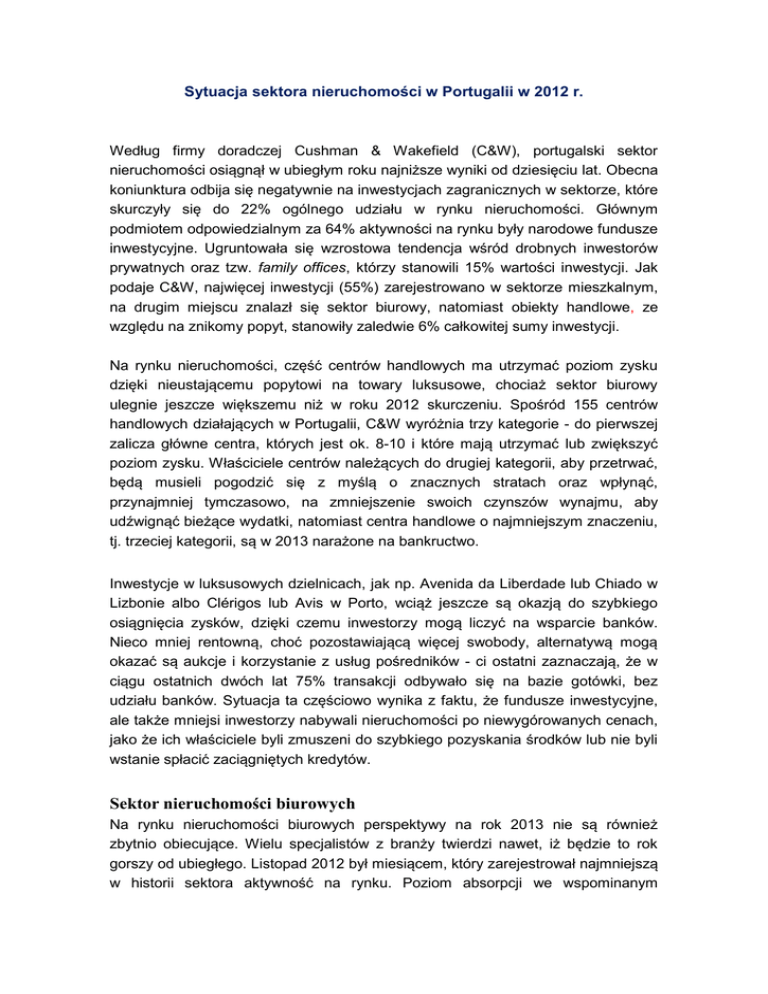 Sytuacja sektora nieruchomości w Portugalii w 2012 r. Według firmy doradczej Cushman & Wakefield (C&W), portugalski sektor nieruchomości osiągnął w ubiegłym roku najniższe wyniki od dziesięciu lat. Obecna koniunktura odbija się negatywnie na inwestycjach zagranicznych w sektorze, które skurczyły się do 22% ogólnego udziału w rynku nieruchomości. Głównym podmiotem odpowiedzialnym za 64% aktywności na rynku były narodowe fundusze inwestycyjne. Ugruntowała się wzrostowa tendencja wśród drobnych inwestorów prywatnych oraz tzw. family offices, którzy stanowili 15% wartości inwestycji. Jak podaje C&W, najwięcej inwestycji (55%) zarejestrowano w sektorze mieszkalnym, na drugim miejscu znalazł się sektor biurowy, natomiast obiekty handlowe, ze względu na znikomy popyt, stanowiły zaledwie 6% całkowitej sumy inwestycji. Na rynku nieruchomości, część centrów handlowych ma utrzymać poziom zysku dzięki nieustającemu popytowi na towary luksusowe, chociaż sektor biurowy ulegnie jeszcze większemu niż w roku 2012 skurczeniu. Spośród 155 centrów handlowych działających w Portugalii, C&W wyróżnia trzy kategorie - do pierwszej zalicza główne centra, których jest ok. 8-10 i które mają utrzymać lub zwiększyć poziom zysku. Właściciele centrów należących do drugiej kategorii, aby przetrwać, będą musieli pogodzić się z myślą o znacznych stratach oraz wpłynąć, przynajmniej tymczasowo, na zmniejszenie swoich czynszów wynajmu, aby udźwignąć bieżące wydatki, natomiast centra handlowe o najmniejszym znaczeniu, tj. trzeciej kategorii, są w 2013 narażone na bankructwo. Inwestycje w luksusowych dzielnicach, jak np. Avenida da Liberdade lub Chiado w Lizbonie albo Clérigos lub Avis w Porto, wciąż jeszcze są okazją do szybkiego osiągnięcia zysków, dzięki czemu inwestorzy mogą liczyć na wsparcie banków. Nieco mniej rentowną, choć pozostawiającą więcej swobody, alternatywą mogą okazać są aukcje i korzystanie z usług pośredników - ci ostatni zaznaczają, że w ciągu ostatnich dwóch lat 75% transakcji odbywało się na bazie gotówki, bez udziału banków. Sytuacja ta częściowo wynika z faktu, że fundusze inwestycyjne, ale także mniejsi inwestorzy nabywali nieruchomości po niewygórowanych cenach, jako że ich właściciele byli zmuszeni do szybkiego pozyskania środków lub nie byli wstanie spłacić zaciągniętych kredytów. Sektor nieruchomości biurowych Na rynku nieruchomości biurowych perspektywy na rok 2013 nie są również zbytnio obiecujące. Wielu specjalistów z branży twierdzi nawet, iż będzie to rok gorszy od ubiegłego. Listopad 2012 był miesiącem, który zarejestrował najmniejszą w historii sektora aktywność na rynku. Poziom absorpcji we wspominanym miesiącu (popyt netto, pokazujący ile faktycznie powierzchni biurowej zostało wchłoniętej przez rynek) wyniósł 2000 m2, podczas gdy w grudniu był niewiele większy. Na przestrzeni roku można natomiast mówić o 100.000 m2. Również rok 2011 nie przyniósł dobrych wyników, osiągając poziom 107.000 m2. Sektor nieruchomości mieszkaniowych Ze względu na stałe pogłębianie się kryzysu, między 2010 i końcem 2012 r. ilość operacji kupna i sprzedaży mieszkań/domów w Portugalii spadła o 60%. W 2010 większa część z ok. 142 tys. operacji kupna i sprzedaży odbywała się na zasadzie umów hipotecznych między bankiem a nabywcami. Szacuje się, że w ubiegłym roku zarejestrowano zaledwie 53 tys. operacji kupna i sprzedaży. Największy spadek jest widoczny w przypadku umów o kredyt hipoteczny – z 76.075 w 2010r. do 35.134 w 2011 r., natomiast mniej gwałtowne tempo zmian odnotowywane jest w zakresie kupna i sprzedaży w transakcjach natychmiastowych, co wskazuje na istnienie klasy przedsiębiorców, którzy mogą pozwolić sobie na podobne inwestycje nawet w dobie głębokiego kryzysu. Pozytywnym zjawiskiem jest fakt, iż w ostatnim czasie banki zaczynają zmieniać podejście wydłużając okres spłacania rat i dostosowując oprocentowanie do możliwości finansowych klientów. Pomimo kryzysu w sektorze, zaniku inwestycji w nowe budynki mieszkalne (w ubiegłym roku w Portugalii powstało zaledwie 11 tys. obiektów mieszkalnych) i spadku sprzedaży domów na rynku pierwotnym oraz wtórnym, rzędu 25 - 30%, na rynku można zaobserwować nowe tendencje, tj. zjawisko, że ciężar w sektorze nieruchomości przenosi się coraz bardziej w stronę wynajmu, głównie za sprawą nowego prawa, które zapewnia najemcom liczne udogodnienia. Według pośredników nieruchomości sektor najmu w Lizbonie i Porto zanotował w ubiegłym roku wzrost rzędu 40%, podczas gdy jeszcze w 2008 jego obecność na rynku była prawie niezauważalna. Nowe prawo najmu komplikuje sytuację drobnych właścicieli sklepów Nowe prawo najmu w Portugalii, które weszło w życie z dniem 12 listopada 2012 r. wydaje się nie sprzyjać najmującym powierzchnie handlowe, zwłaszcza prowadzącym mały i tradycyjny handel. Ceny najmu brutalnie wzrosły, w niektórych przypadkach, nawet o 300 - 400%, a jak twierdzi prezes Stowarzyszenia Kupców Miasta Porto (Associação dos Comerciantes do Porto), Nuno Camilo, wśród wynajmujących obserwuje się panujące złudzenie szybkiej możliwości wzbogacenia na zwiększeniach wynajmów, na co zezwala obecne prawo. W mniemaniu Camilo długotrwałe utrzymanie wymaganych cen wynajmu jest po prostu niemożliwe, albo doprowadzi do katastrofalnych skutków i zaniknięcia setek przedsiębiorstw. Od momentu wejścia ww. prawa w życie, stowarzyszenie zarejestrowało 60 wniosków o pomoc prawną, natomiast działający w Lizbonie Związek Stowarzyszeń Sektora Handlu i Usług (União de Associações do Comércio e Serviços) potwierdza identyczną sytuację, opisując, iż 50% wniosków o pomoc wpływa ze strony handlowców płacących niższe czynsze i prowadzących rodzinne sklepy przekazywane z pokolenia na pokolenie, pod