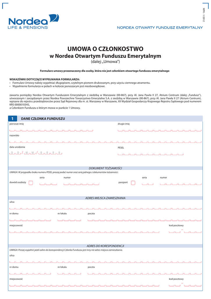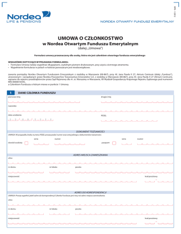 WPK - 1/2012 UMOWA O CZŁONKOSTWO w Nordea Otwartym Funduszu Emerytalnym (dalej: „Umowa”) Formularz umowy przeznaczony dla osoby, która nie jest członkiem otwartego funduszu emerytalnego WSKAZÓWKI DOTYCZĄCE WYPEŁNIANIA FORMULARZA: • Formularz Umowy należy wypełniać długopisem, czytelnym pismem drukowanym, przy użyciu ciemnego atramentu. • Wypełnienie formularza w polach w kolorze jasnoszarym jest nieobowiązkowe. zawarta pomiędzy Nordea Otwartym Funduszem Emerytalnym z siedzibą w Warszawie (00-867), przy Al. Jana Pawła II 27, Atrium Centrum (dalej: „Fundusz”), utworzonym i zarządzanym przez Nordea Powszechne Towarzystwo Emerytalne S.A. z siedzibą w Warszawie (00-867), przy Al. Jana Pawła II 27 (Atrium Centrum), wpisane do rejestru przedsiębiorców przez Sąd Rejonowy dla m. st. Warszawy w Warszawie, XII Wydział Gospodarczy Krajowego Rejestru Sądowego pod numerem KRS 0000010345, a Członkiem Funduszu o którym mowa w punkcie 1 Umowy. 1 DANE CZŁONKA FUNDUSZU pierwsze imię drugie imię nazwisko data urodzenia d d PESEL m m r r r r DOKUMENT TOŻSAMOŚCI UWAGA: W przypadku braku numeru PESEL proszę podać numer oraz serię jednego z dokumentów tożsamości. seria seria numer numer paszport dowód osobisty ADRES MIEJSCA ZAMIESZKANIA ulica nr domu nr lokalu poczta miejscowość kod pocztowy ADRES DO KORESPONDENCJI UWAGA: Proszę wypełnić jeżeli adres do korespondencji Członka Funduszu jest inny niż adres miejsca zamieszkania. ulica nr domu miejscowość nr lokalu poczta kod pocztowy 2 DANE KONTAKTOWE telefon telefon komórkowy adres e-mail 3 OŚWIADCZENIE O TRYBIE I FORMIE PRZESYŁANIA INFORMACJI O ŚRODKACH NA RACHUNKU orespondencję zawierającą informację o stanie środków na Rachunku, o której mowa w art. 191 ust. 1 i art. 192 ust. 1 Ustawy z dnia 28 sierpnia 1997 r. o organizacji i funkcjonowaniu K funduszy emerytalnych (t.j. Dz. U. z 2010r. Nr 34, poz. 189 z późn. zm.) zwanej dalej Ustawą o OFE, chcę otrzymywać w formie: UWAGA: Proszę zaznaczyć tylko jedną opcję. zwykłej przesyłki listowej, na podany przeze mnie adres korespondencyjny elektronicznej, na podany przeze mnie adres e-mail 4 OŚWIADCZENIE O STOSUNKACH MAJĄTKOWYCH CZŁONKA FUNDUSZU a)Oświadczam, że pozostaję w związku małżeńskim. TAK NIE TAK NIE * Jeżeli TAK, to: b)Oświadczam, że pozostaję w ustawowej wspólności majątkowej. 5 * Jeżeli NIE, do Umowy należy załączyć odpis stosownego wyroku sądowego albo kopię umowy ograniczającej lub wyłączającej wspólność majątkową. OSOBY UPOSAŻONE UWAGA:W przypadku wskazania przez Członka Funduszu więcej niż trzech Osób Uposażonych, należy wypełnić dodatkowy, udostępniony przez Fundusz formularz stanowiący załącznik do Umowy. Suma oznaczonych procentowo udziałów Osób Uposażonych powinna wynosić 100%. Jako Osobę Uposażoną na rzecz której, w razie śmierci Członka Funduszu, ma nastąpić, na warunkach określonych w Statucie, wypłata środków zgromadzonych na Rachunku i niewykorzystanych zgodnie z odrębnymi przepisami, Członek Funduszu wskazuje: UPOSAŻONY 1 imię udział w środkach % nazwisko data urodzenia d d m m r r r r ADRES MIEJSCA ZAMIESZKANIA UPOSAŻONEGO ulica nr domu nr lokalu poczta miejscowość kod pocztowy UPOSAŻONY 2 imię udział w środkach % nazwisko data urodzenia d d m m r r r r ADRES MIEJSCA ZAMIESZKANIA UPOSAŻONEGO ulica nr domu miejscowość nr lokalu poczta kod pocztowy 5 OSOBY UPOSAŻONE UPOSAŻONY 3 imię udział w środkach % nazwisko data urodzenia d d m m r r r r ADRES MIEJSCA ZAMIESZKANIA UPOSAŻONEGO ulica nr domu nr lokalu miejscowość 6 poczta kod pocztowy INFORMACJE DLA CZŁONKA FUNDUSZU Informacja o skutkach niezłożenia dyspozycji w zakresie wskazania Osób Uposażonych. W przypadku gdy Członek Funduszu nie wskaże jednej lub więcej Osób Uposażonych, na rzecz których ma nastąpić, po jego śmierci, wypłata środków zgromadzonych na rachunku Członka Funduszu, na który wpłacane są składki na poczet członkostwa w Funduszu oraz przekazywane wypłaty transferowe (dalej: „Rachunek”), niewykorzystanych zgodnie z art. 131 Ustawy o OFE, czyli nieprzekazanych na rachunek współmałżonka w zakresie, w jakim środki te stanowiły przedmiot małżeńskiej wspólności majątkowej, środki zgromadzone na Rachunku zostaną rozdysponowane zgodnie z art. 132 Ustawy o OFE, tj. wchodzą w skład spadku. Informacja o przetwarzaniu danych osobowych. Administratorem danych osobowych przekazywanych przez Członka Funduszu, przetwarzanych w celu zawarcia i wykonania Umowy, w rozumieniu Ustawy z dnia 29 sierpnia 1997r. o ochronie danych osobowych (t.j. Dz. U. z 2002r. Nr 101, poz. 926 z późn. zm.), dalej zwanej Ustawą o ochronie danych osobowych, jest Nordea Otwarty Fundusz Emerytalny z siedzibą w Warszawie (00-867), Al. Jana Pawła II 27 (Atrium Centrum), zarządzany przez Nordea Powszechne Towarzystwo Emerytalne S.A. z siedzibą w Warszawie (00-867), Al. Jana Pawła II 27 (Atrium Centrum). Członkowi Funduszu przysługuje prawo dostępu do treści danych osobowych i prawo ich poprawiania, a także prawo pisemnego żądania zaprzestania przetwarzania danych oraz wniesienia sprzeciwu wobec przetwarzania danych osobowych, w przypadkach wskazanych w Ustawie o ochronie danych osobowych. Członek Funduszu może wyrazić zgodę na udostępnienie jego danych osobowych przez Administratora danych następującym podmiotom: Nordea Polska Towarzystwo Ubezpieczeń na Życie S.A. z siedzibą w Warszawie (00-867), Al. Jana Pawła II 27 (Atrium Centrum), Nordea Powszechne Towarzystwo Emerytalne S.A. z siedzibą w Warszawie (00-867), Al. Jana Pawła II 27 (Atrium Centrum), Nordea Bank Polska S.A. z siedzibą w Gdyni (81-303), ul. Kielecka 2, Nordea Usługi Finansowe Sp. z o.o. z siedzibą w Warszawie (00-867), Al. Jana Pawła II 27 (Atrium Centrum), Nordea Finance Polska S.A z siedzibą w Warszawie (00-854), Al. Jana Pawła II 25, Nordea Investment Management 